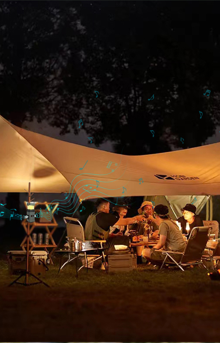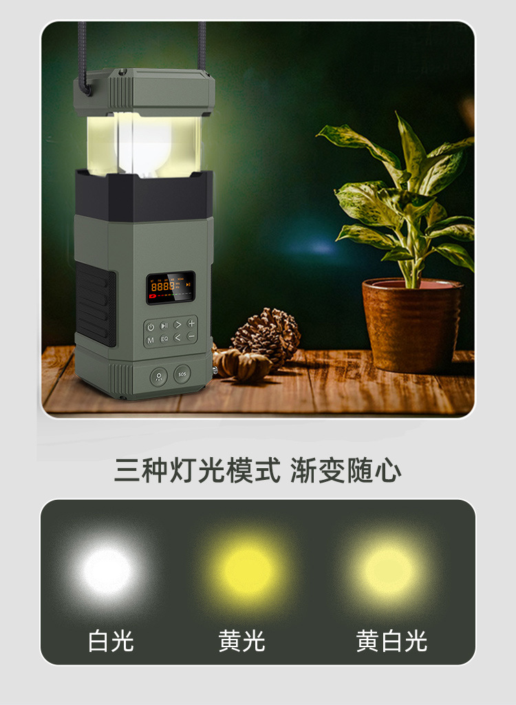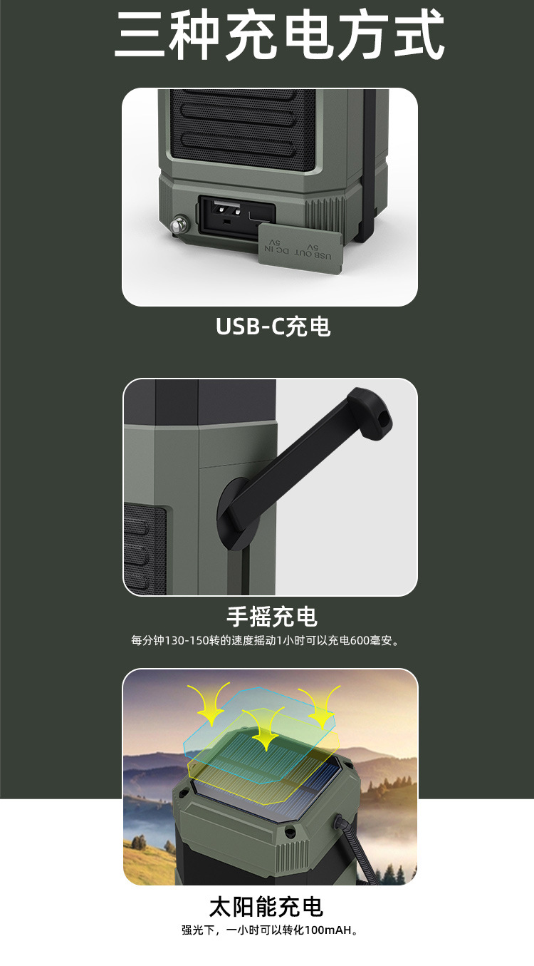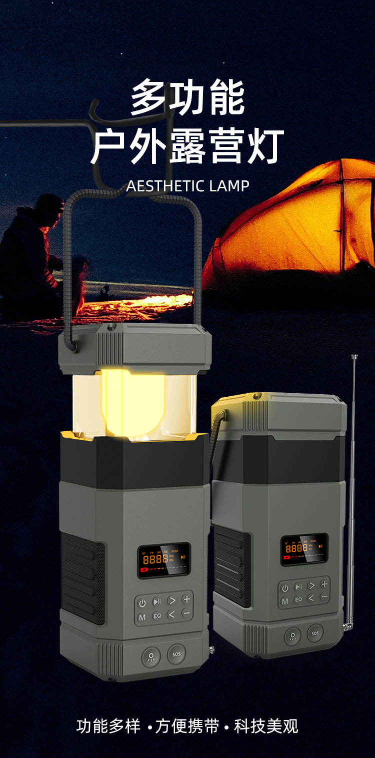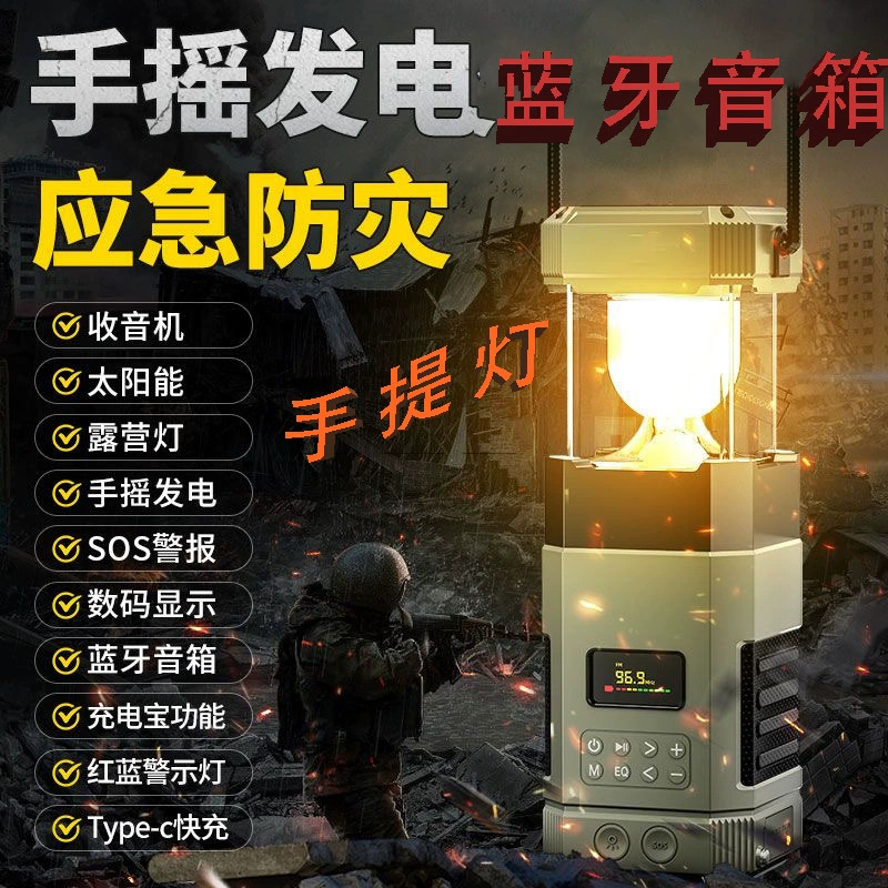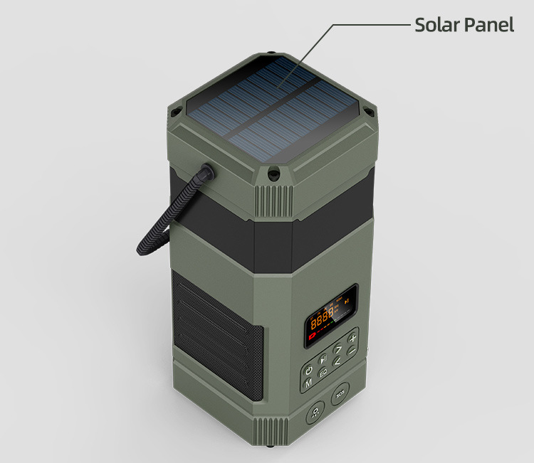 | Bluetooth Version: | Bluetooth V5.3 | Main selling points: • Bluetooth function/dual speakers • Tent lamp function (3 light sttings) • Hand-crank generator • Solar charging • Auto-scan radio function • 5000 mAh large capacity battery for charging mobile devices • Flashlight function • SOS alarm • Power protection • IPX5 waterproof and dustproof |