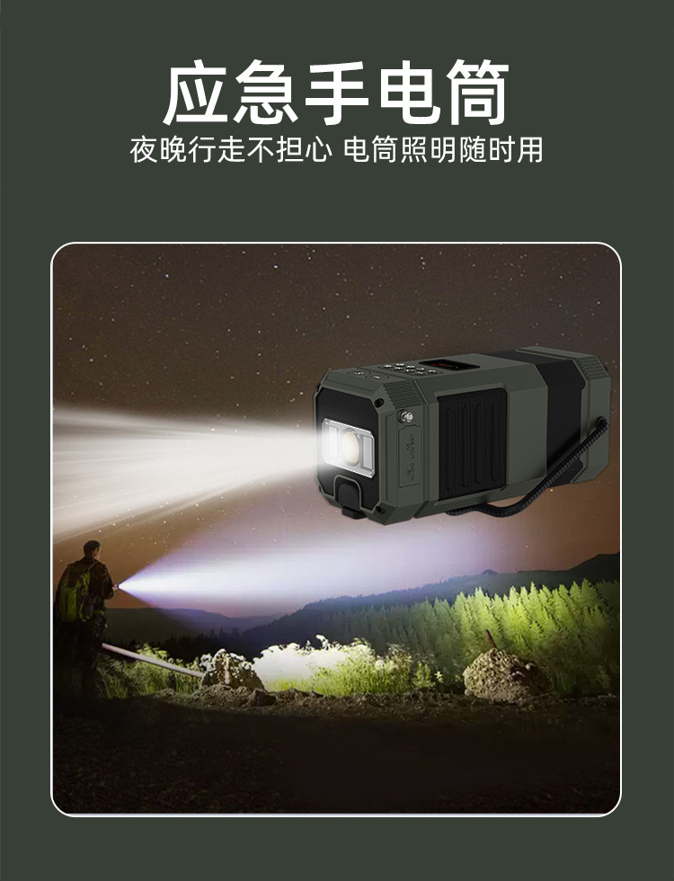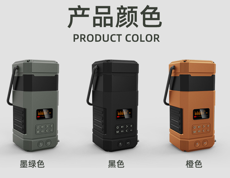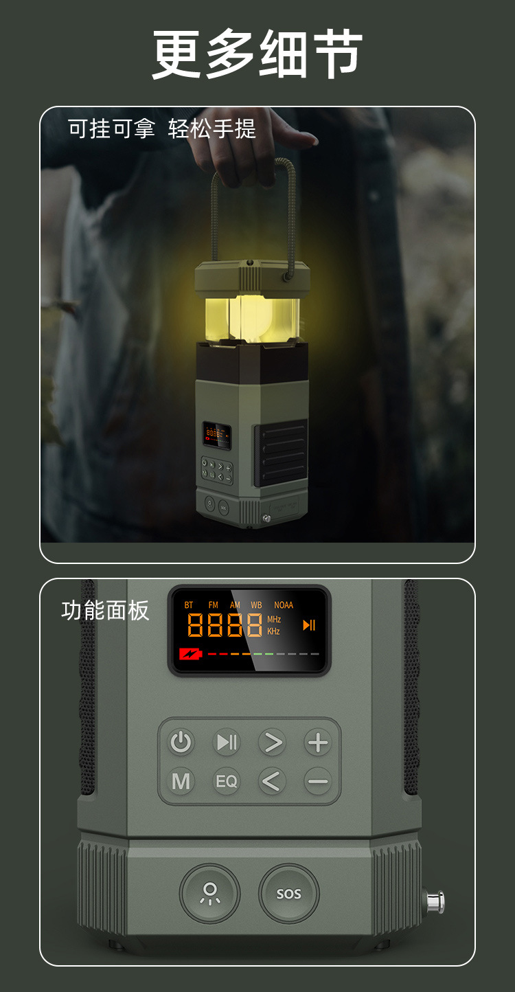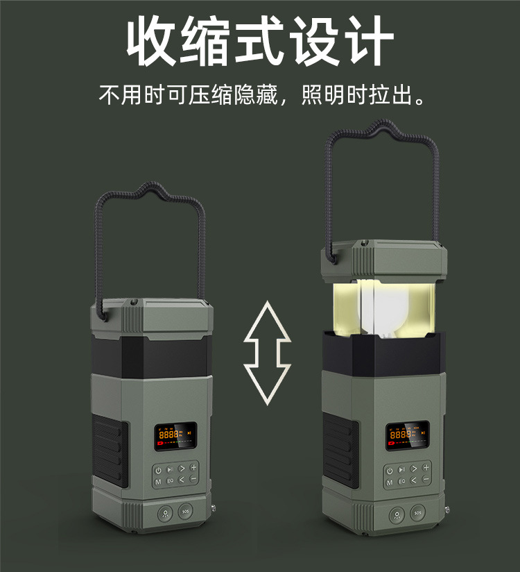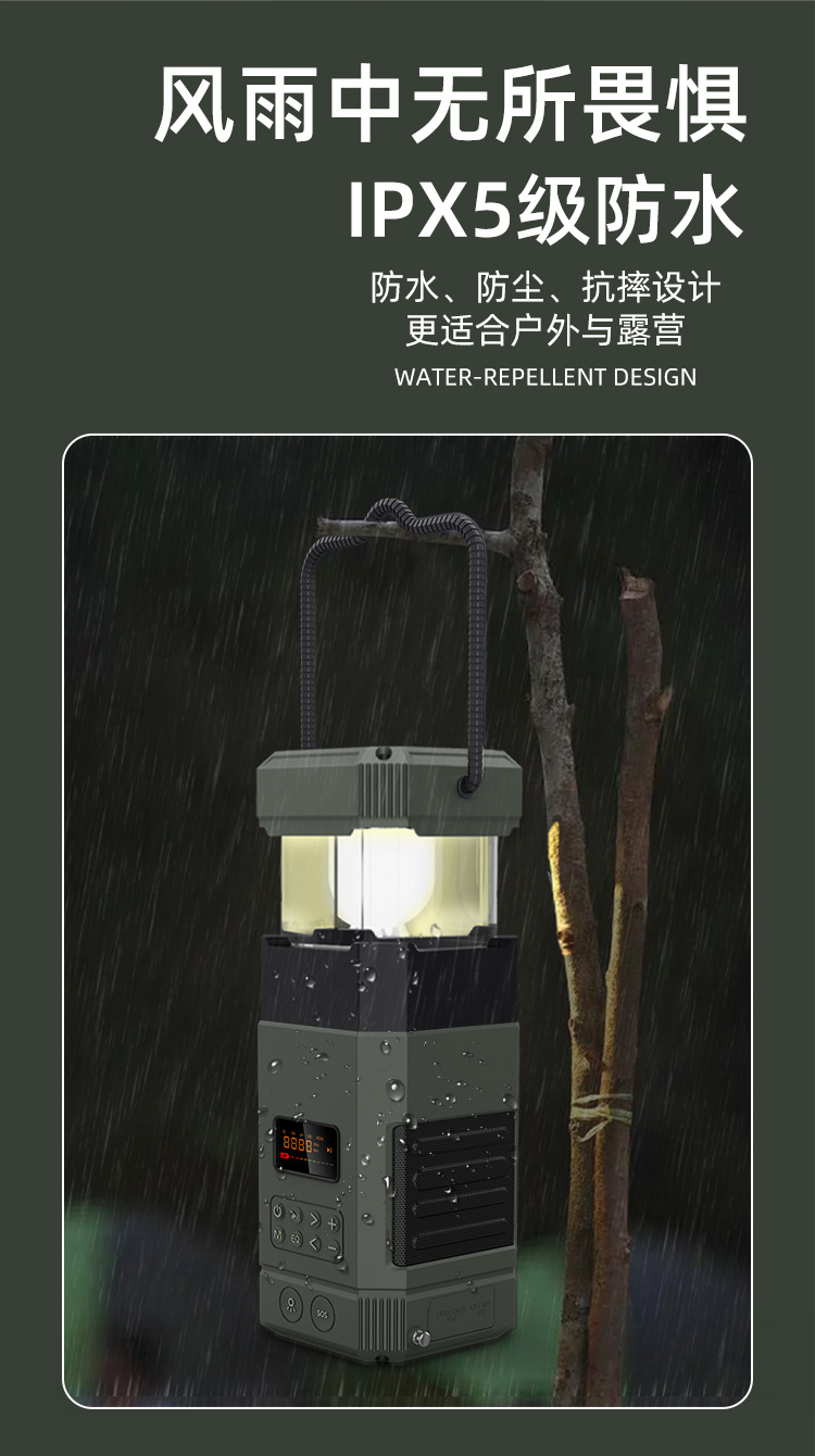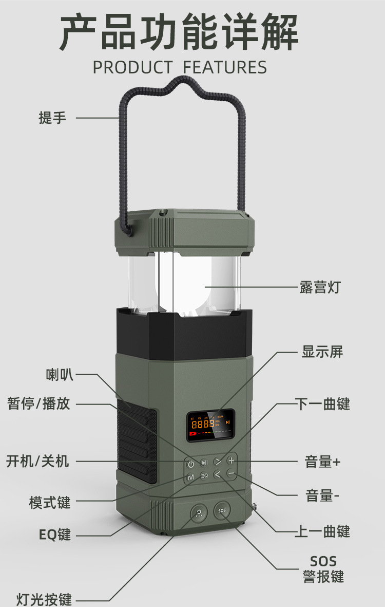 | Bluetooth Version: | Bluetooth V5.3 | Main selling points: • Bluetooth function/dual speakers • Tent lamp function (3 light sttings) • Hand-crank generator • Solar charging • Auto-scan radio function • 5000 mAh large capacity battery for charging mobile devices • Flashlight function • SOS alarm • Power protection • IPX5 waterproof and dustproof |
