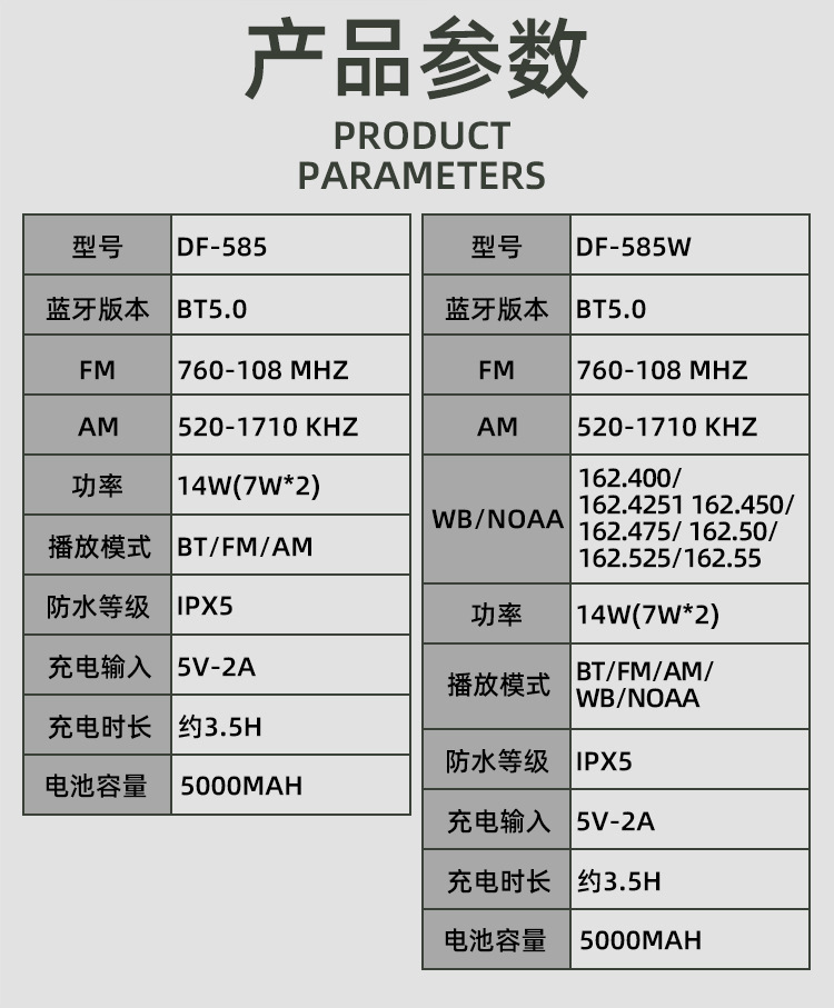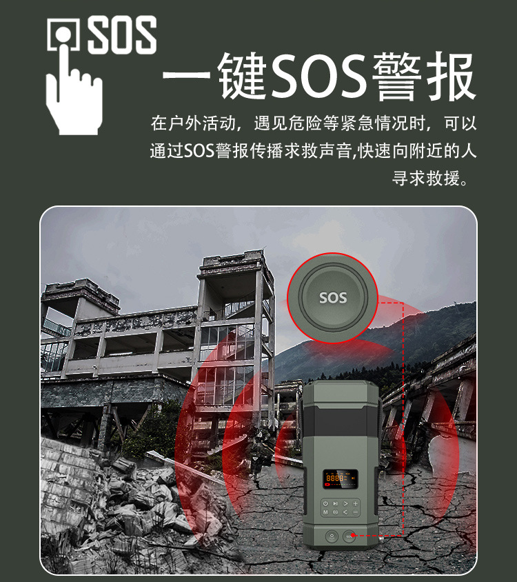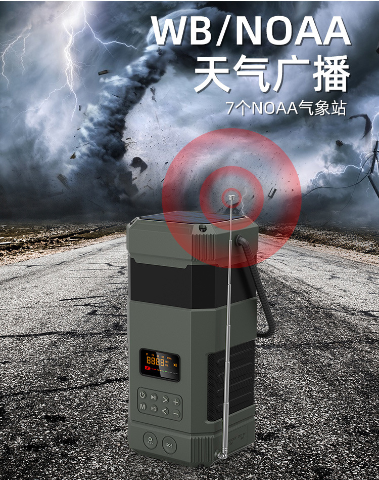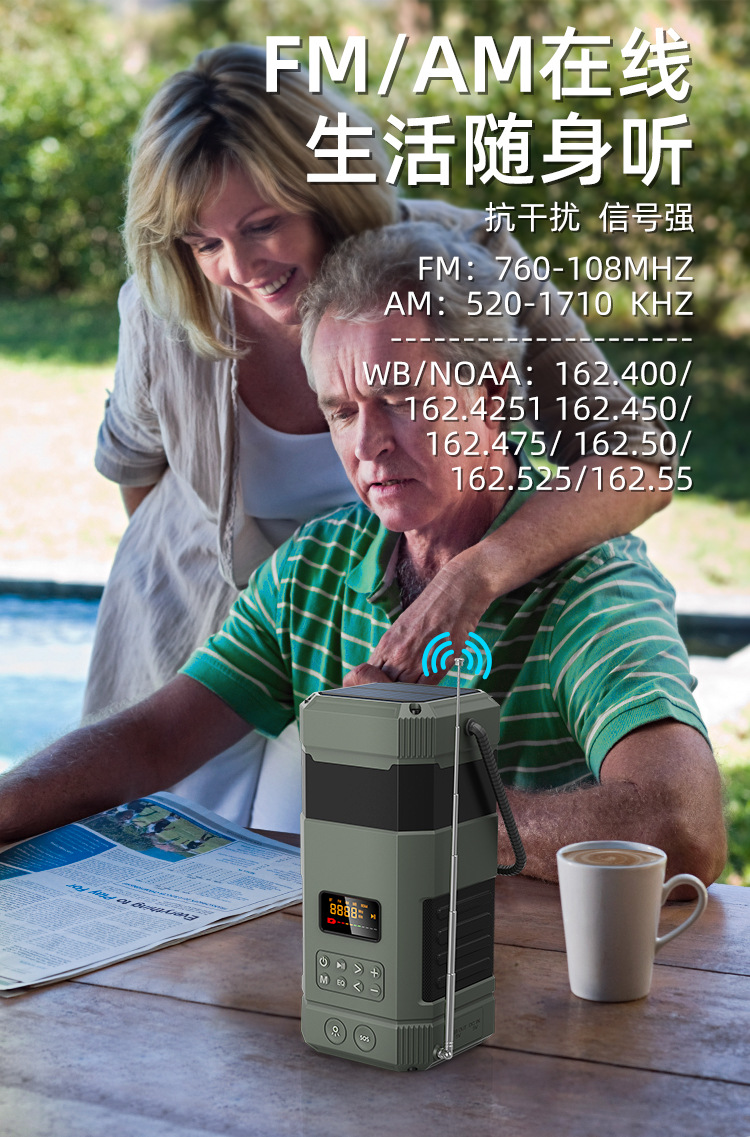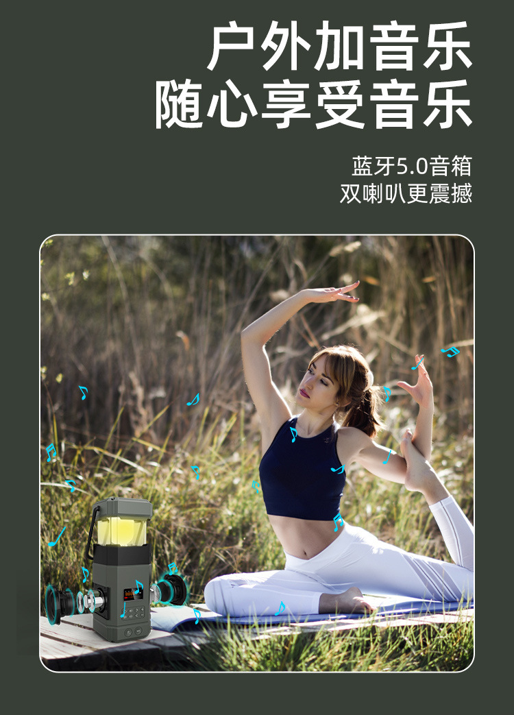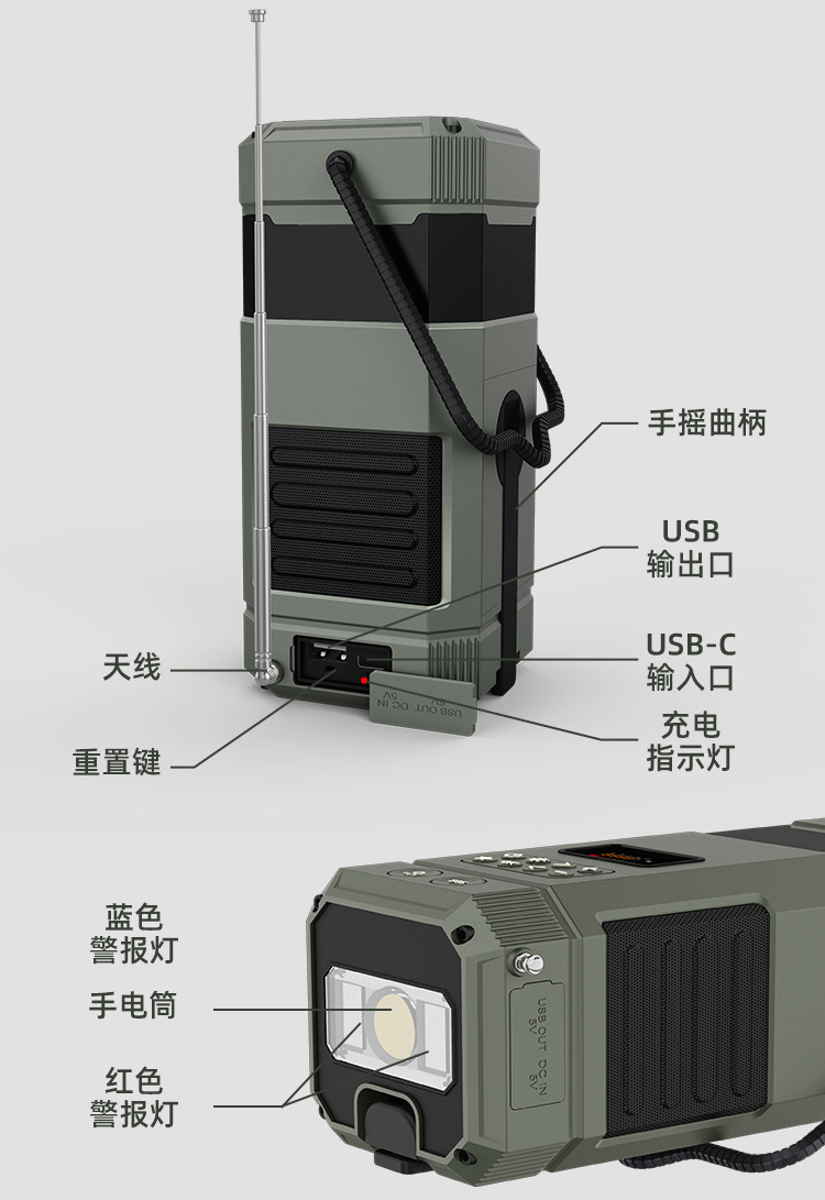 | Bluetooth Version: | Bluetooth V5.3 | Main selling points: • Bluetooth function/dual speakers • Tent lamp function (3 light sttings) • Hand-crank generator • Solar charging • Auto-scan radio function • 5000 mAh large capacity battery for charging mobile devices • Flashlight function • SOS alarm • Power protection • IPX5 waterproof and dustproof |