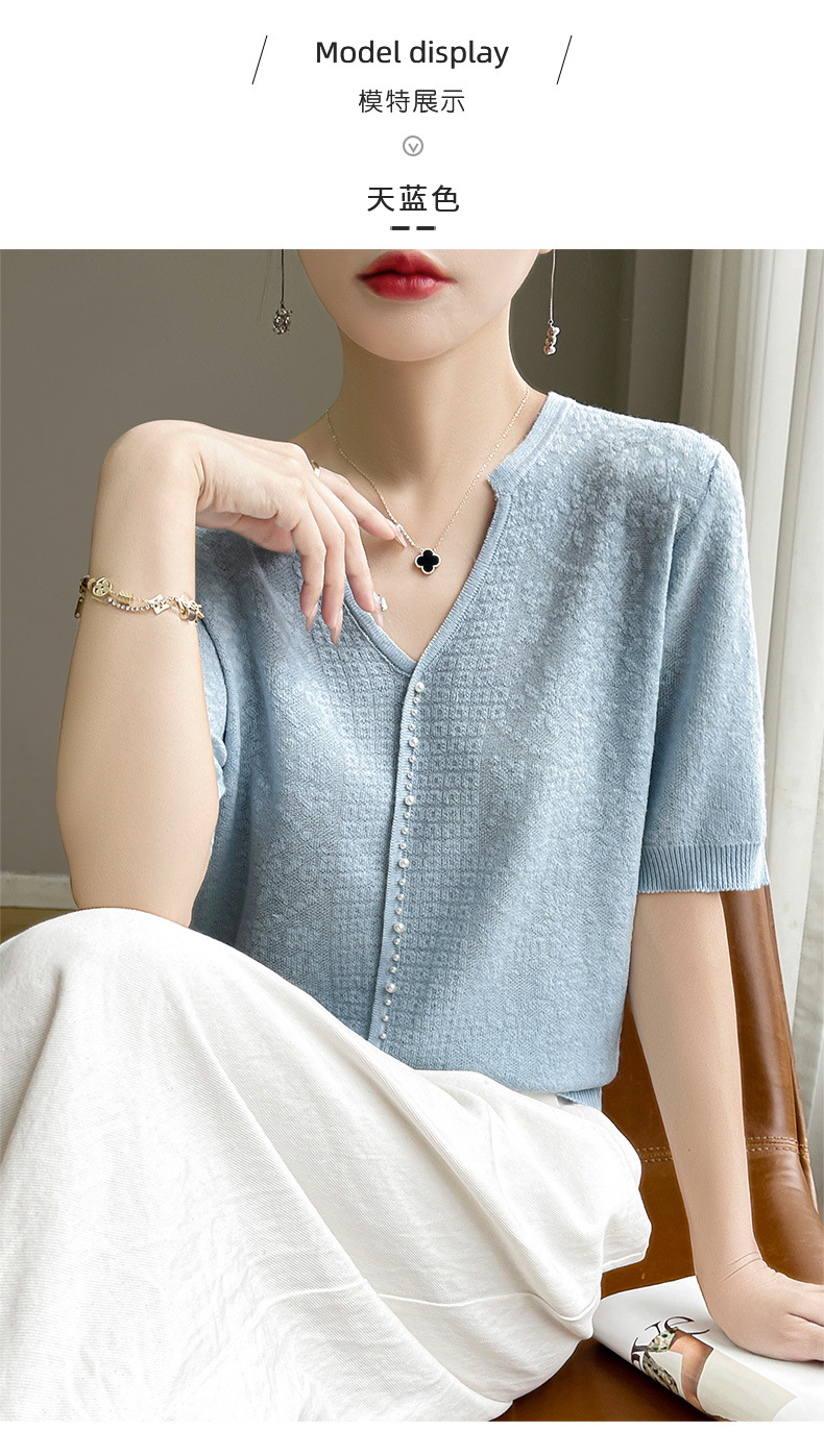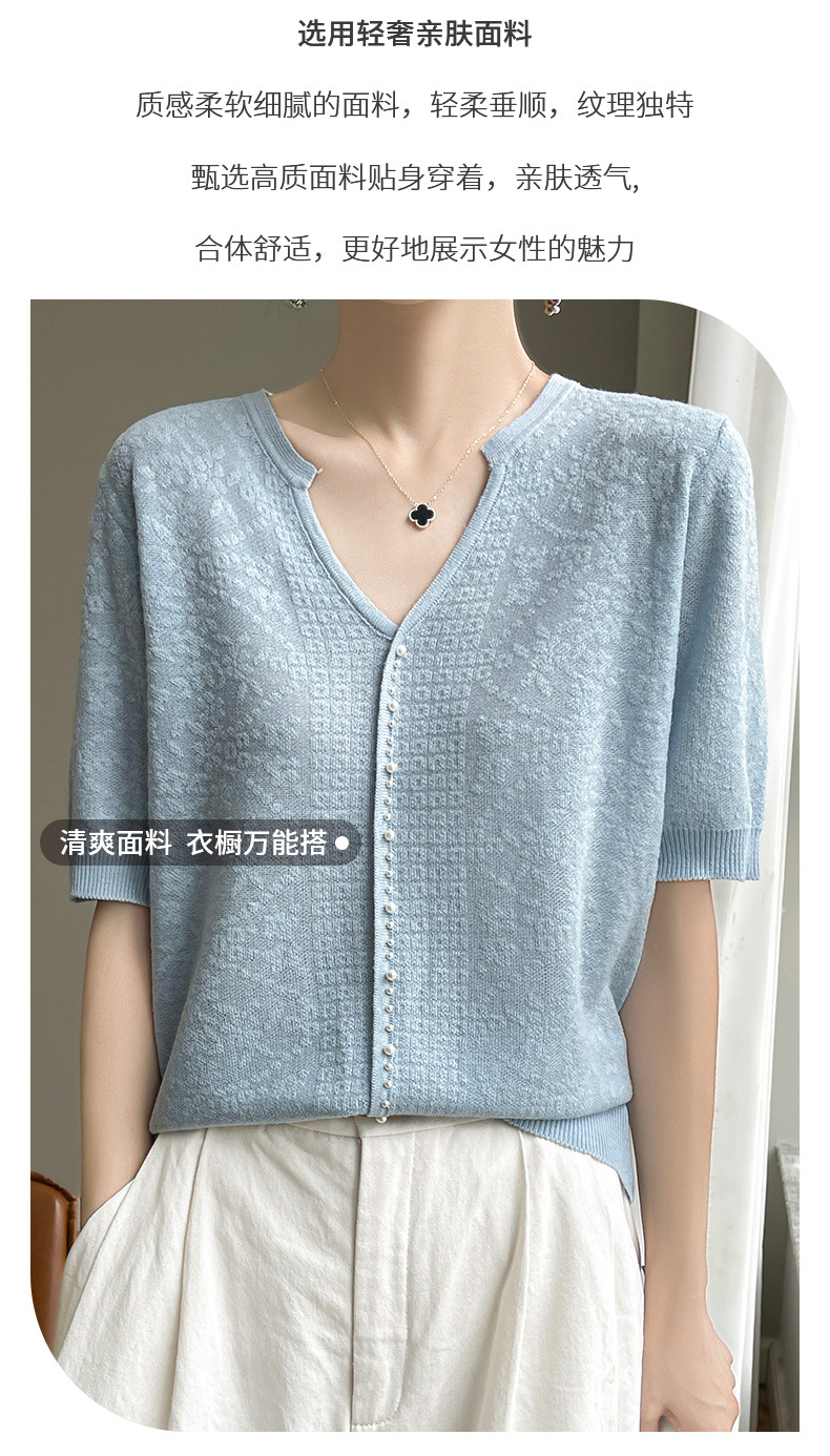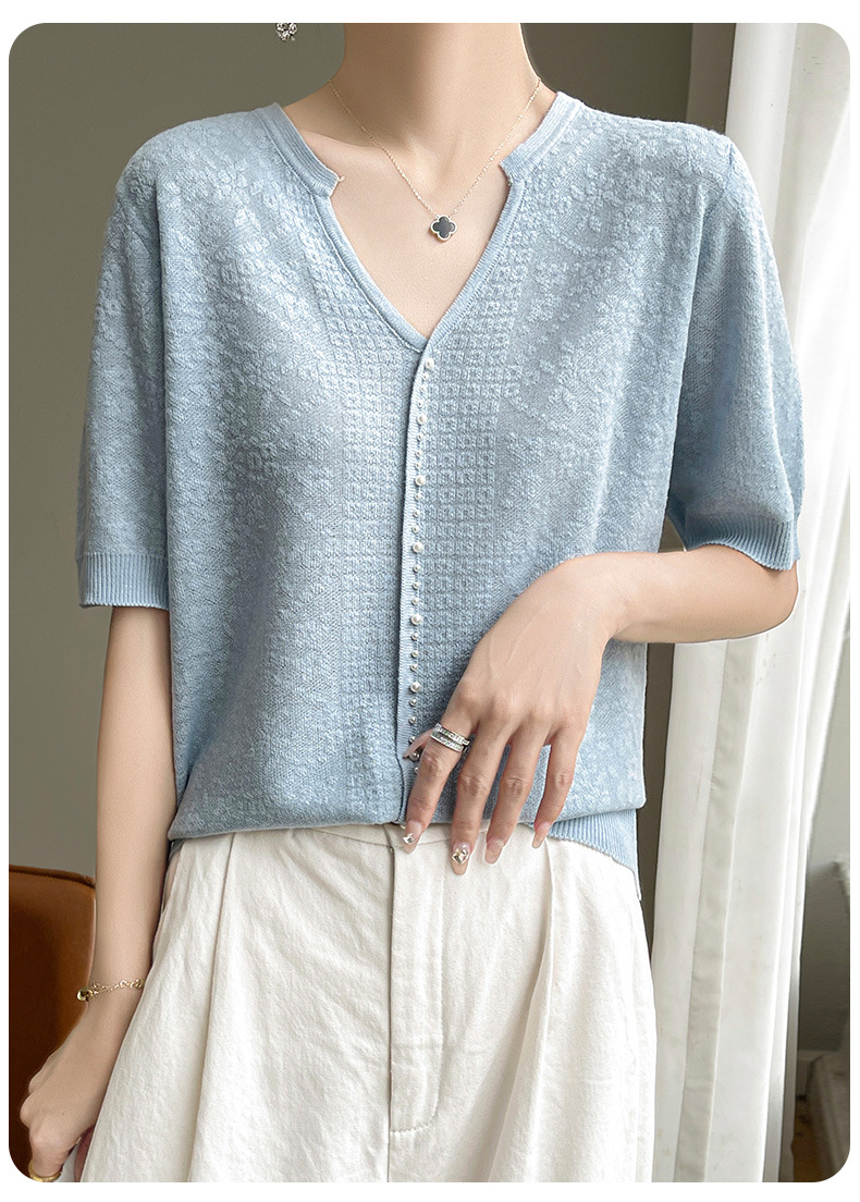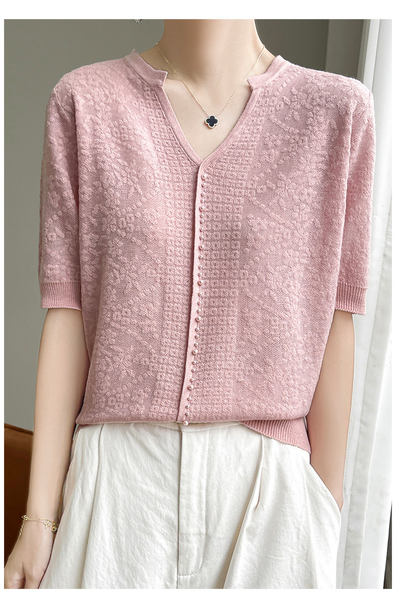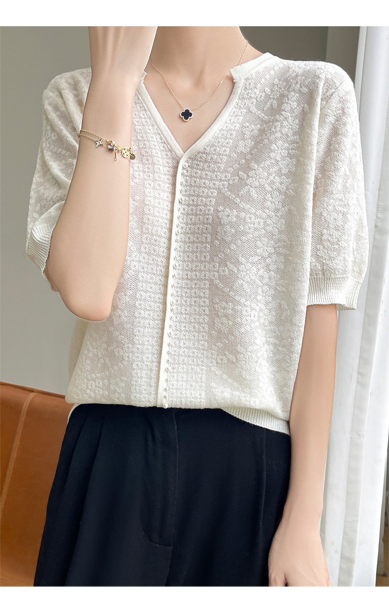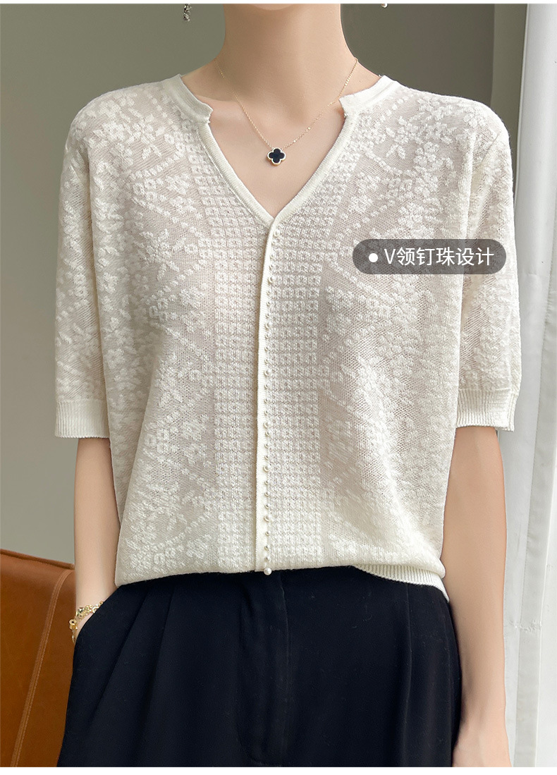 여름 새로운 반팔 티셔츠 중국 스타일 국가 스타일 텐셀 뽕나무 실크 블렌드 중공 크로 셰 탑 V 넥 구슬 니트스토어 가기