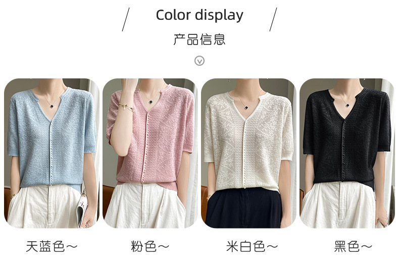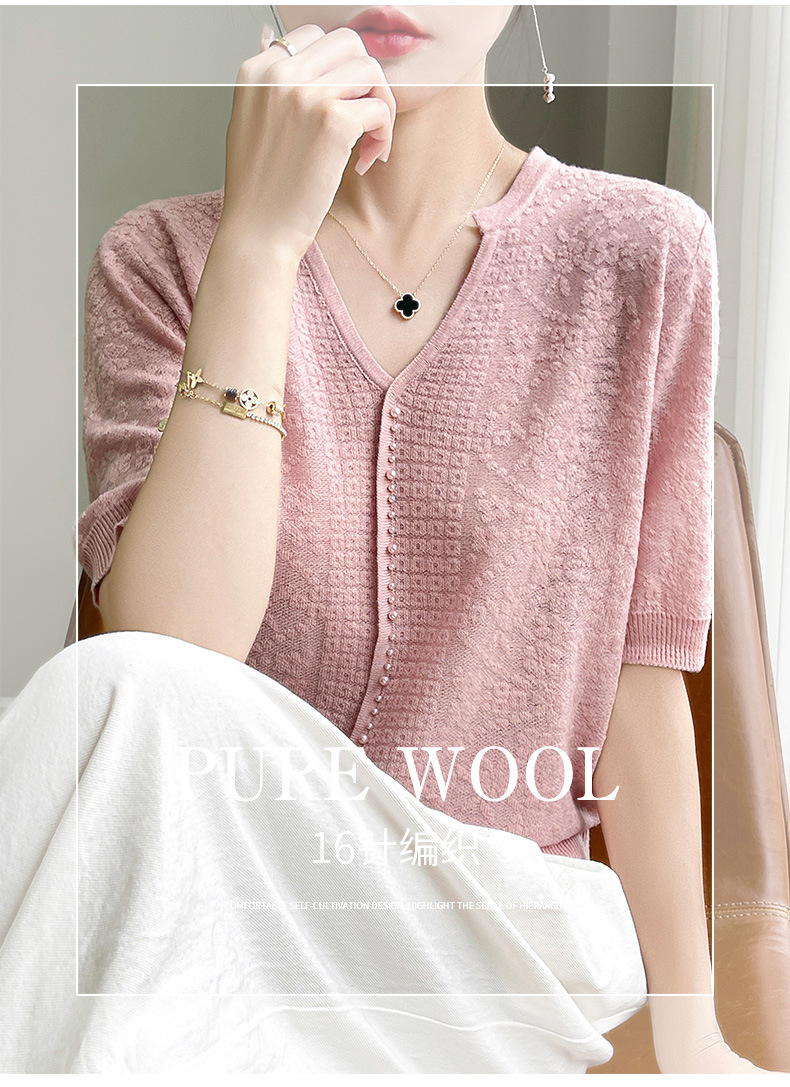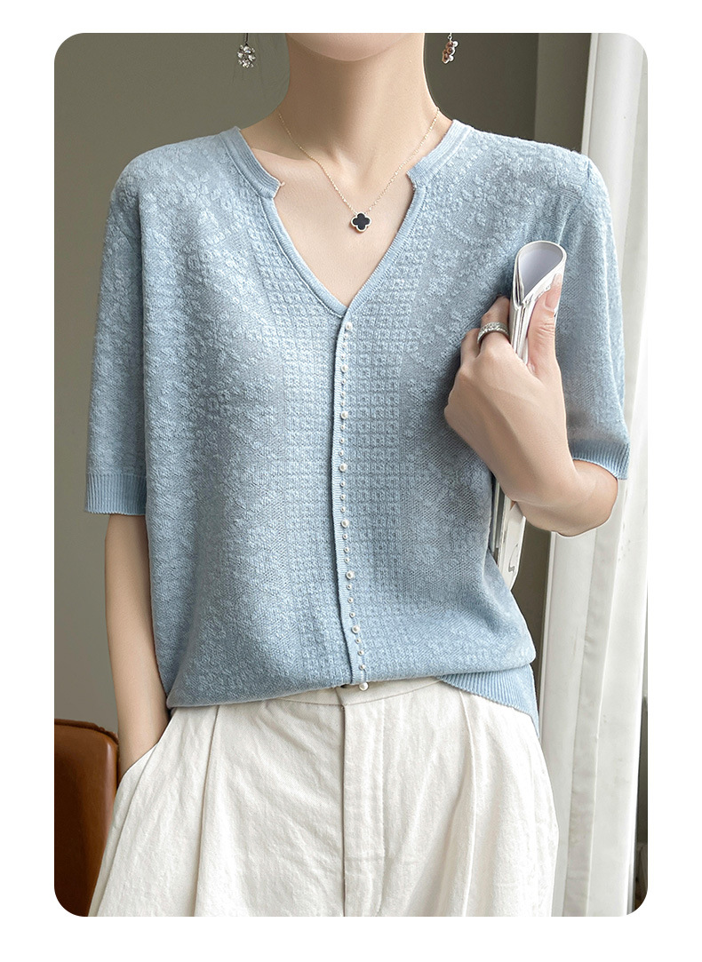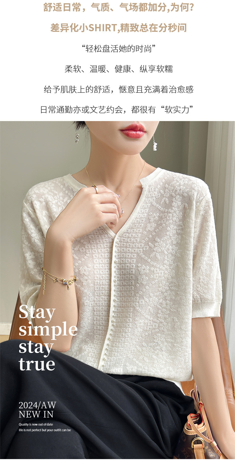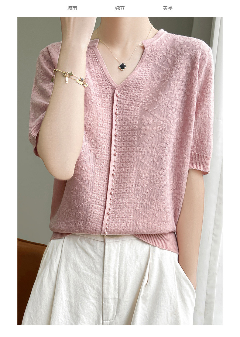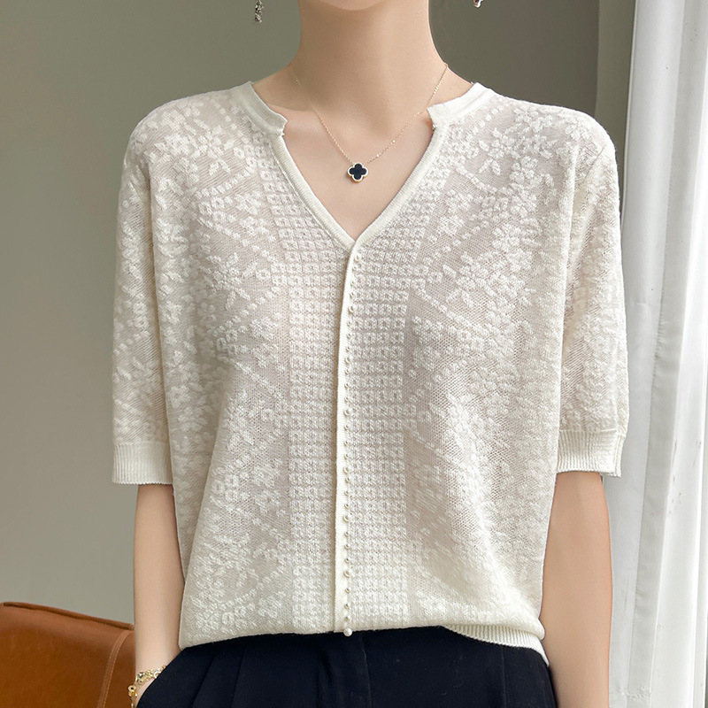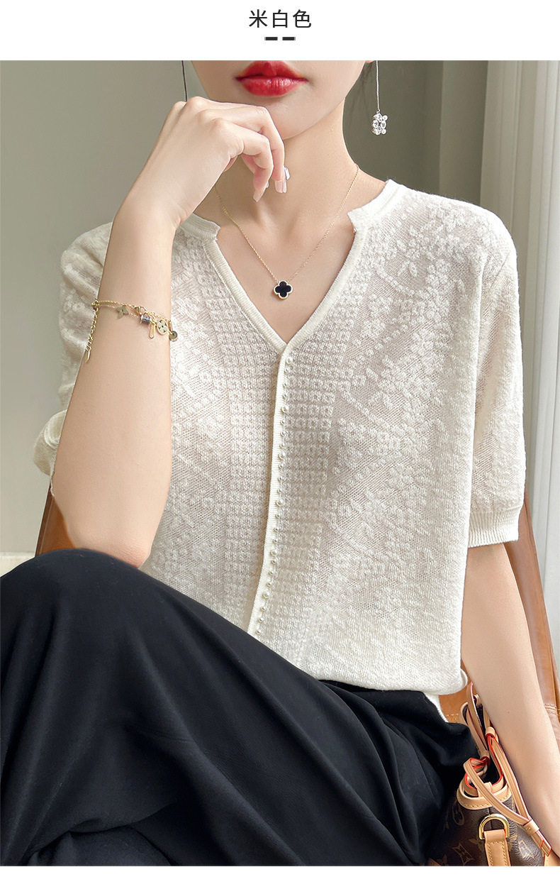 여름 새로운 반팔 티셔츠 중국 스타일 국가 스타일 텐셀 뽕나무 실크 블렌드 중공 크로 셰 탑 V 넥 구슬 니트스토어 가기