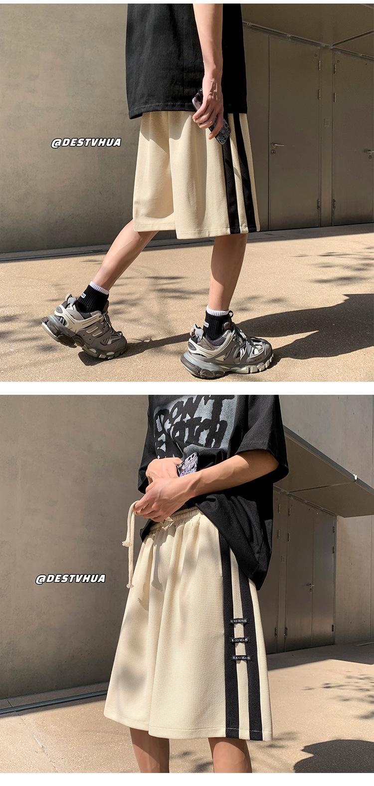 2025년 신상 여름 와플 반바지 남성 홍콩 스타일 트렌디 5부 바지 루즈 스트레이트 맞춤형 스플리싱 캐주얼 바지