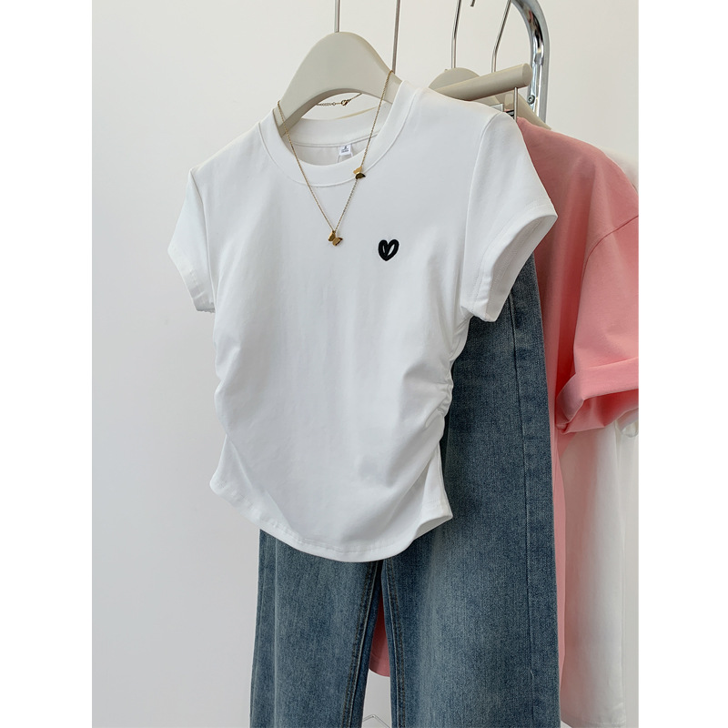 한국판 플러스 사이즈 슬림핏 코튼 티셔츠 반팔 여성 디자인 러브 자수 카드 허리 셔츠 짧은 기질 바닥 셔츠스토어 가기