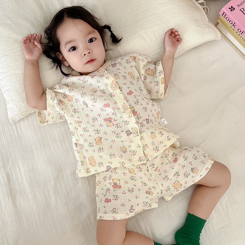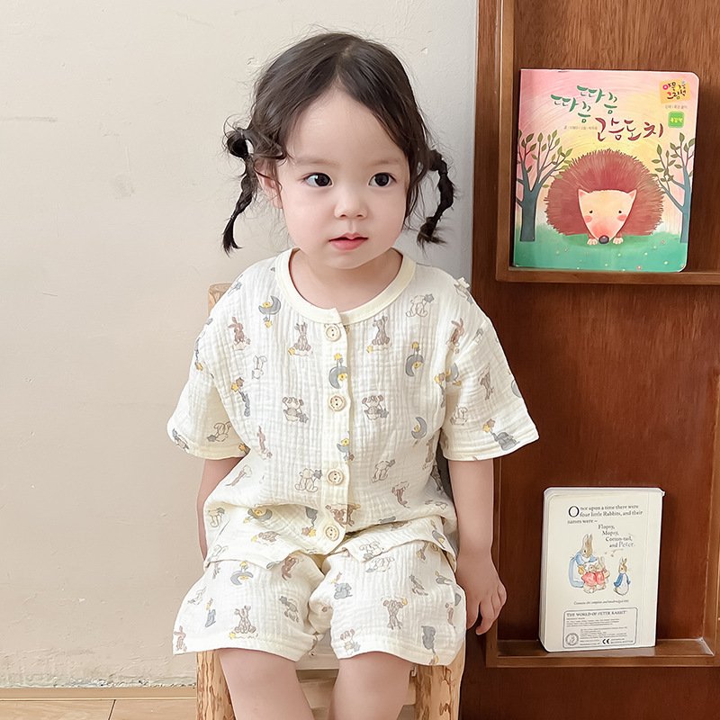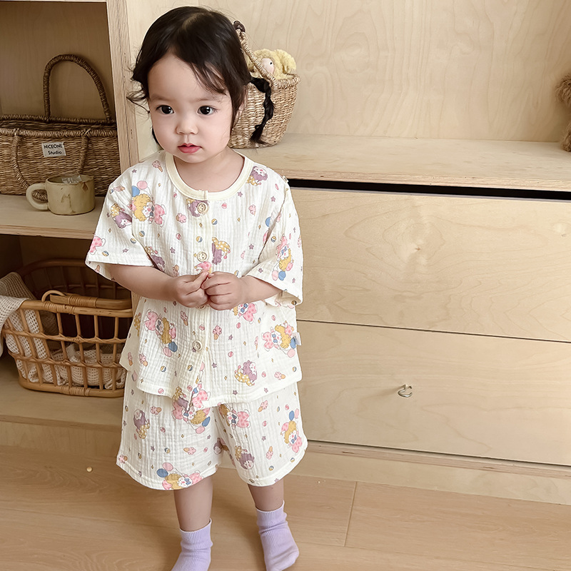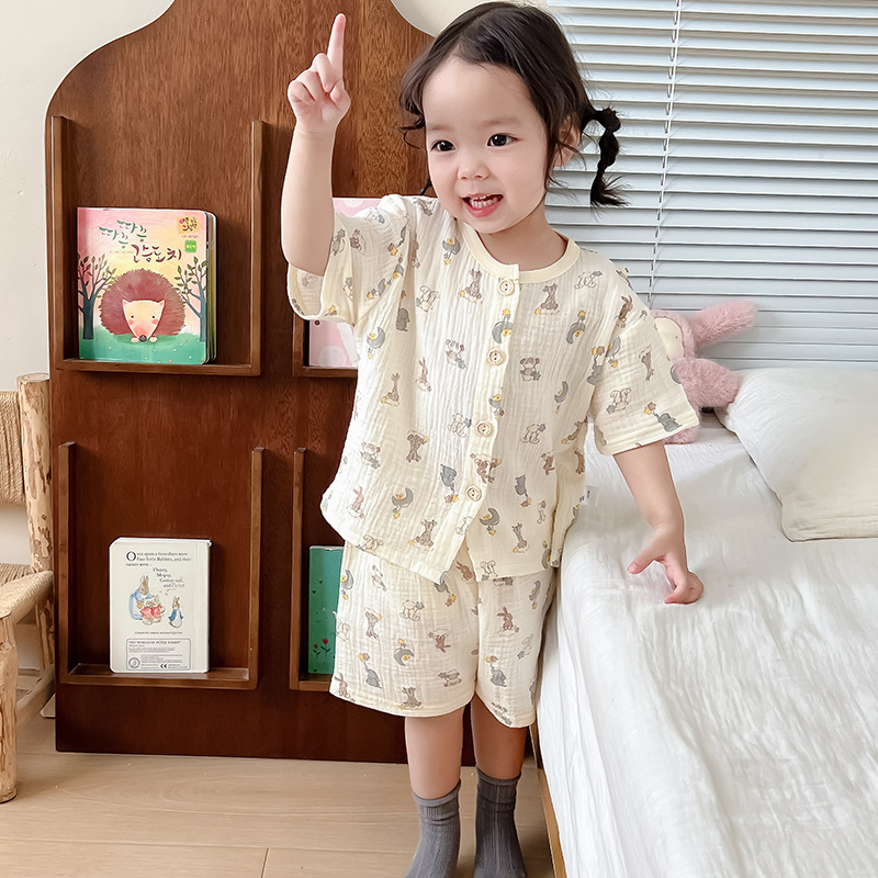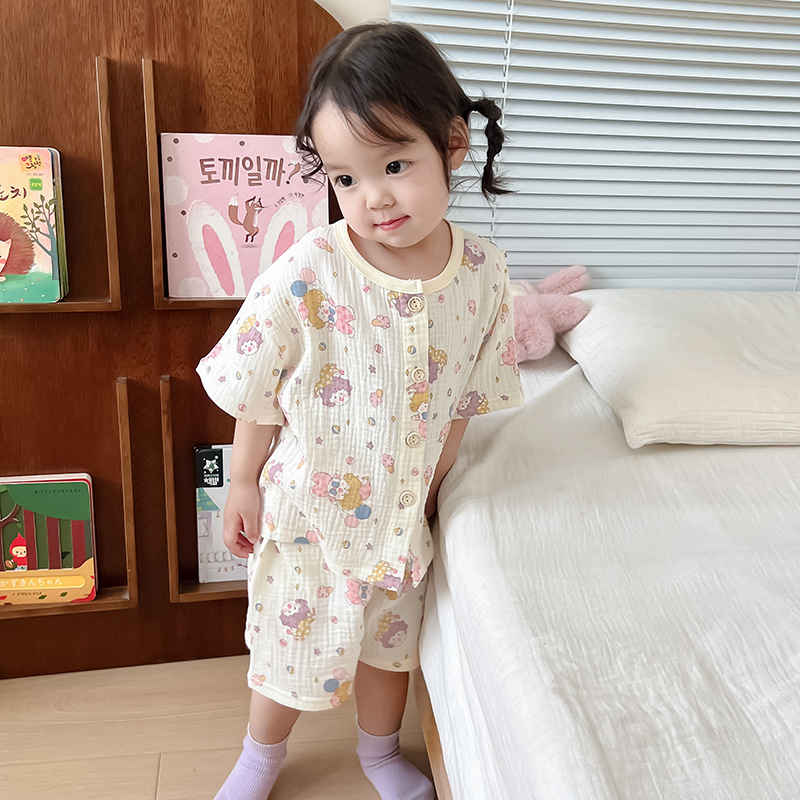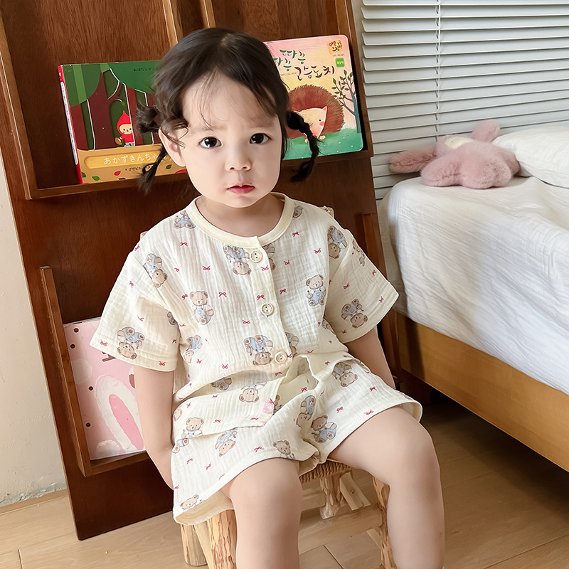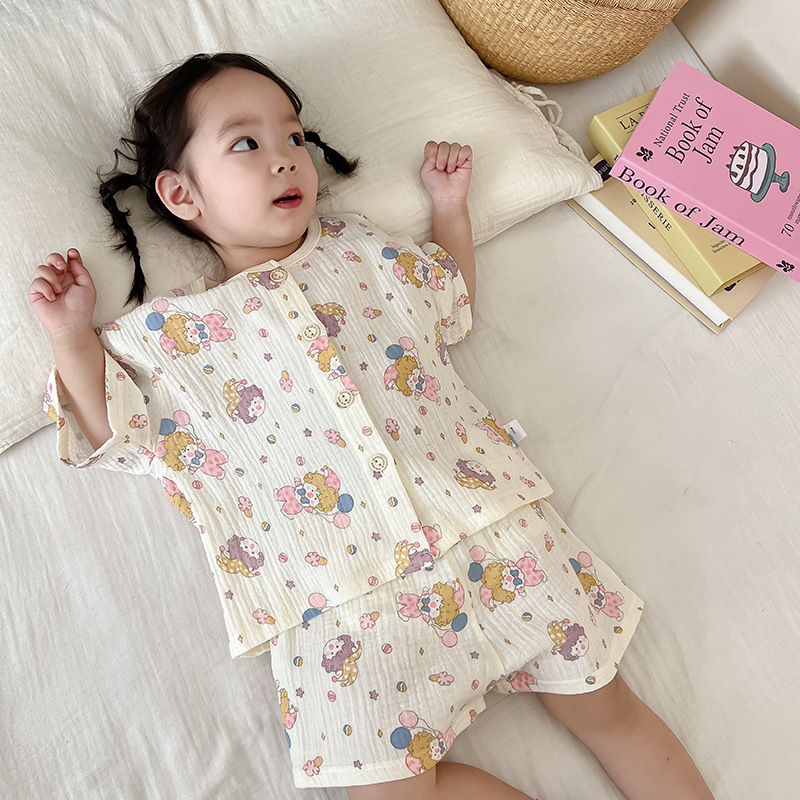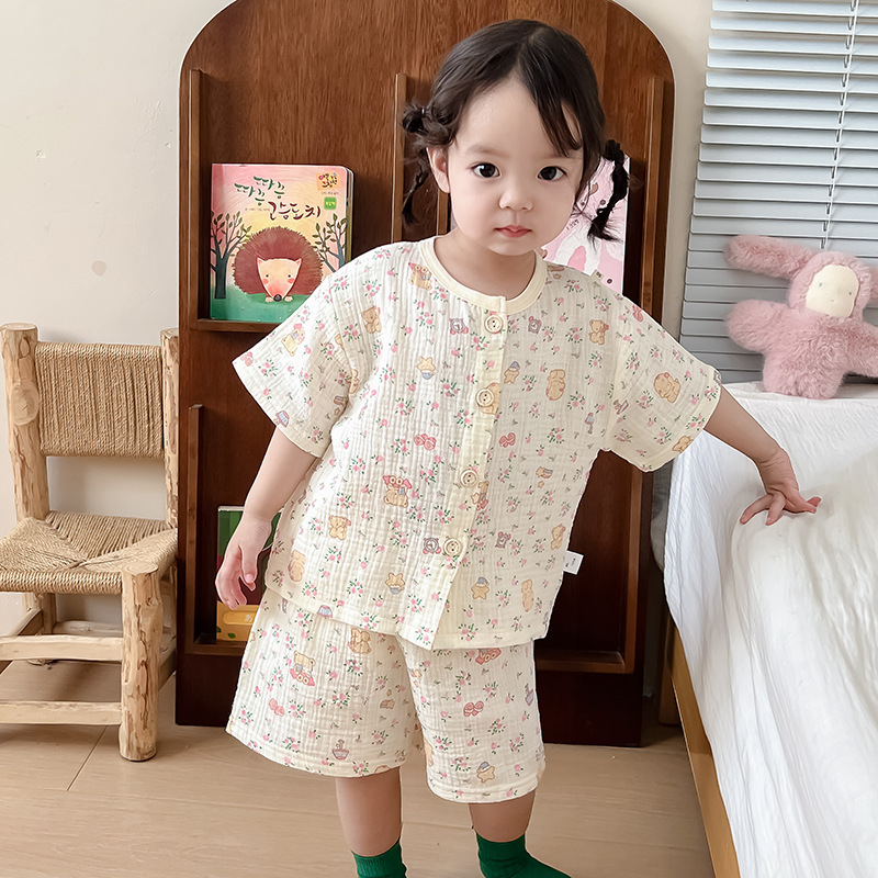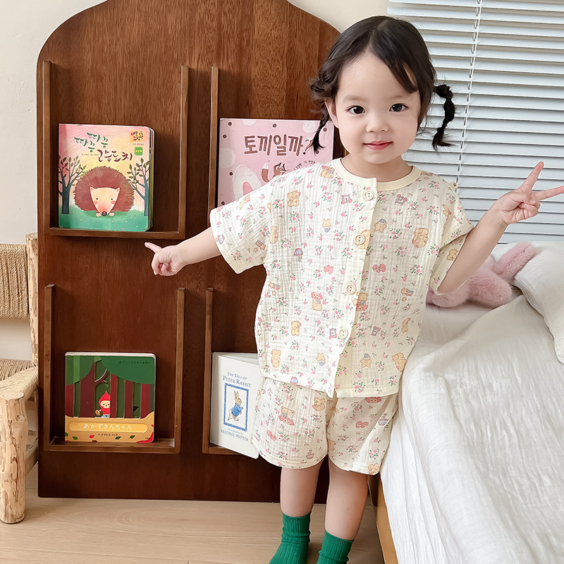 2025 새로운 순면 거즈 소녀 잠옷 어린이 홈 의류 세트 면 거즈 카디건 베이비 홈 의류 얇은스토어 가기