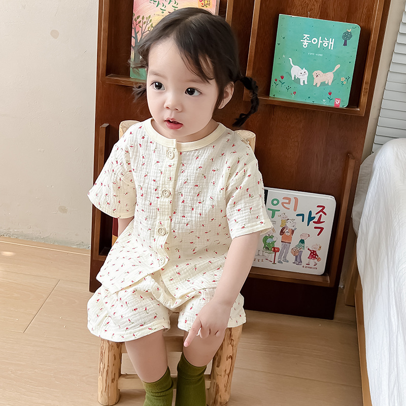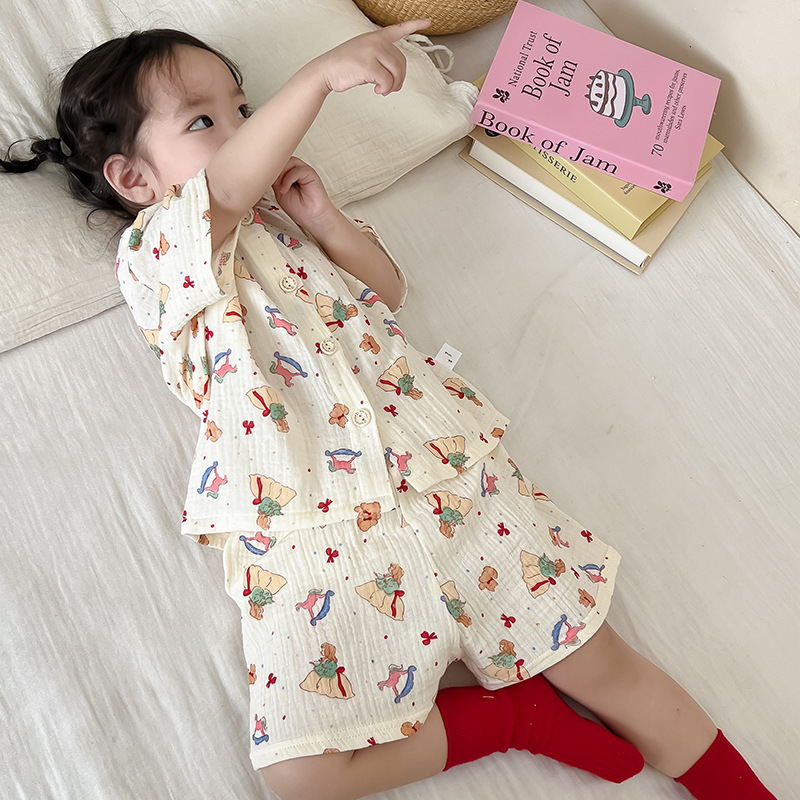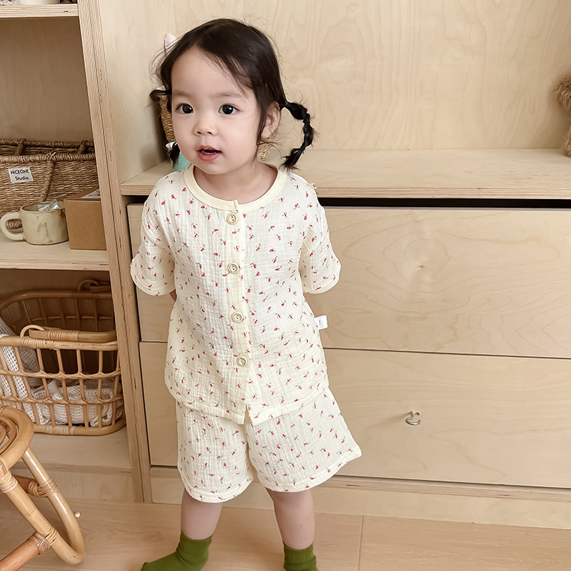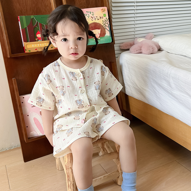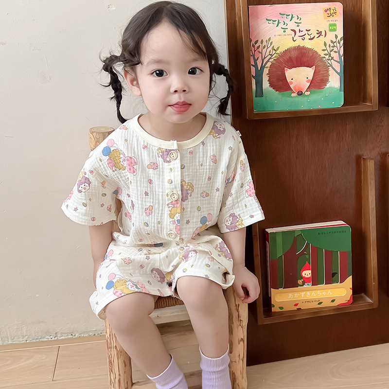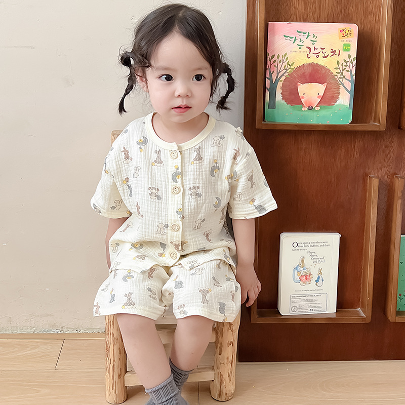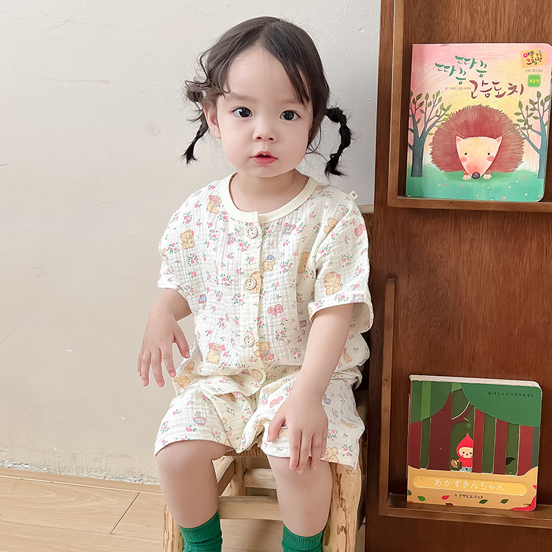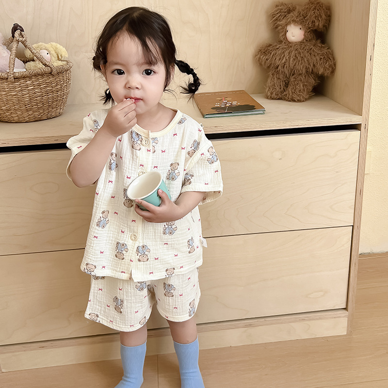 2025 새로운 순면 거즈 소녀 잠옷 어린이 홈 의류 세트 면 거즈 카디건 베이비 홈 의류 얇은스토어 가기