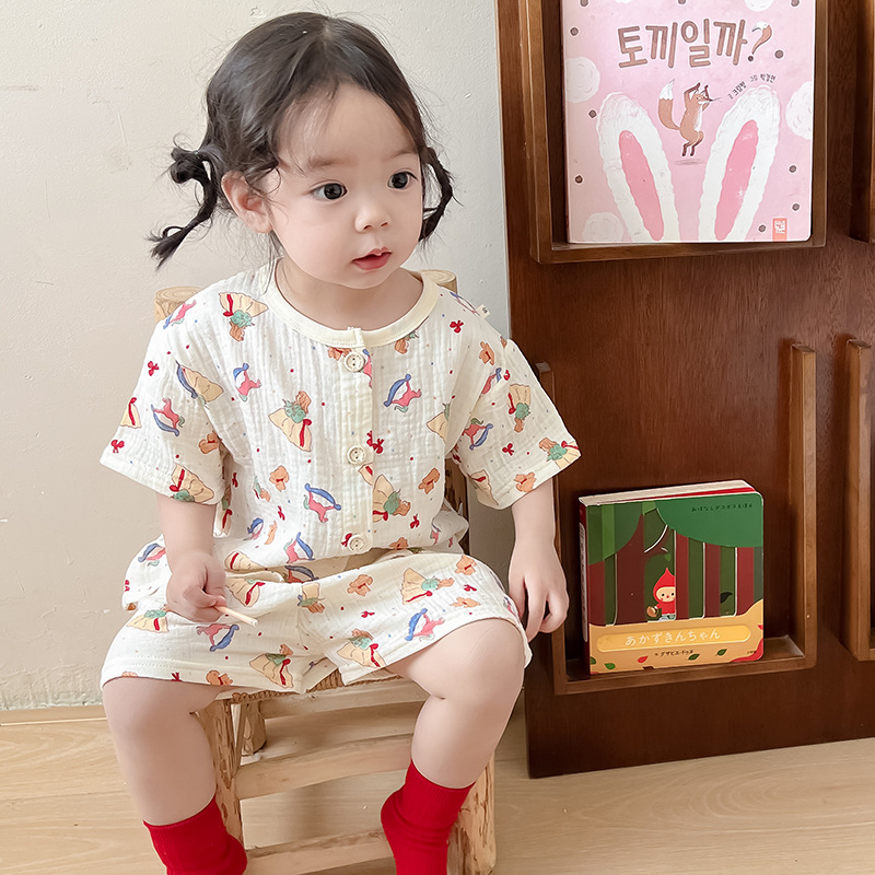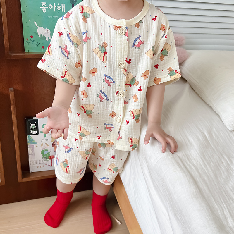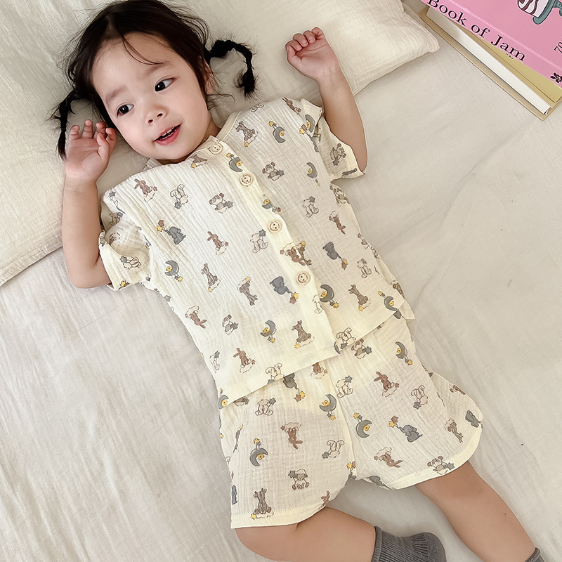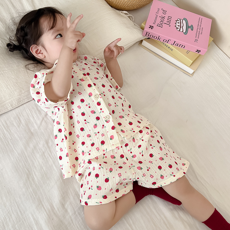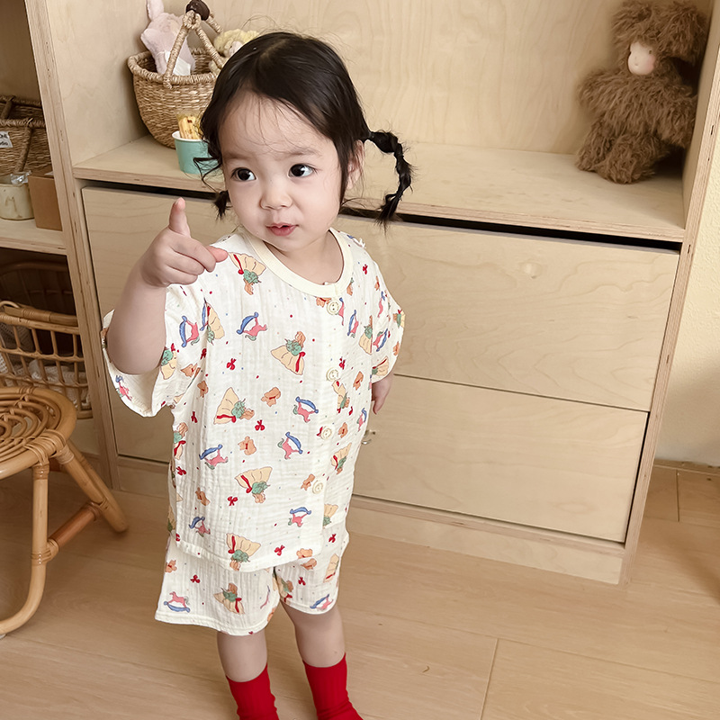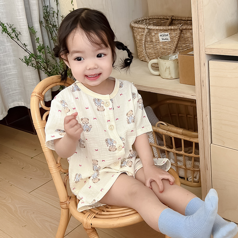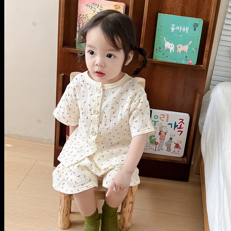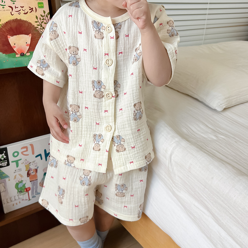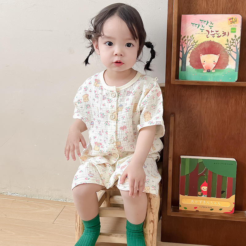 2025 새로운 순면 거즈 소녀 잠옷 어린이 홈 의류 세트 면 거즈 카디건 베이비 홈 의류 얇은스토어 가기