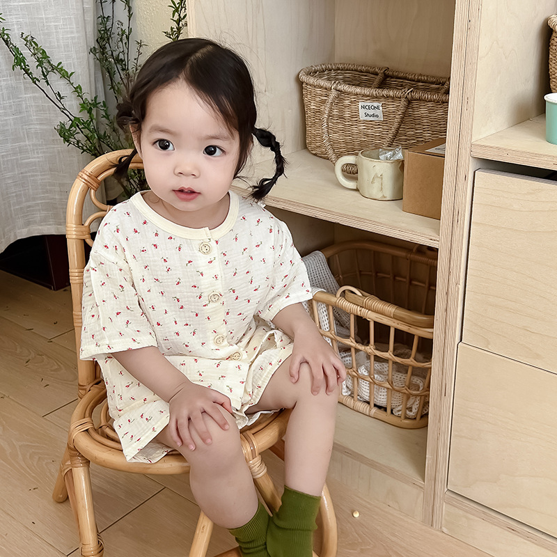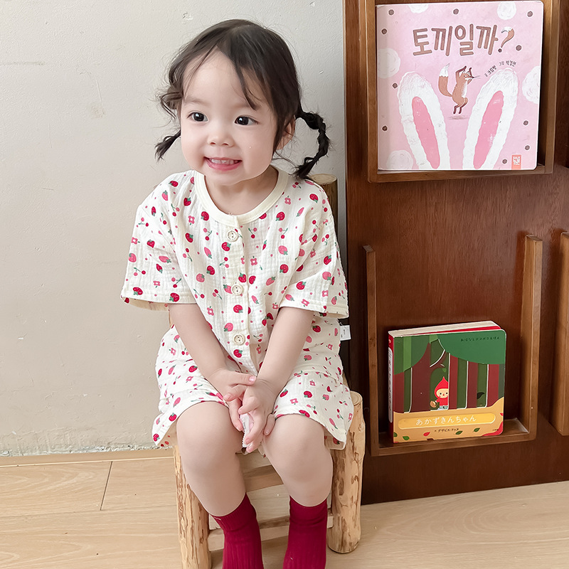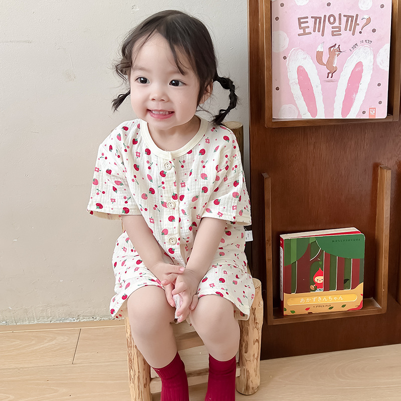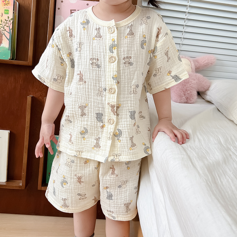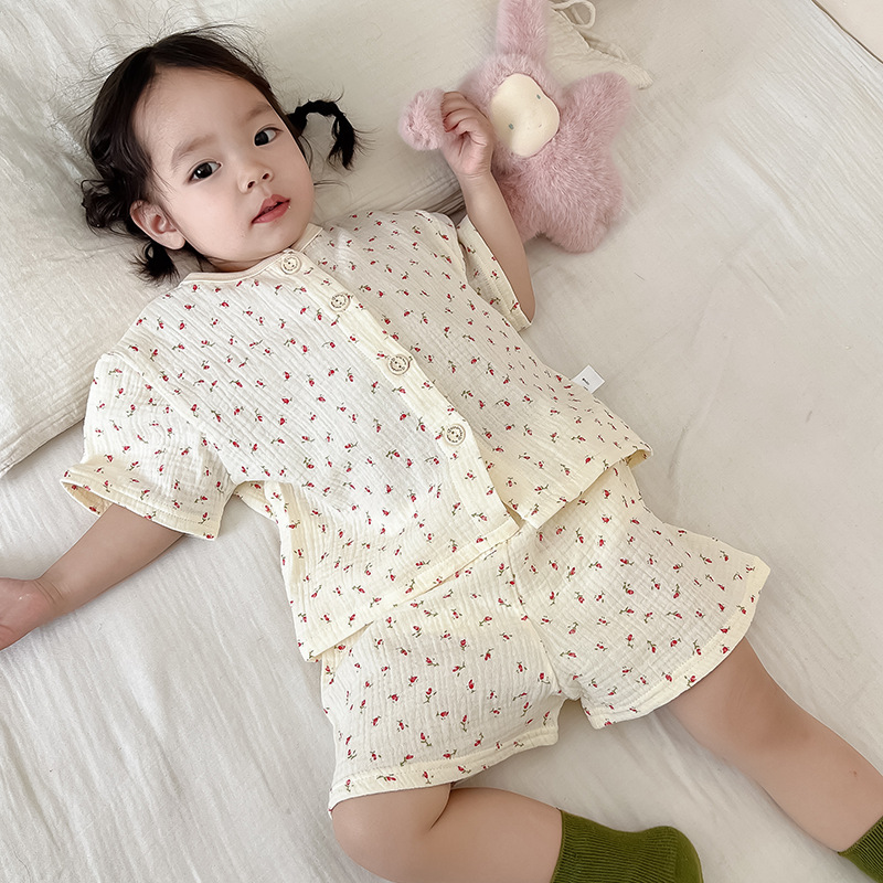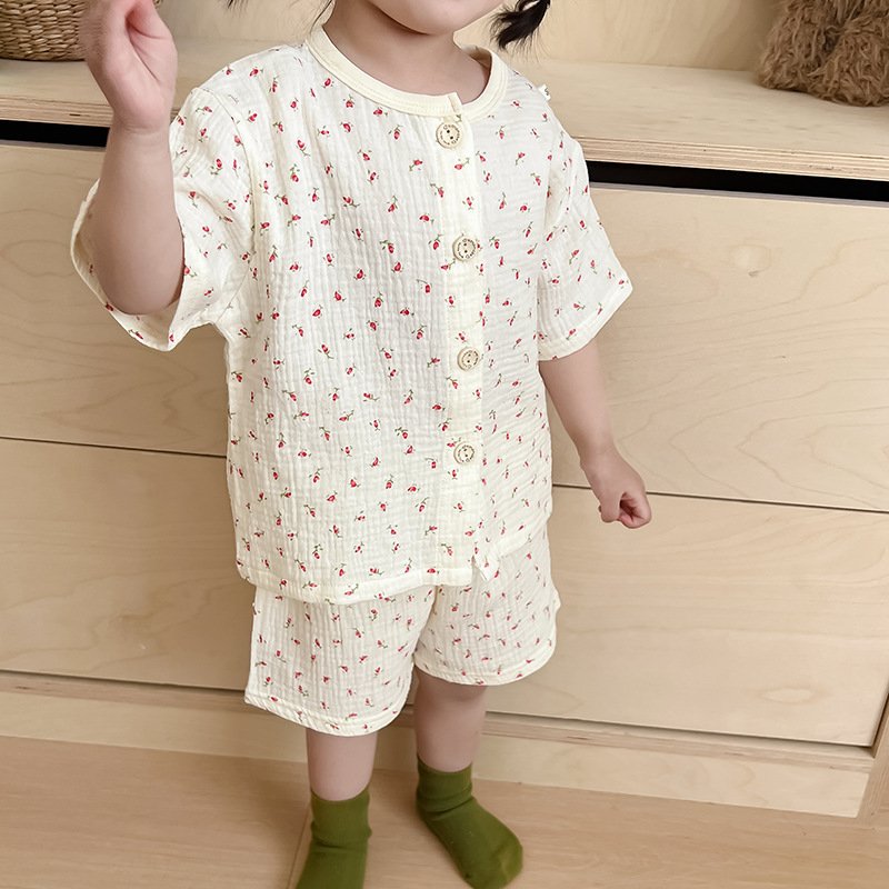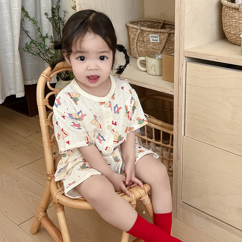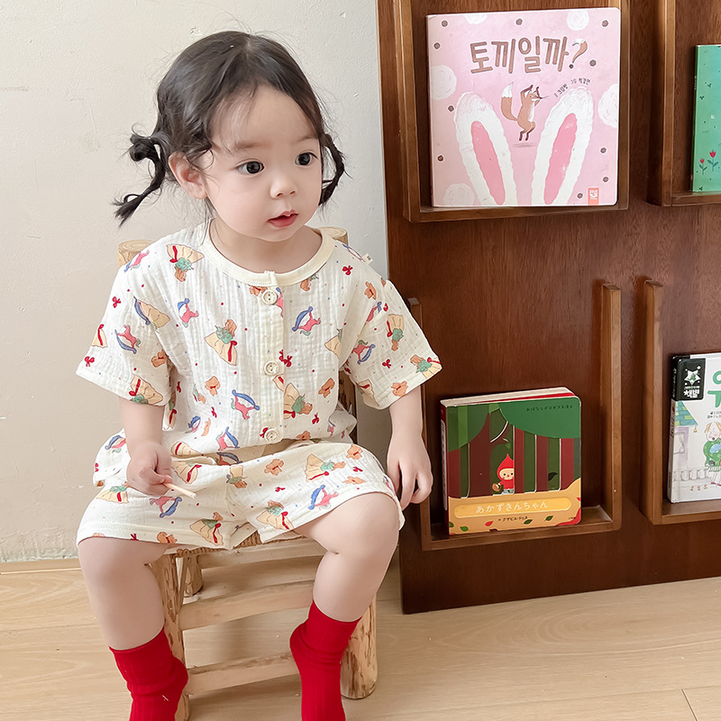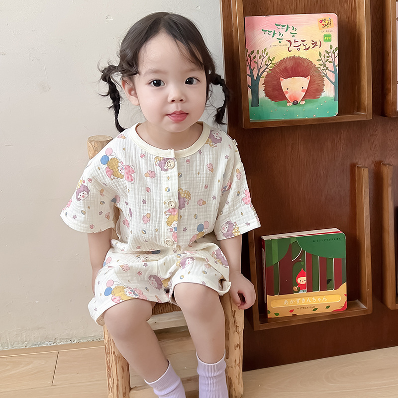 2025 새로운 순면 거즈 소녀 잠옷 어린이 홈 의류 세트 면 거즈 카디건 베이비 홈 의류 얇은스토어 가기