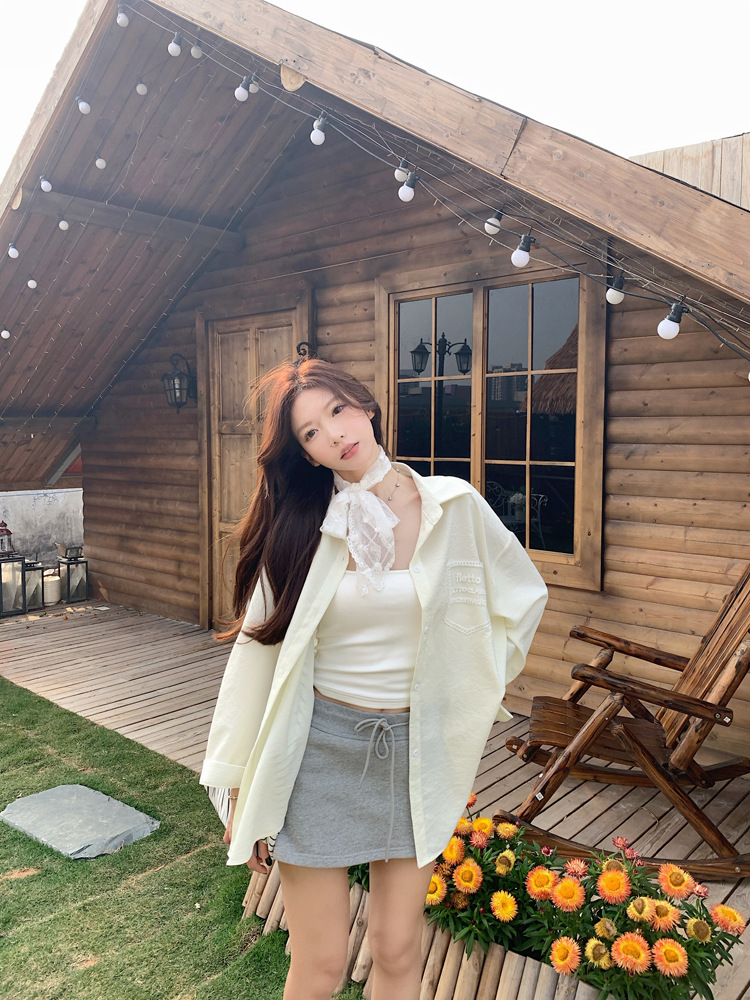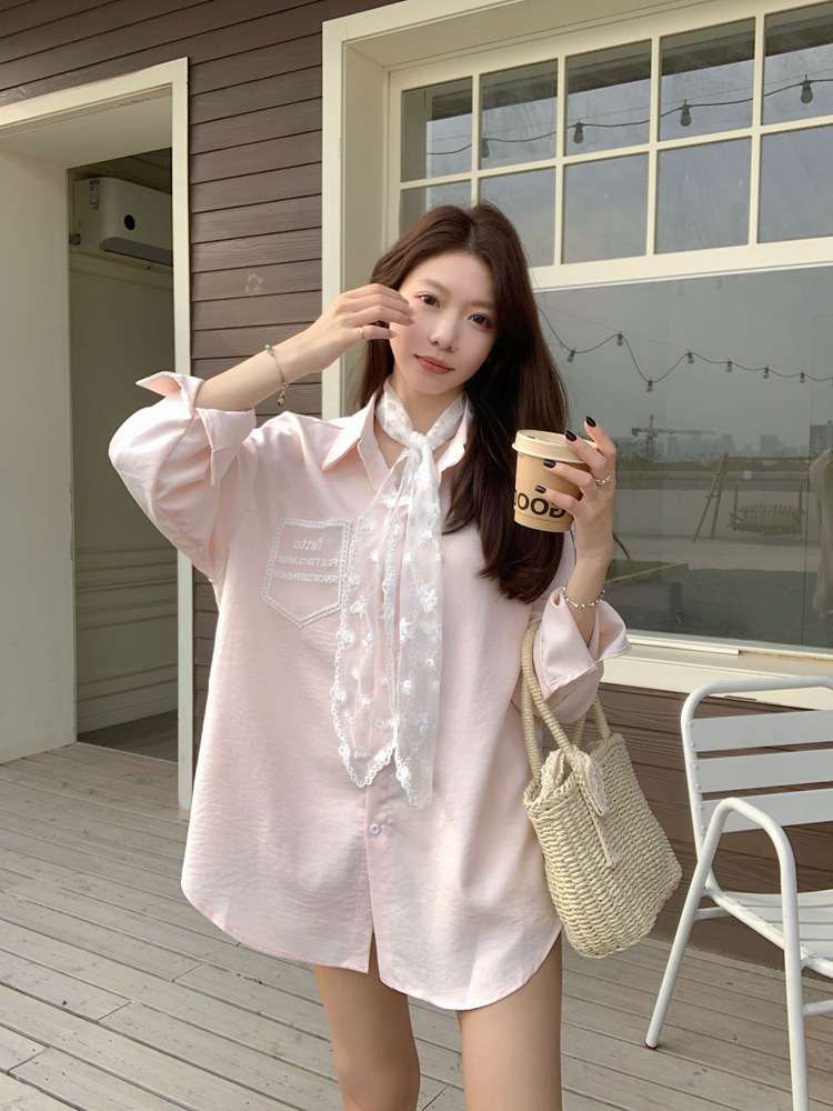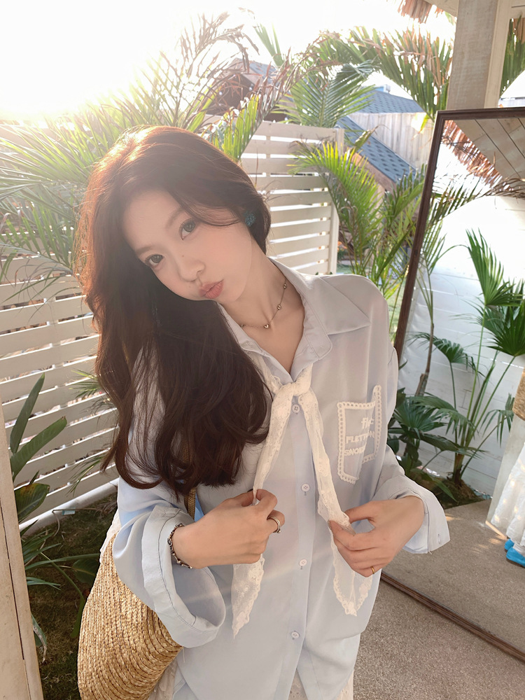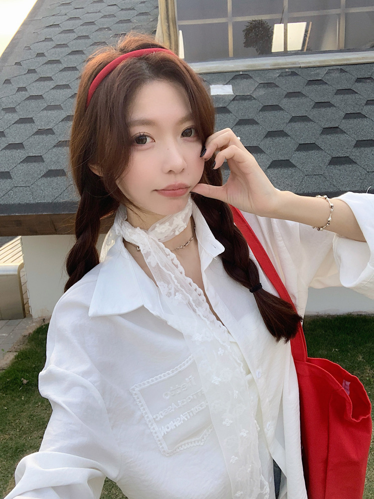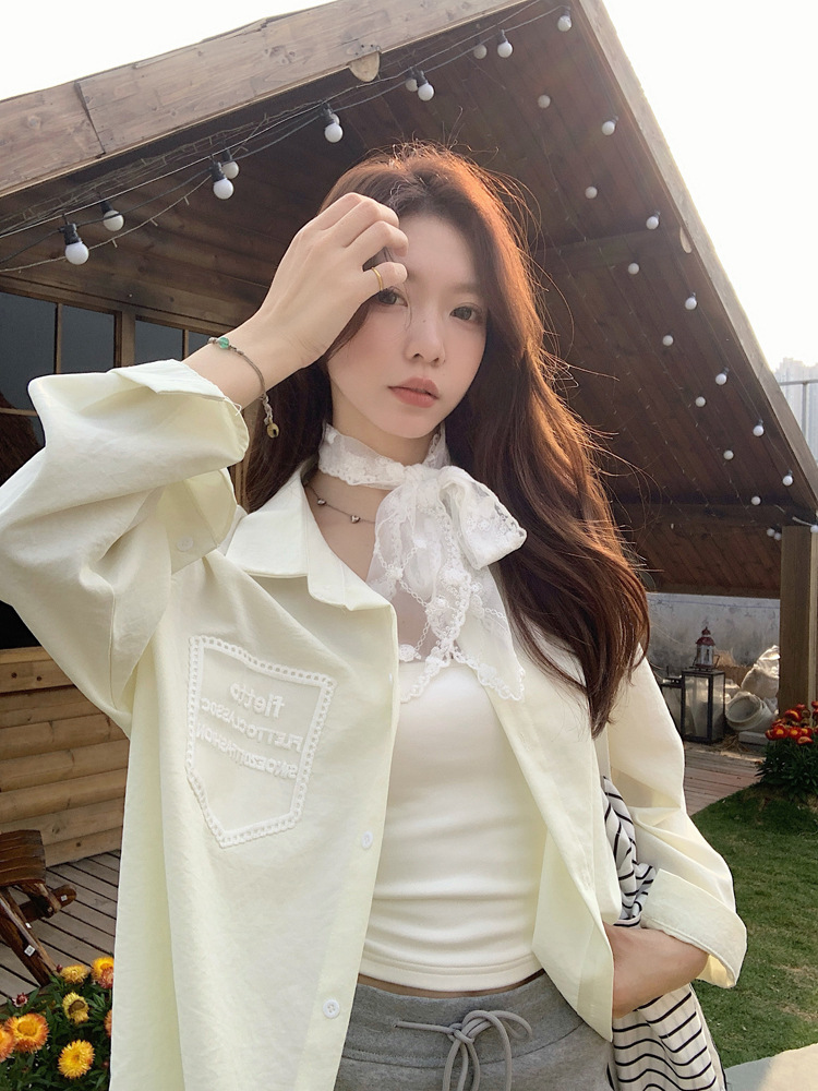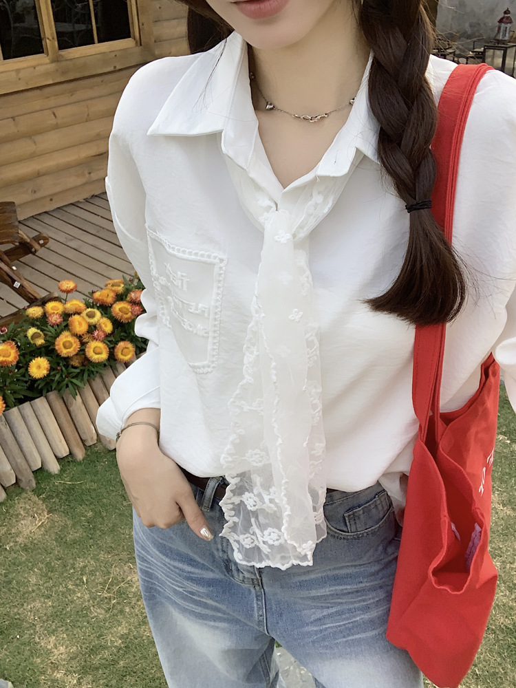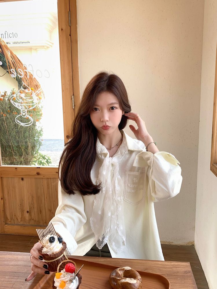 한국 스타일 레이스 타이 긴 소매 화이트 셔츠 여성의 봄 신선한 디자인 센스 캐주얼 올 매치 셔츠 카디건 탑