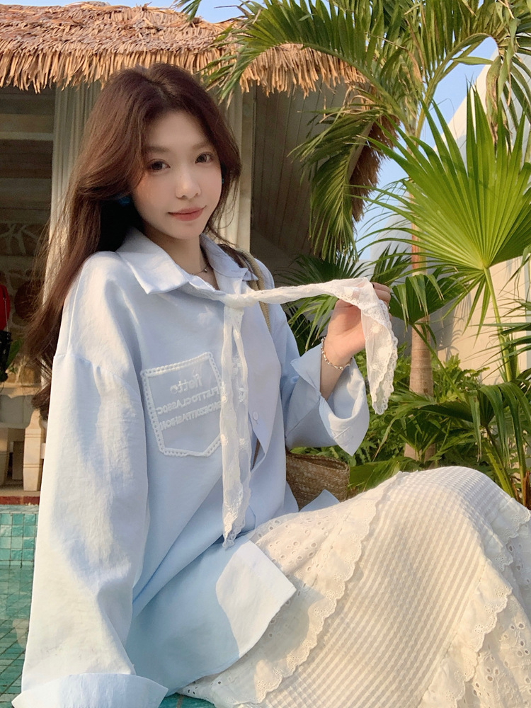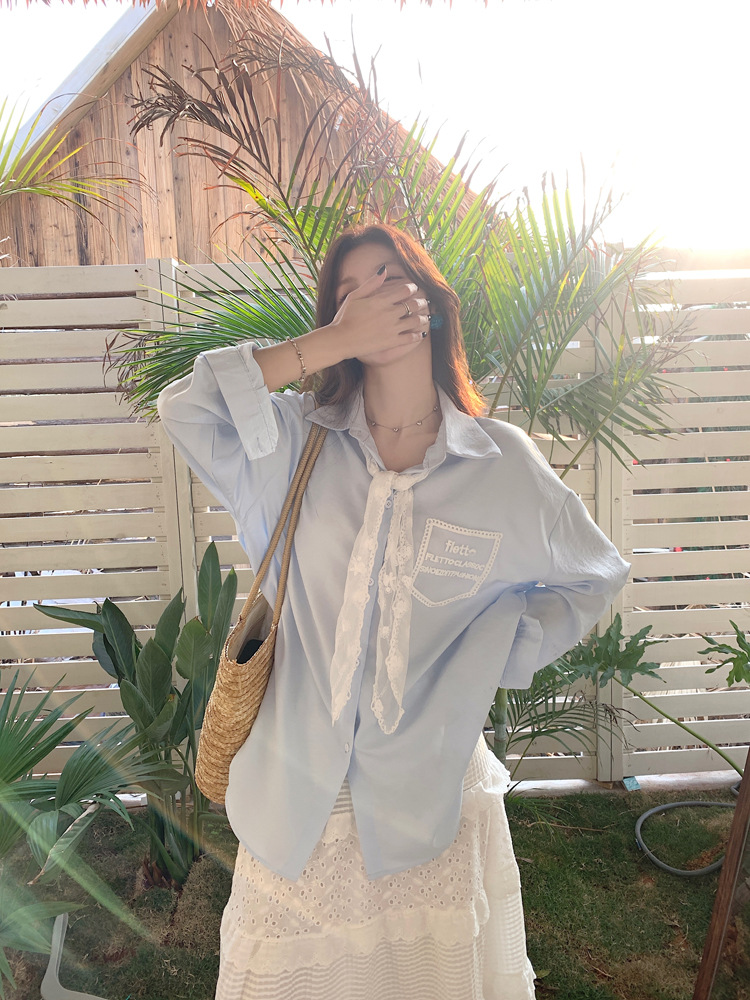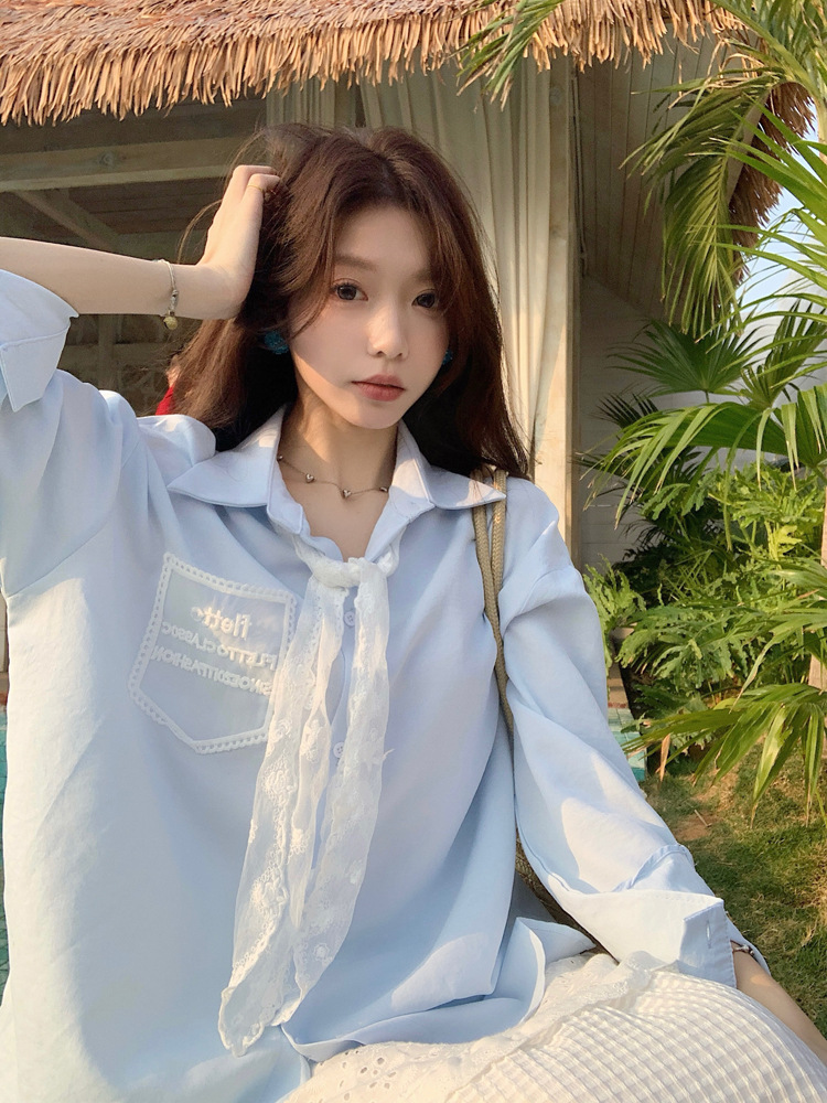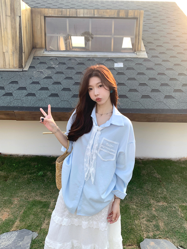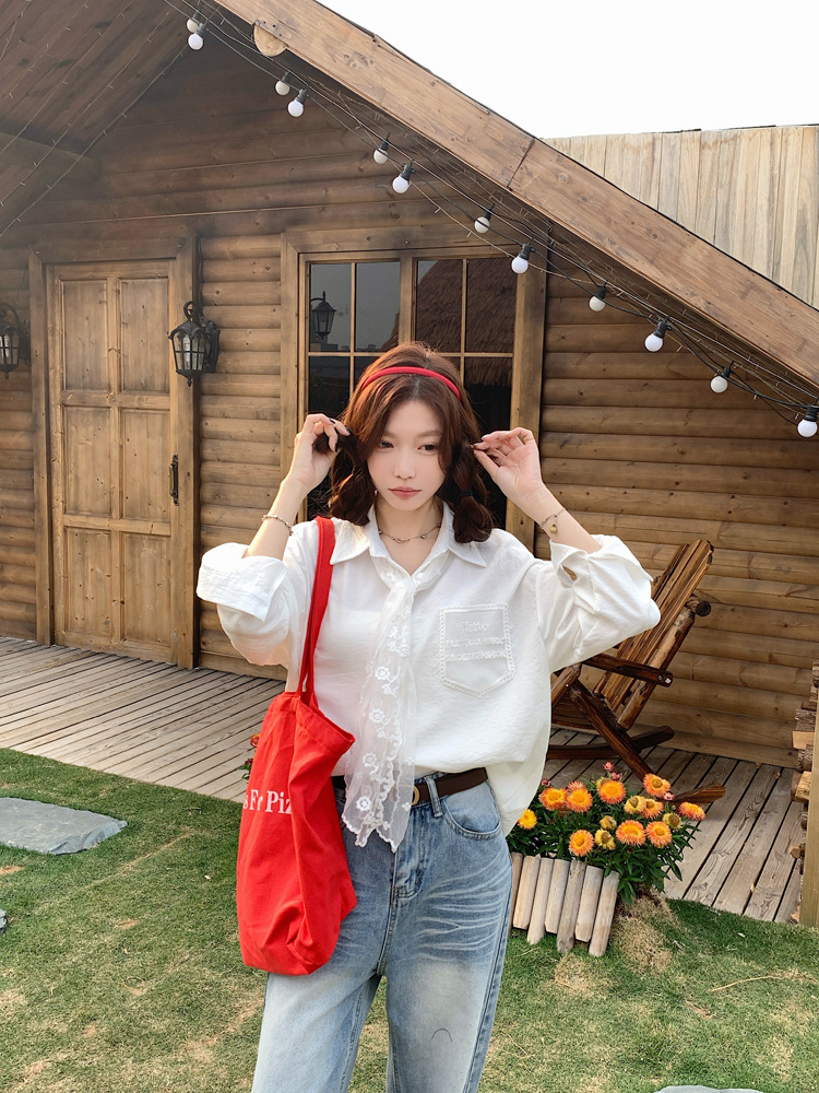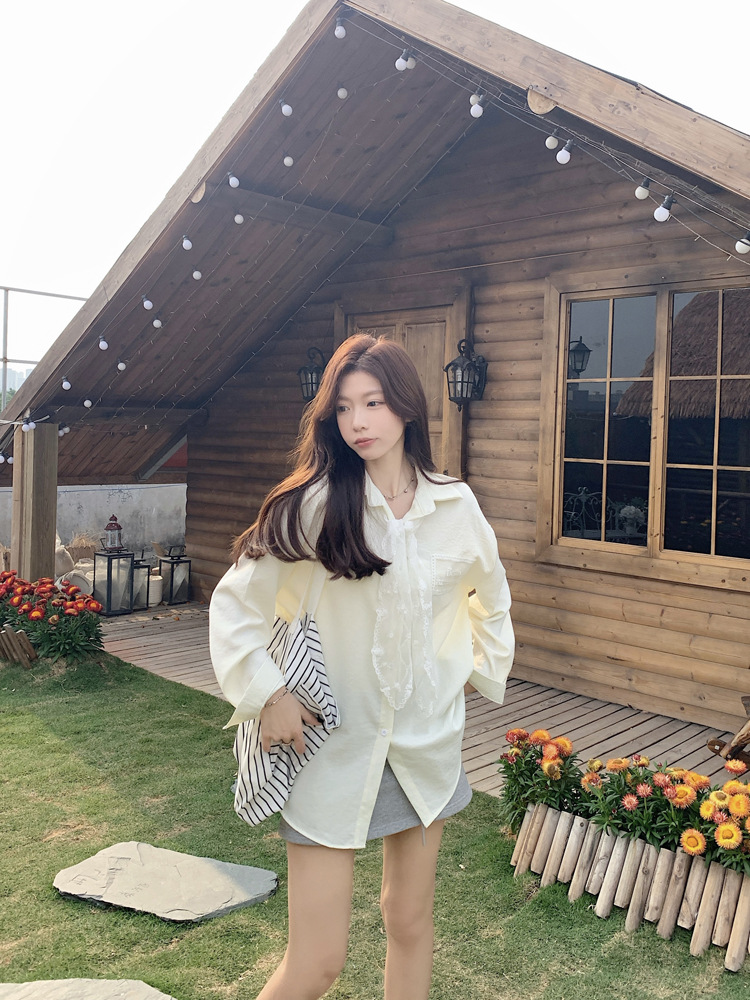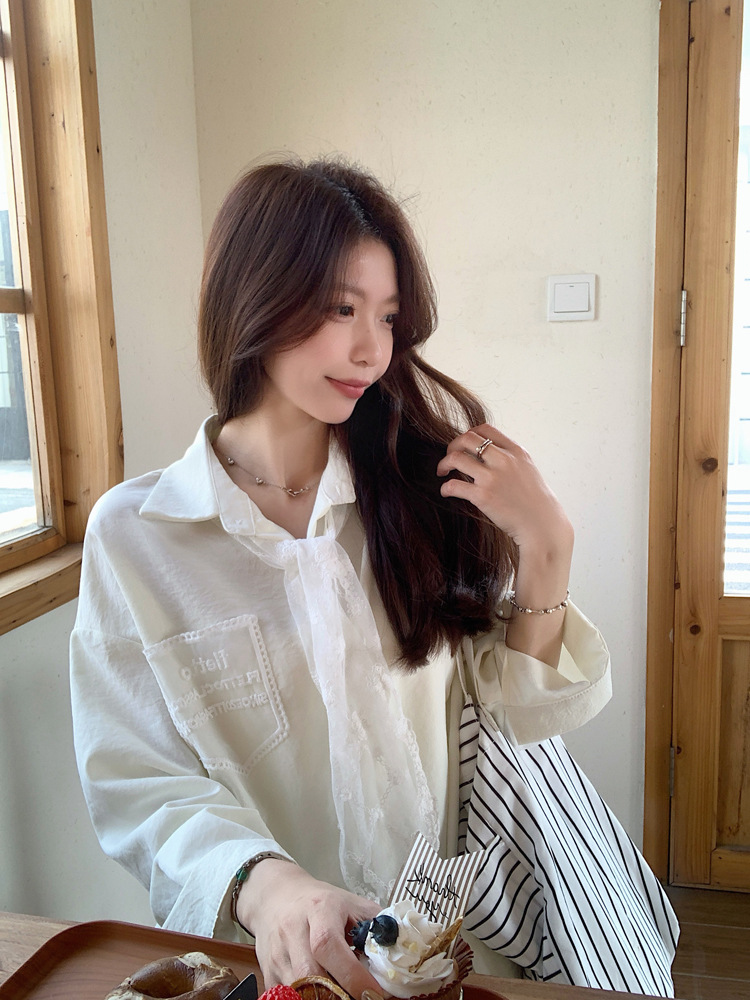 한국 스타일 레이스 타이 긴 소매 화이트 셔츠 여성의 봄 신선한 디자인 센스 캐주얼 올 매치 셔츠 카디건 탑스토어 가기