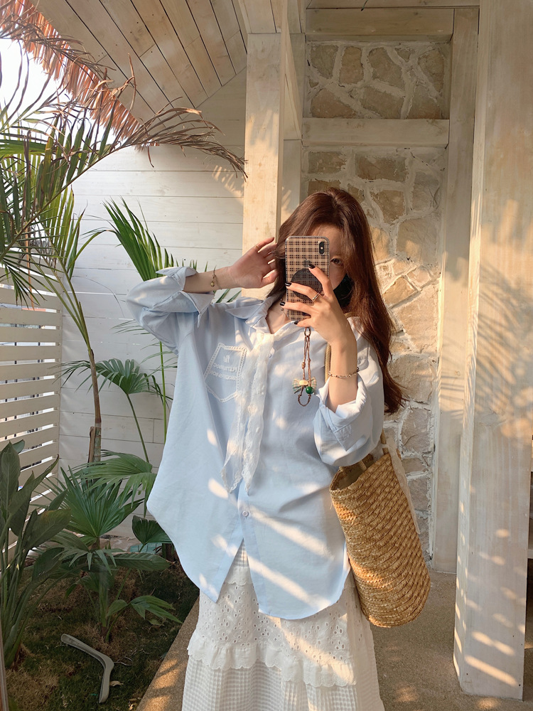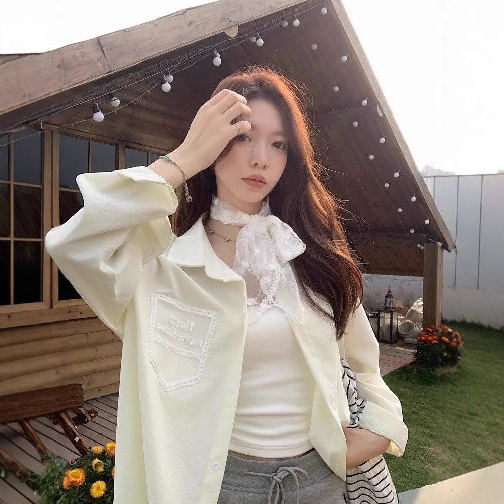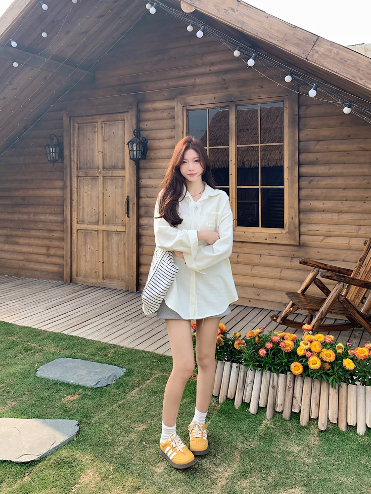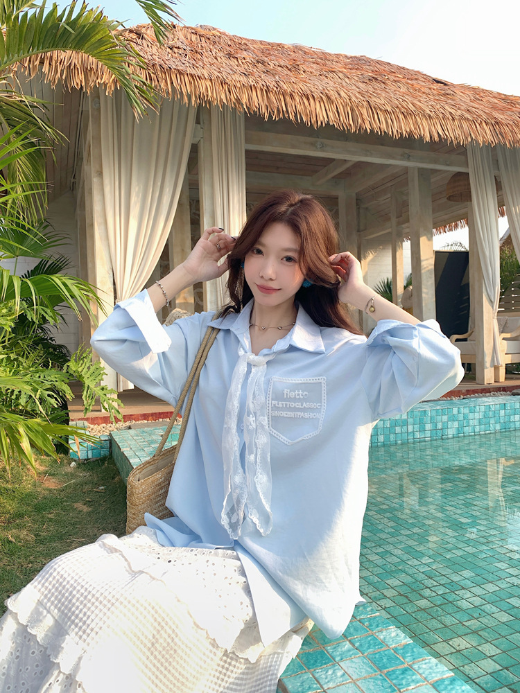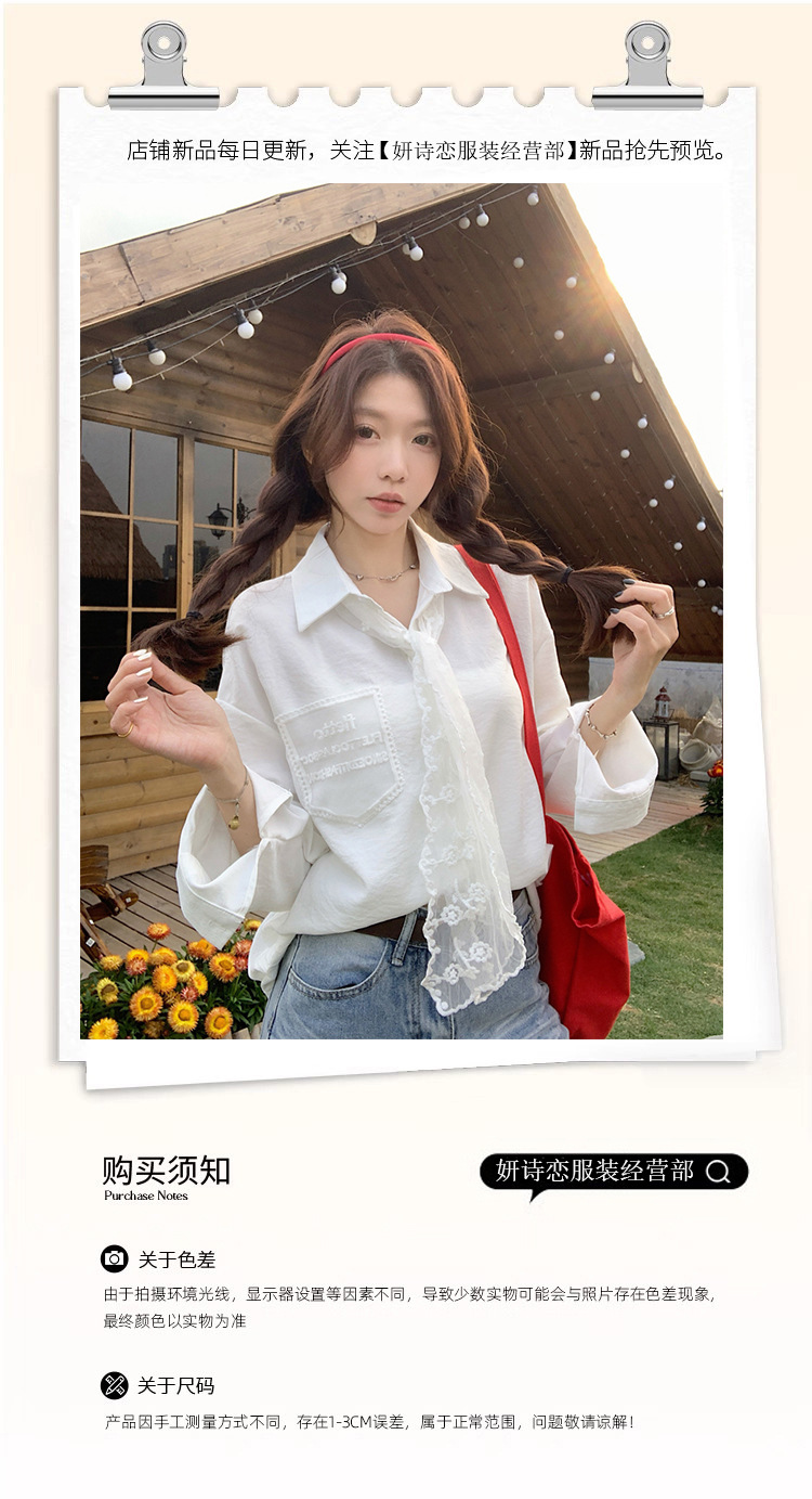 한국 스타일 레이스 타이 긴 소매 화이트 셔츠 여성의 봄 신선한 디자인 센스 캐주얼 올 매치 셔츠 카디건 탑스토어 가기