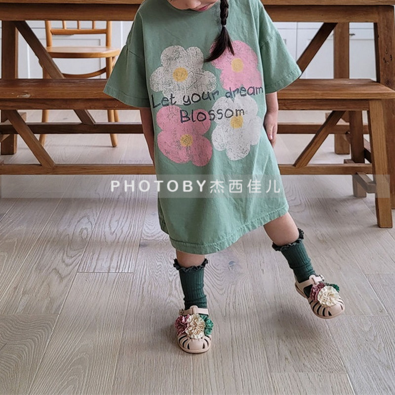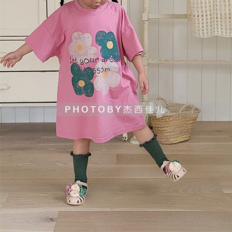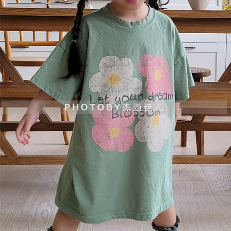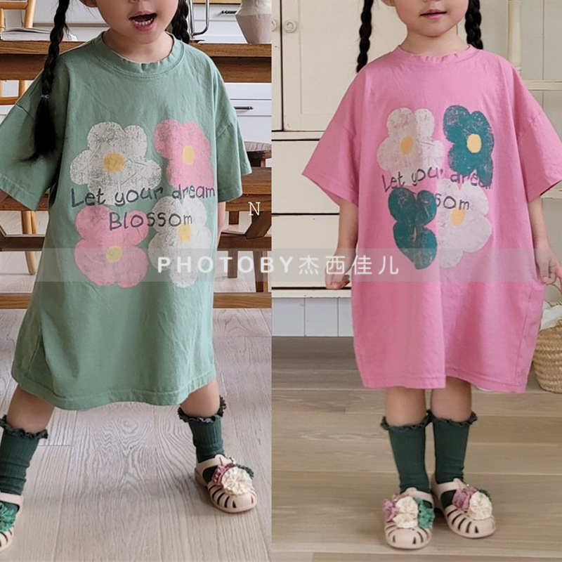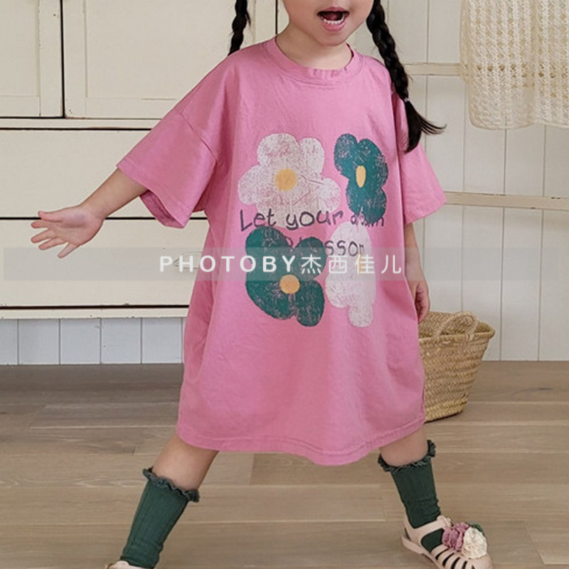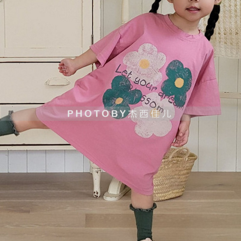 한국식 아동복 여름 새 여아 꽃 프린트 티셔츠 원피스 캐주얼 느슨한 올매치 편안한 원피스