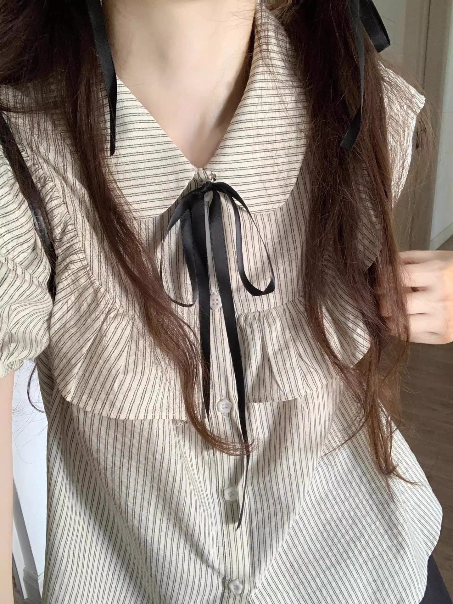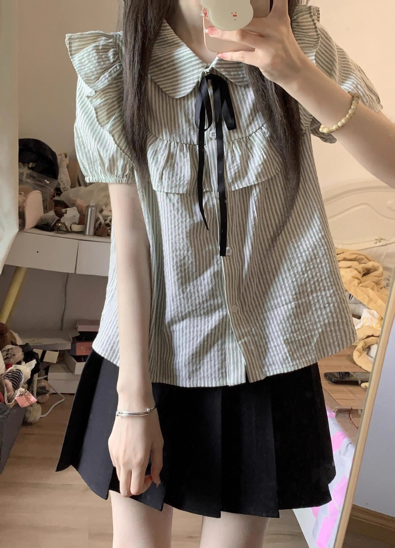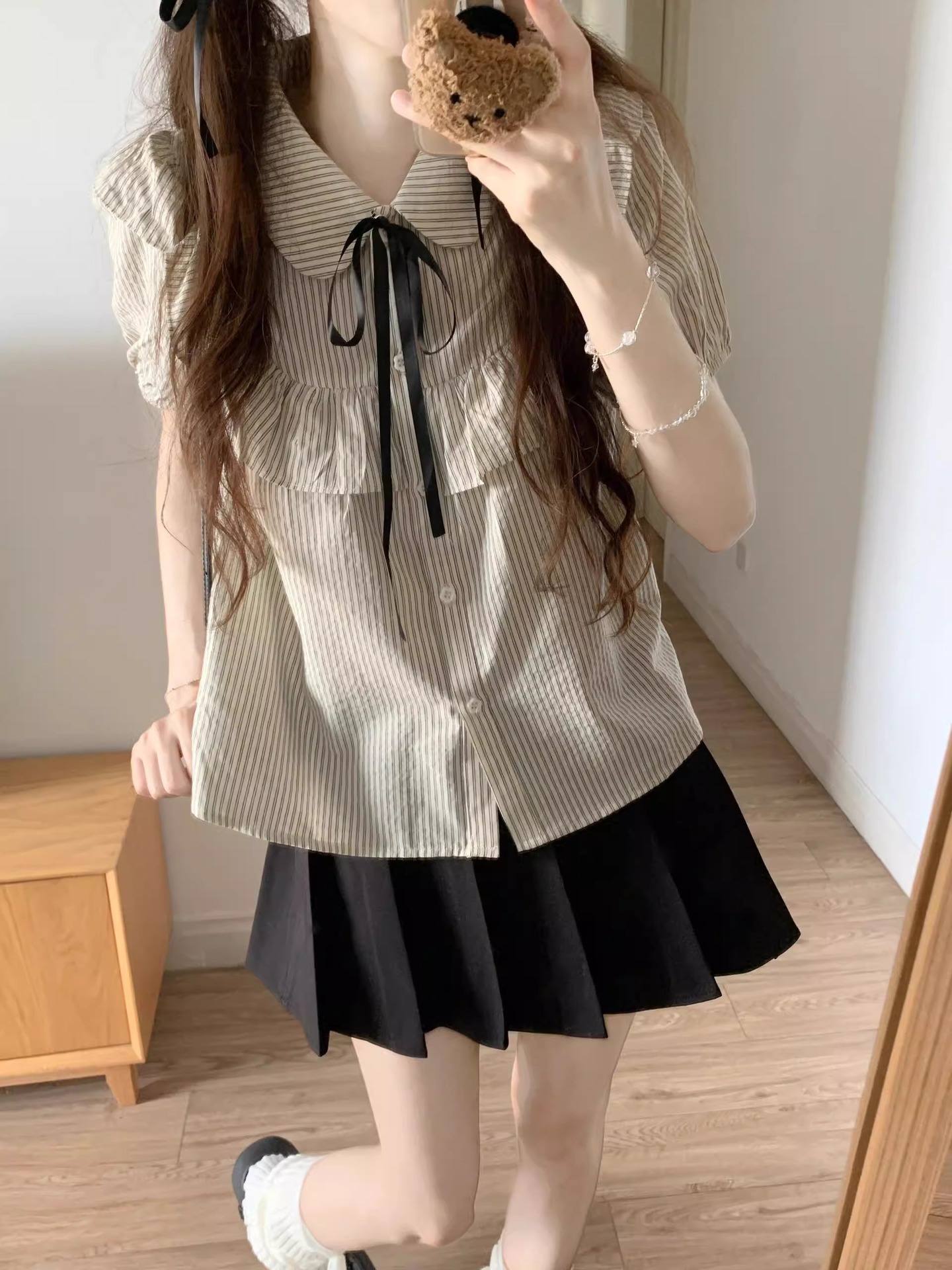 2025 대학 스타일 짧은 소매 셔츠 여성용 달콤한 JK 셔츠 러플 버블 슬리브 탑 스커트 2 피스 세트 일본과 한국 스타일