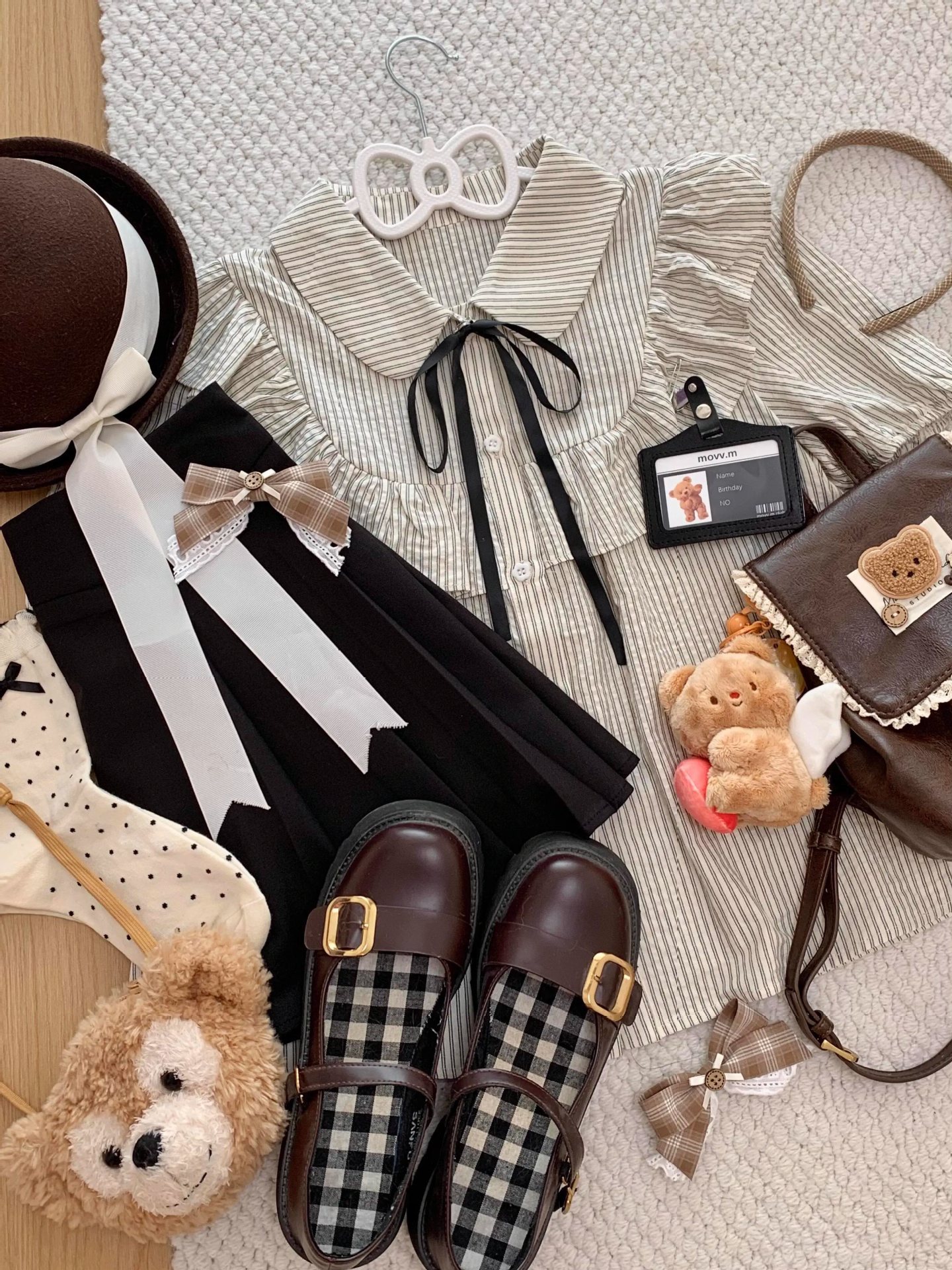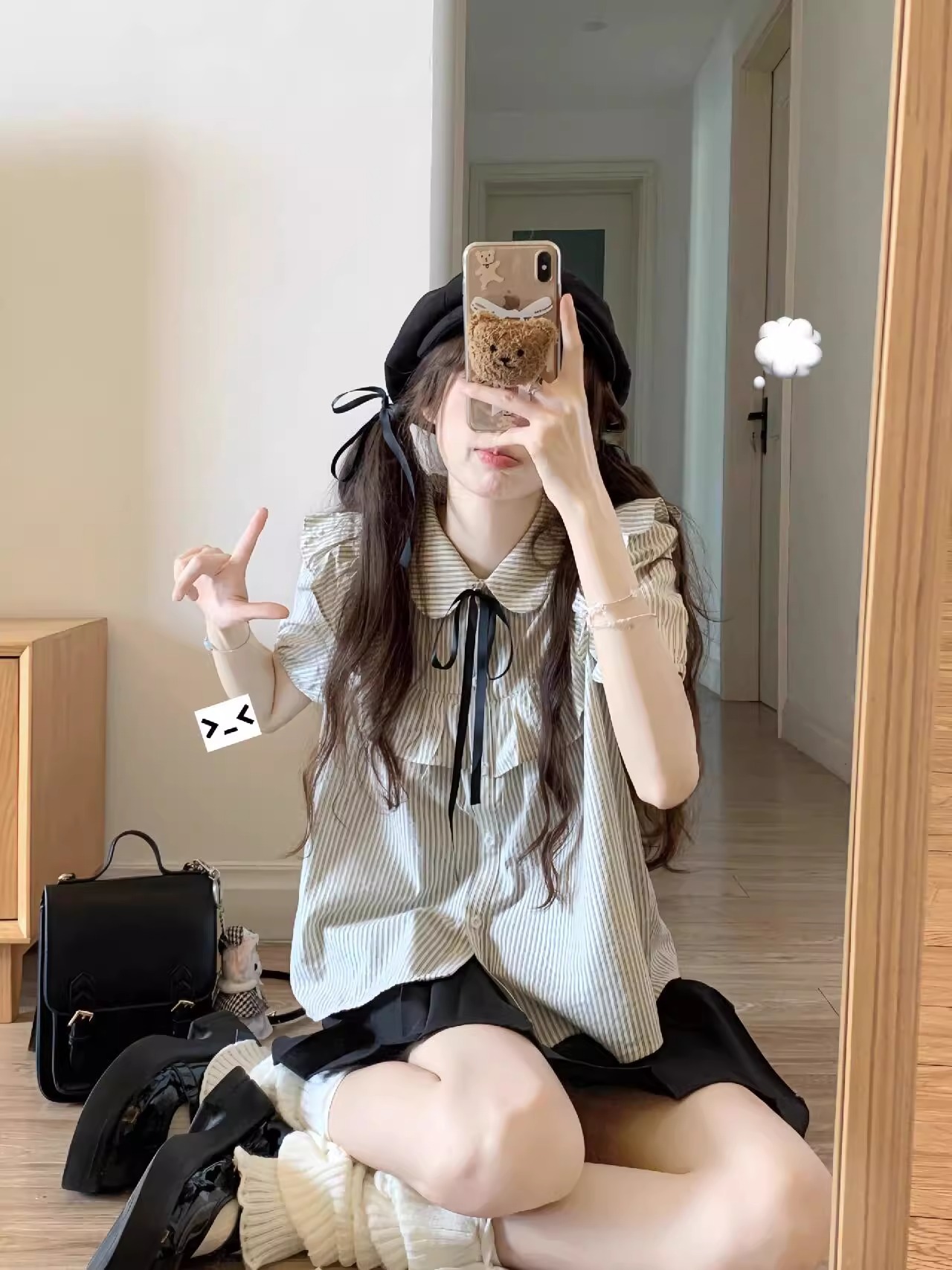 2025 대학 스타일 짧은 소매 셔츠 여성용 달콤한 JK 셔츠 러플 버블 슬리브 탑 스커트 2 피스 세트 일본과 한국 스타일스토어 가기