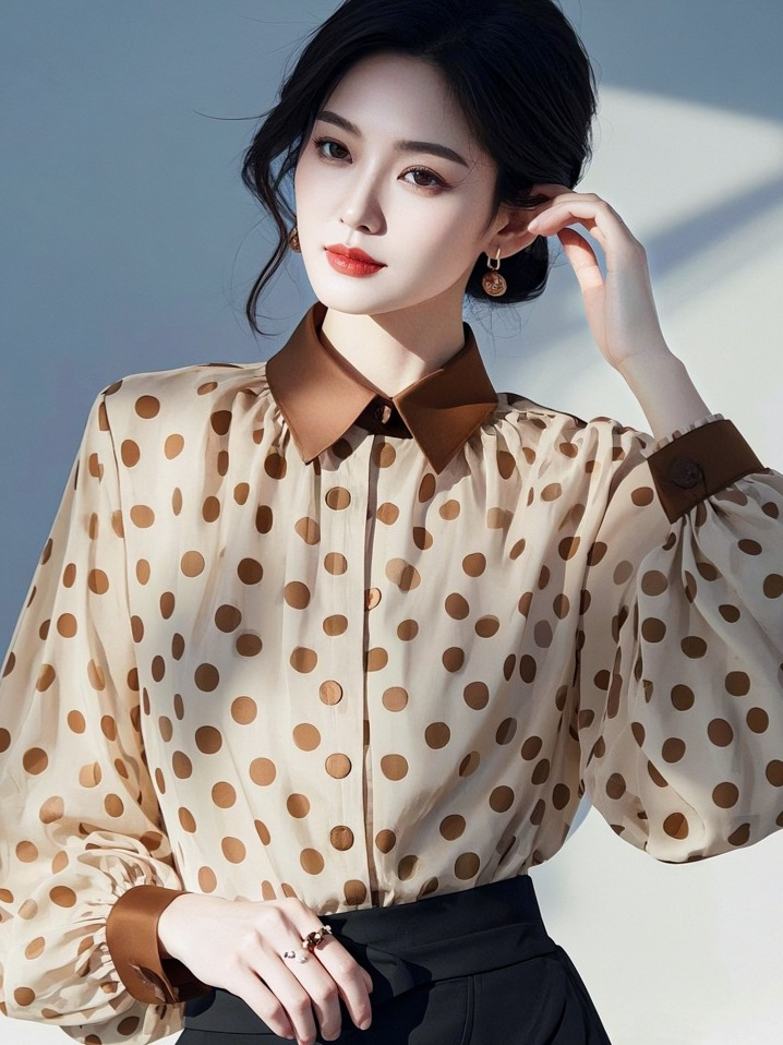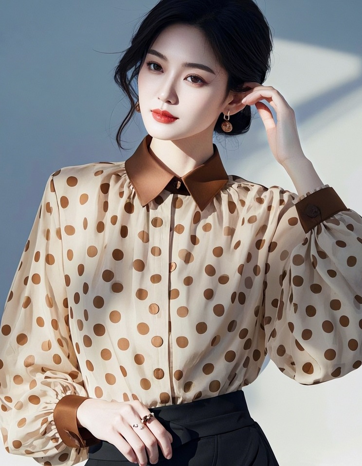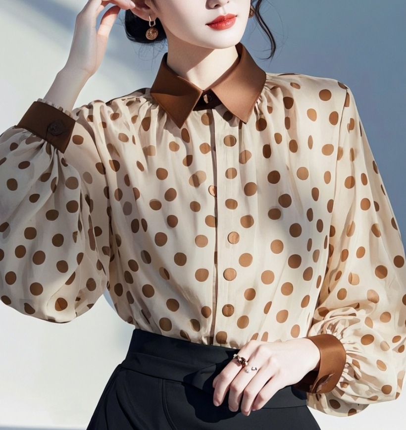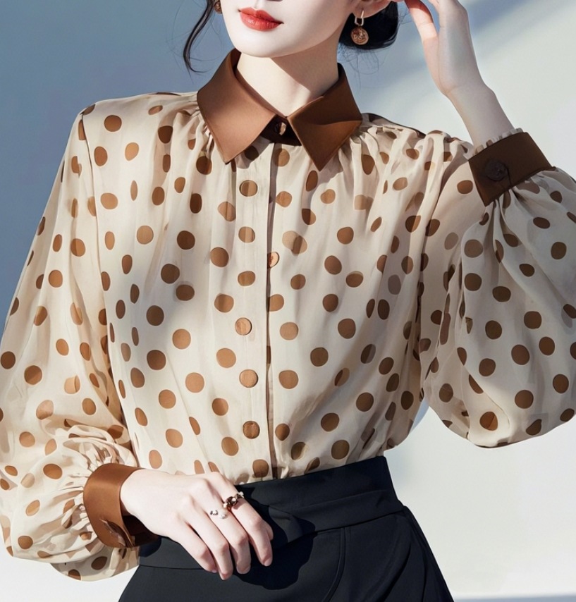 2025 새로운 아름다운 작은 셔츠 프랑스 기질 작은 스타일 하이 엔드 슈퍼 잘 생긴 다크 브라운 웨이브 쉬폰 셔츠 여성