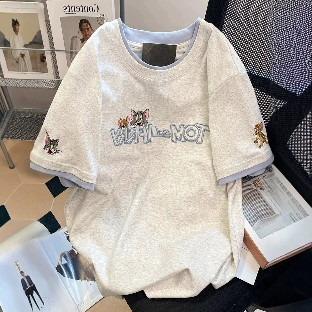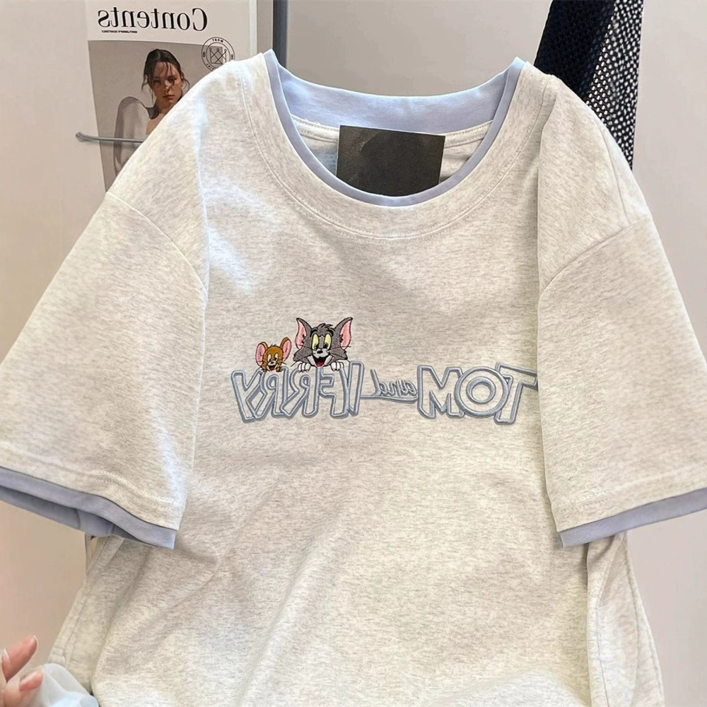클리어런스 특가 유럽판 틈새시장 만화 자수 반팔 티셔츠 여성 여름 투피스 스타일 배색 캐주얼 패션 상의스토어 가기
