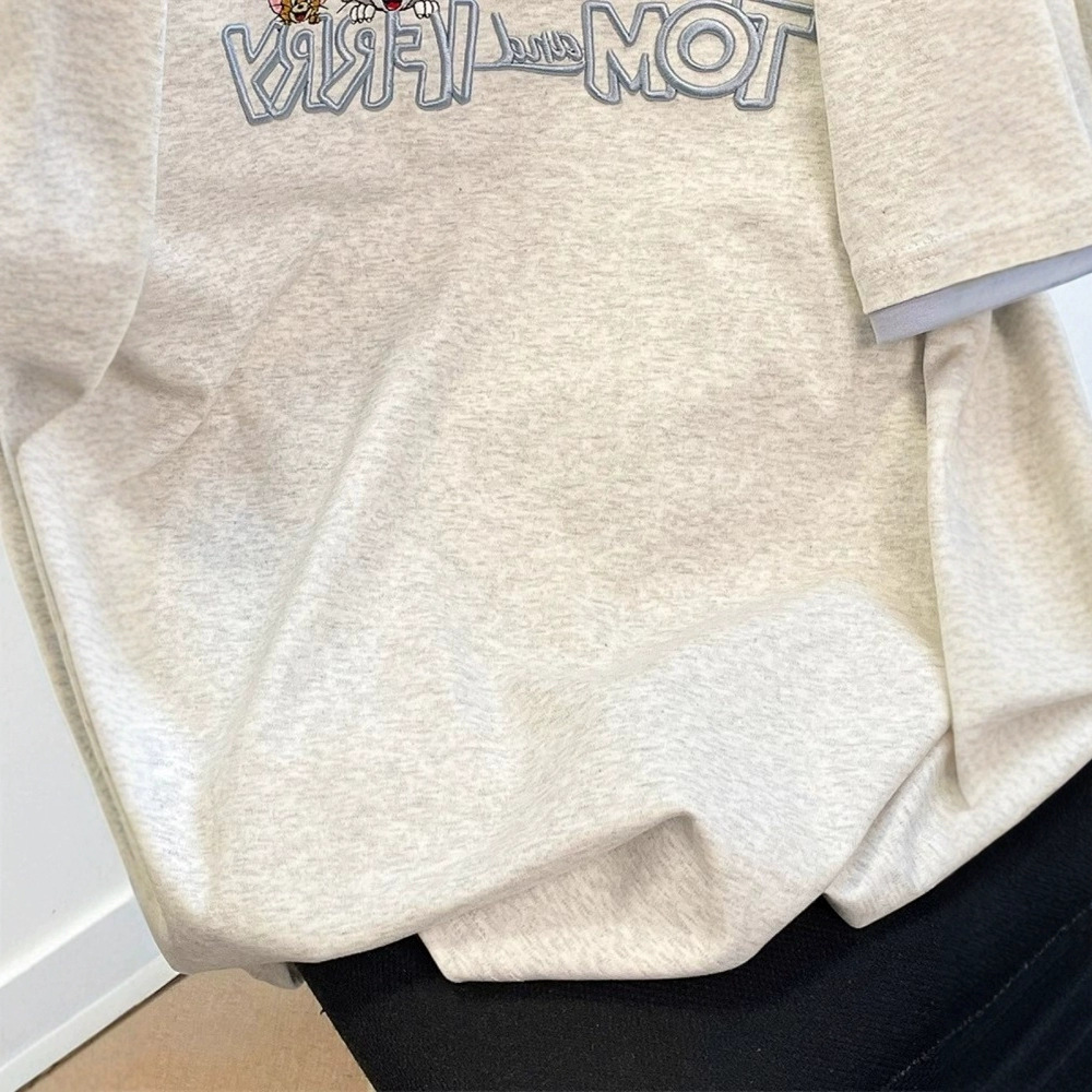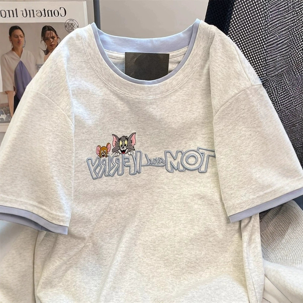 클리어런스 특가 유럽판 틈새시장 만화 자수 반팔 티셔츠 여성 여름 투피스 스타일 배색 캐주얼 패션 상의