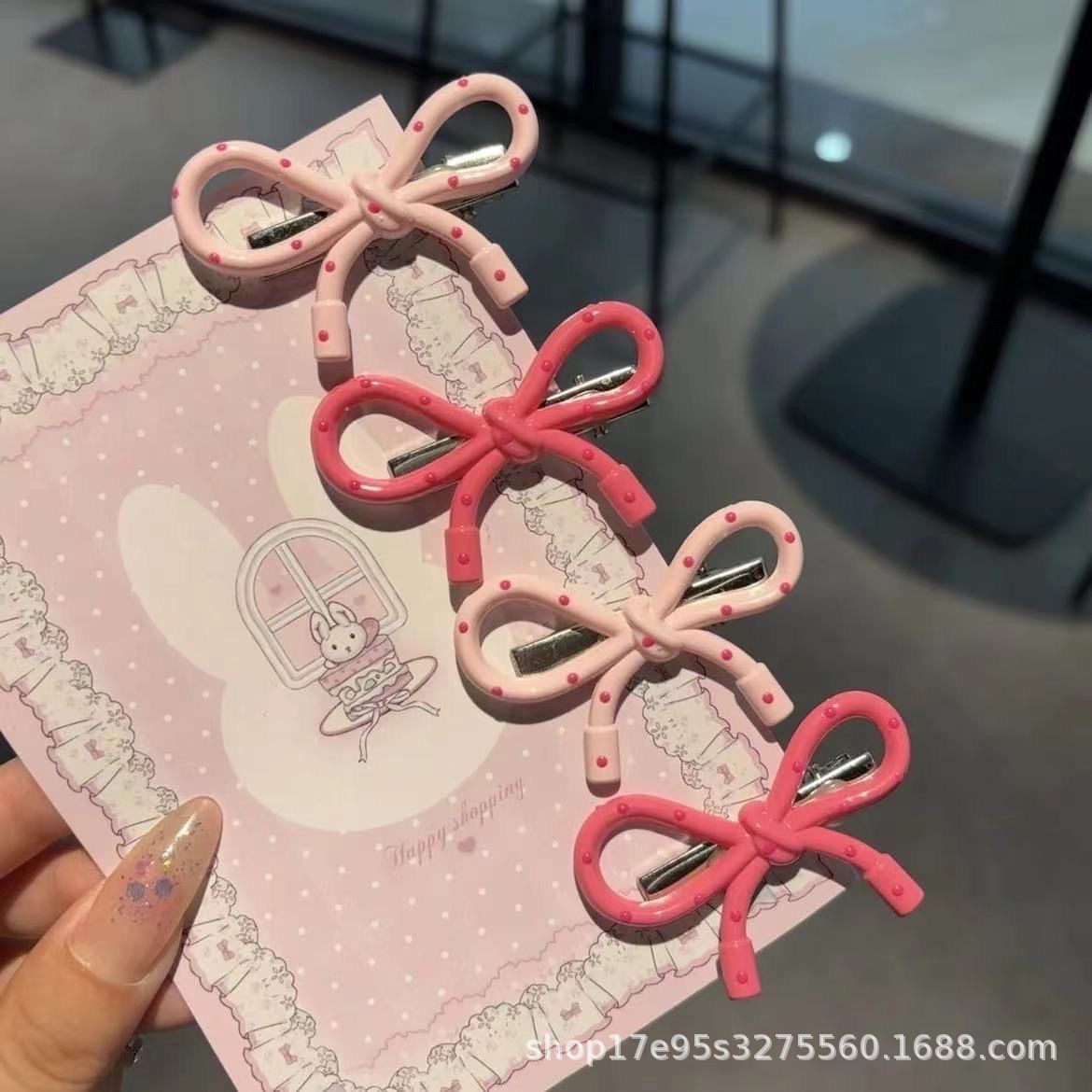 한국식 간단한 폴로도트 핑크 활 덕빌 클립 인스타그램 스타일 가을과 겨울 간단한 올매치 뱅 엣지 클립 니치 헤드웨어스토어 가기