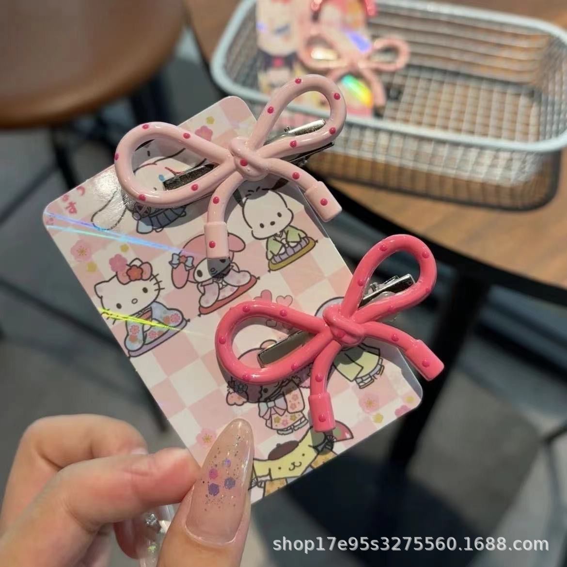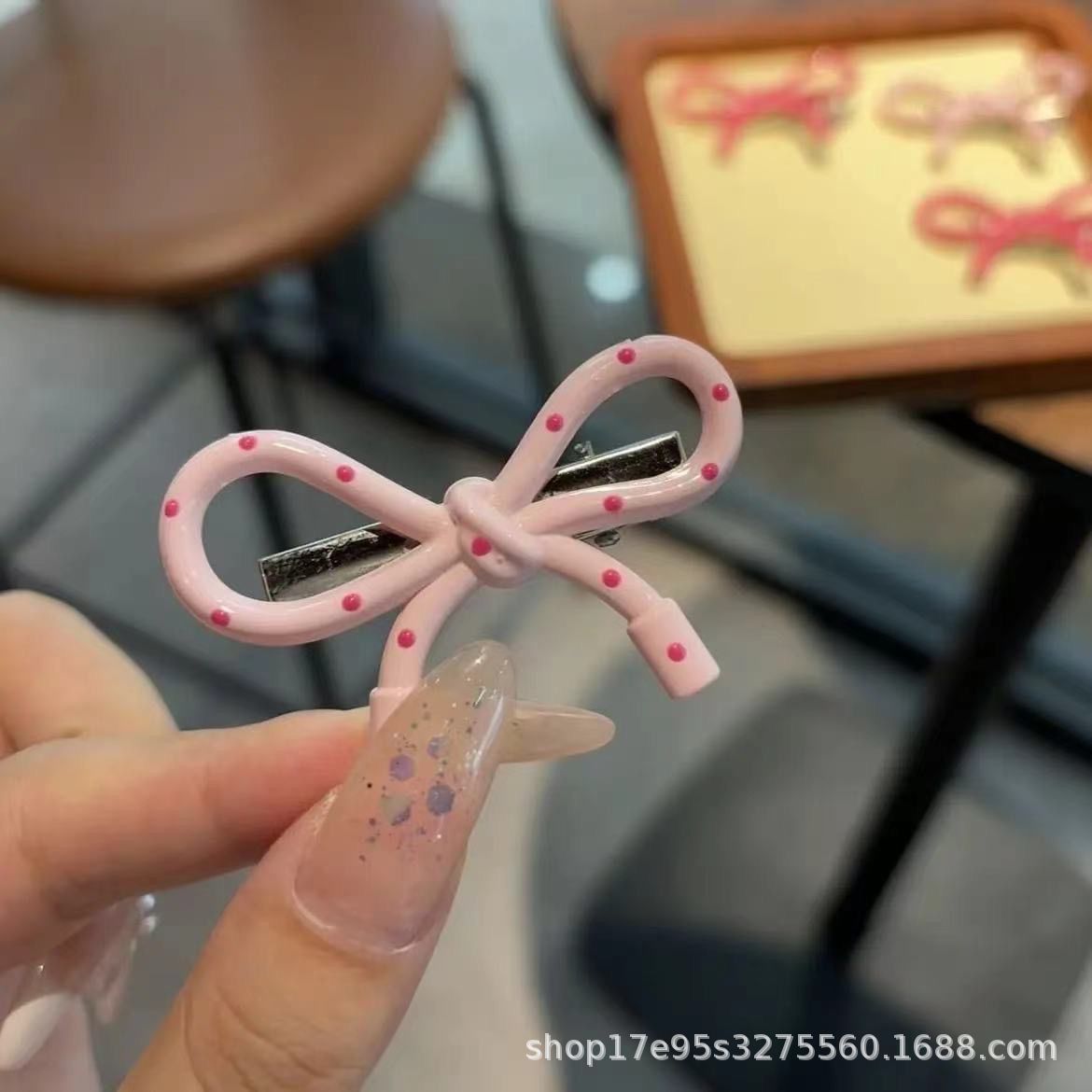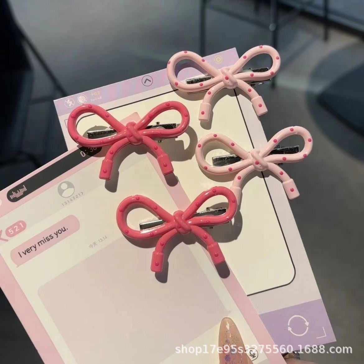 한국식 간단한 폴로도트 핑크 활 덕빌 클립 인스타그램 스타일 가을과 겨울 간단한 올매치 뱅 엣지 클립 니치 헤드웨어