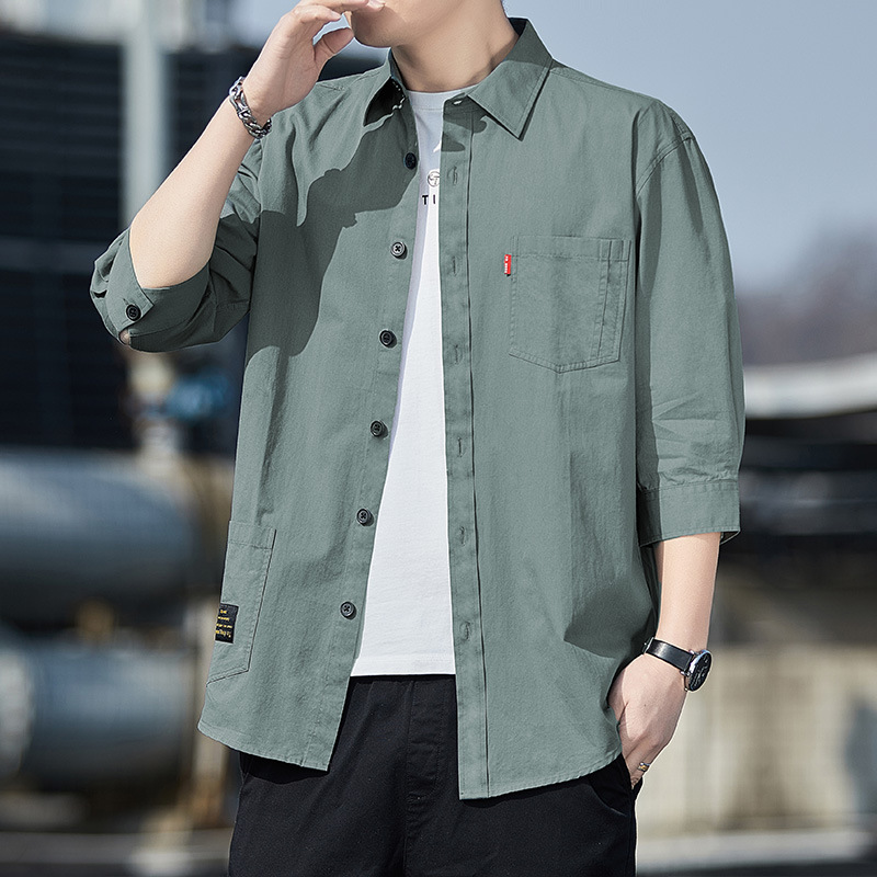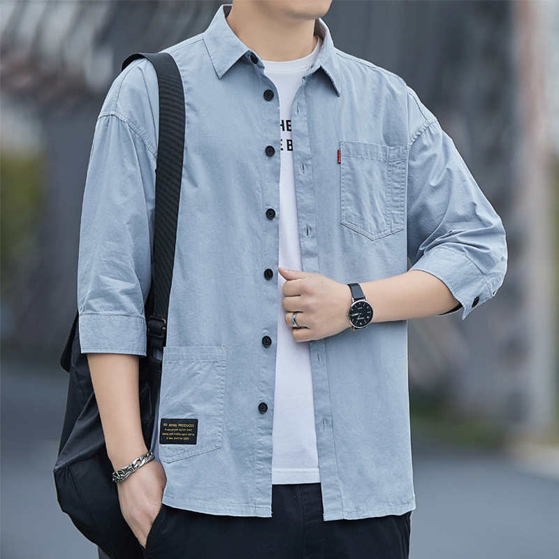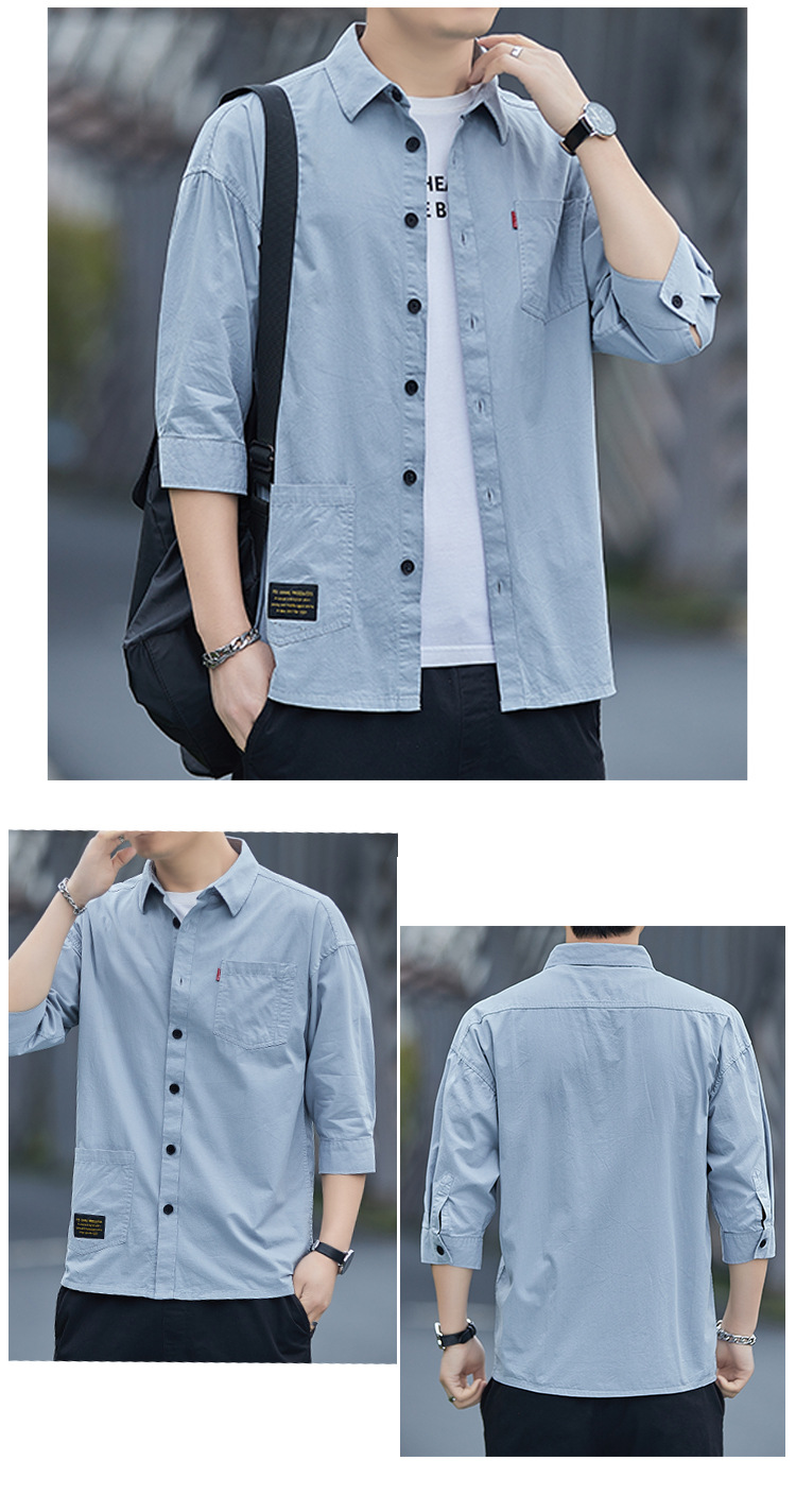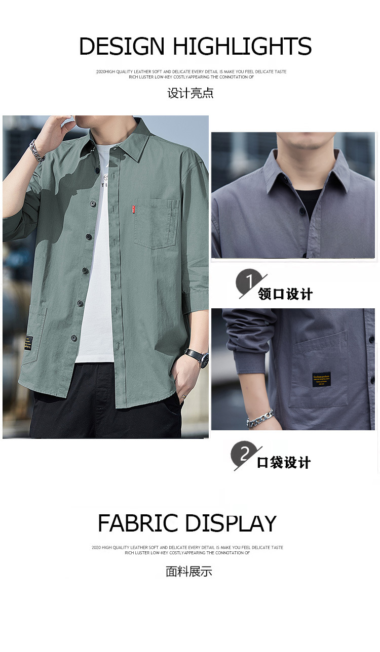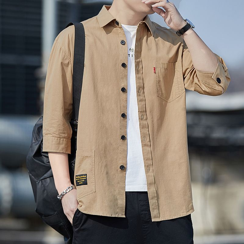 2025 트렌디 브랜드 반팔 재킷 남성 하이 7부 소매 셔츠 남성 캐주얼 루즈 버전 솔리드 컬러 반팔 셔츠 남성 의류