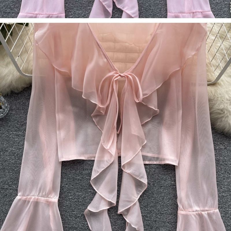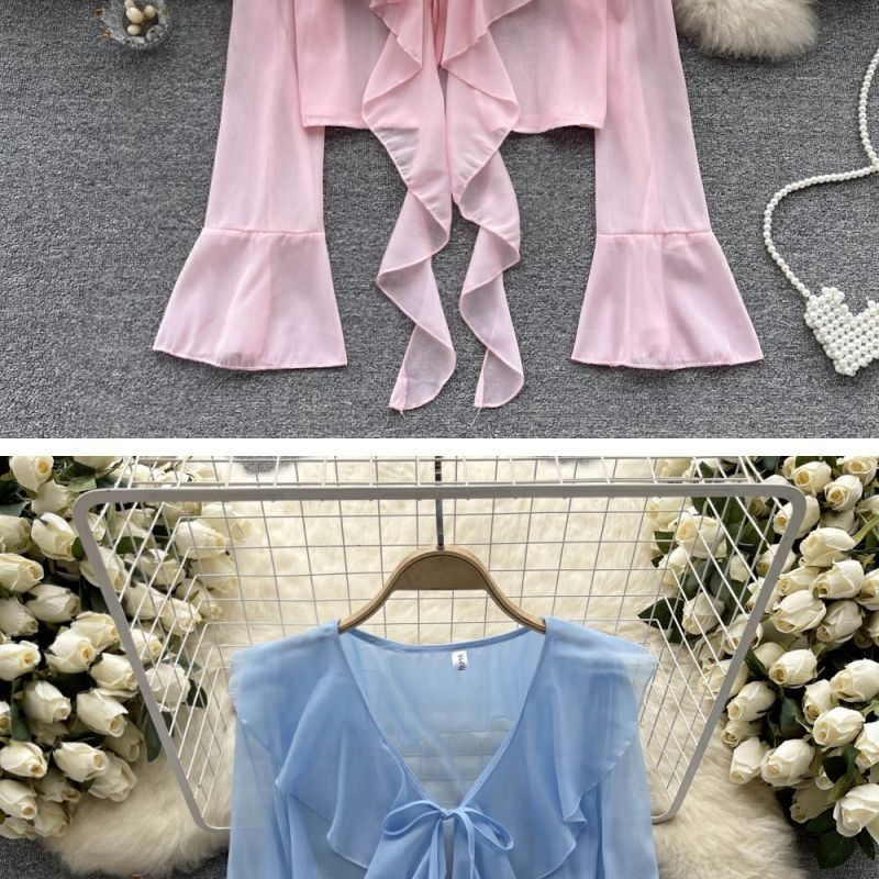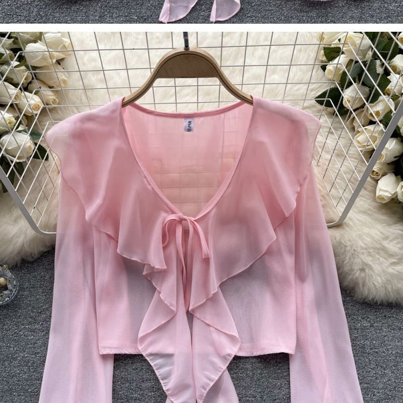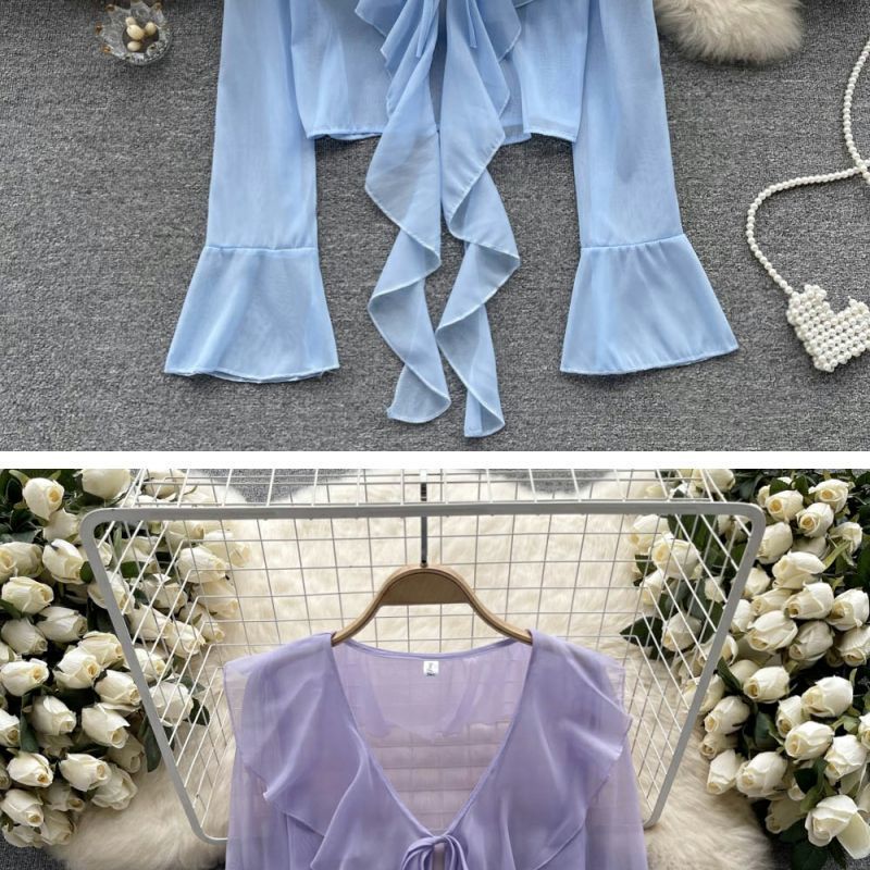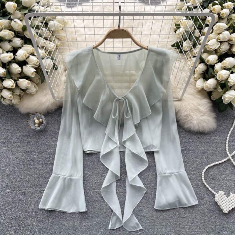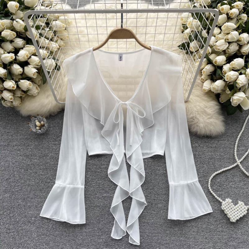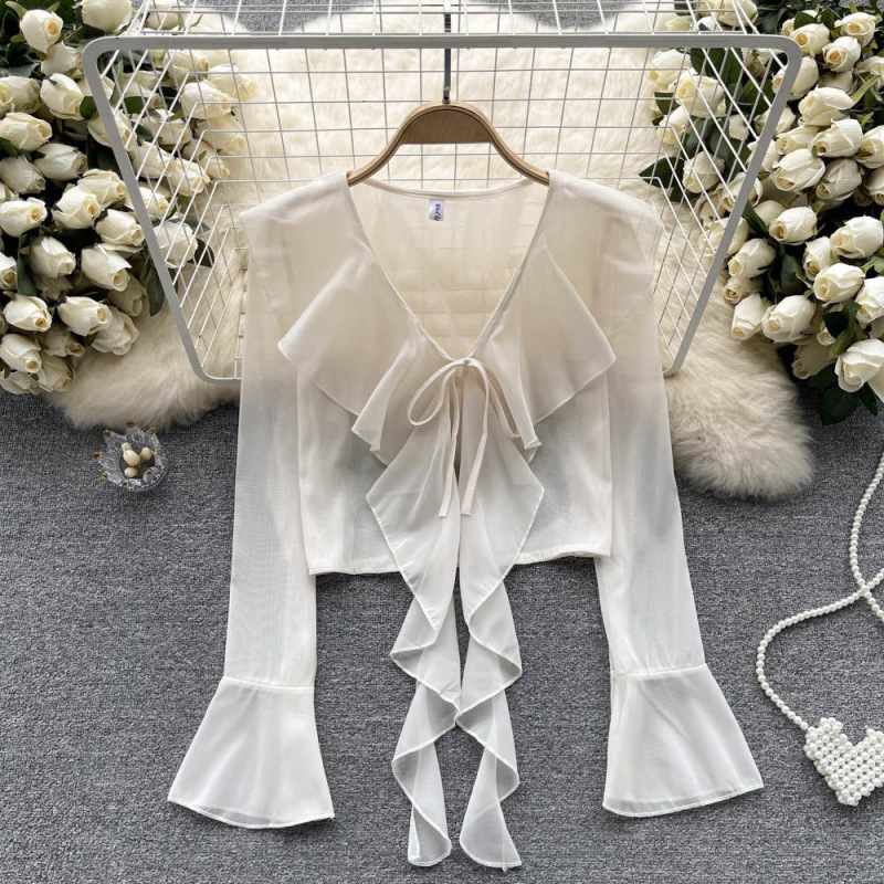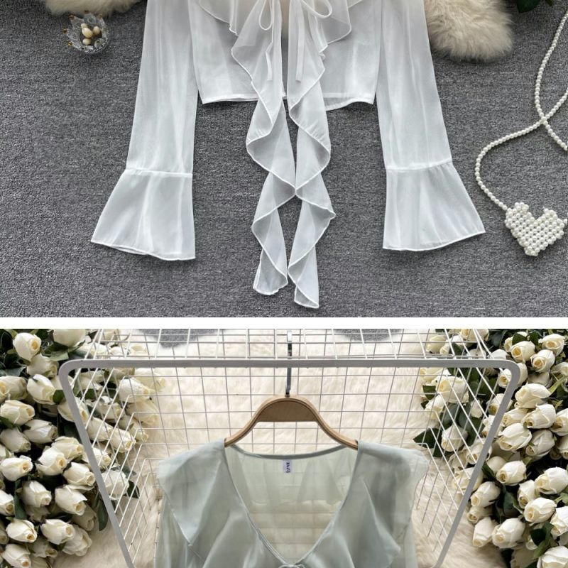 여름 여성을 위한 프렌치 긴팔 브이넥 러플 쉬폰 셔츠, 달콤한 탑, 니치 시크 셔츠~스토어 가기