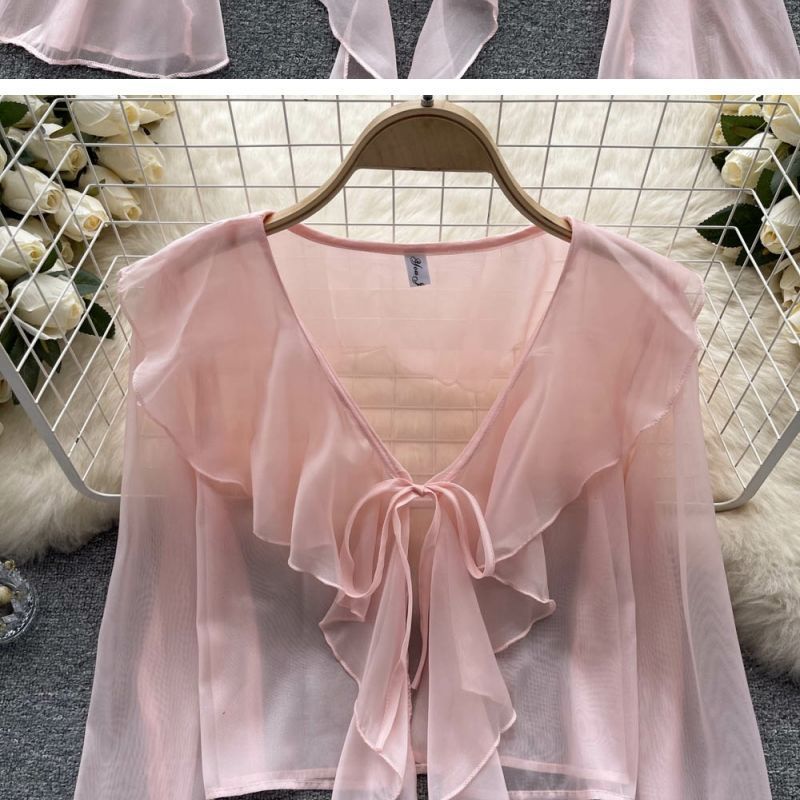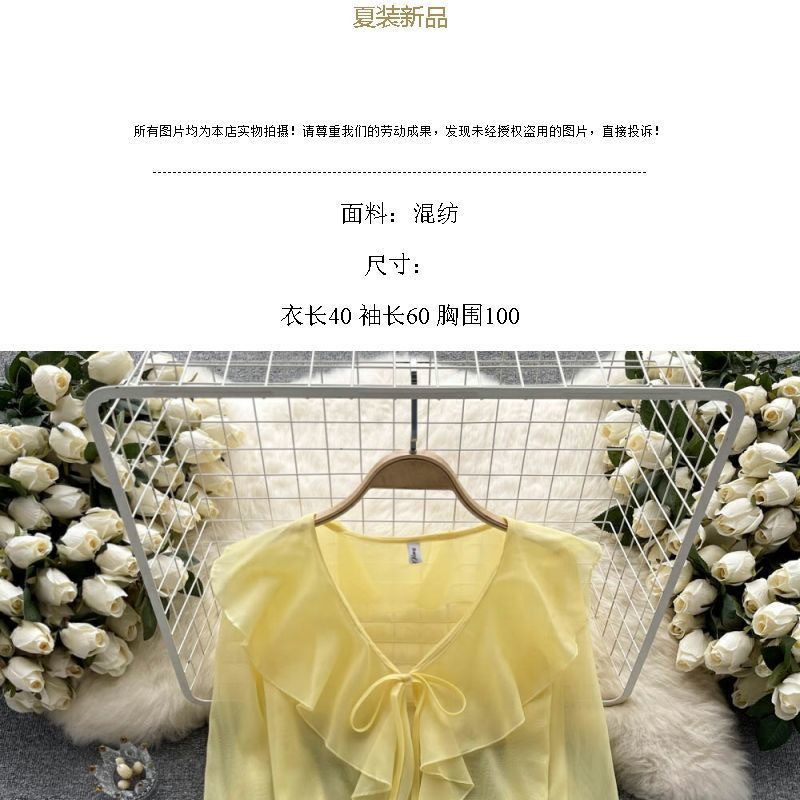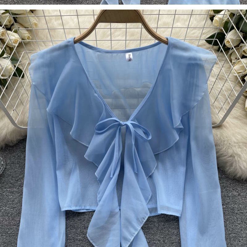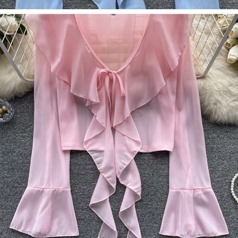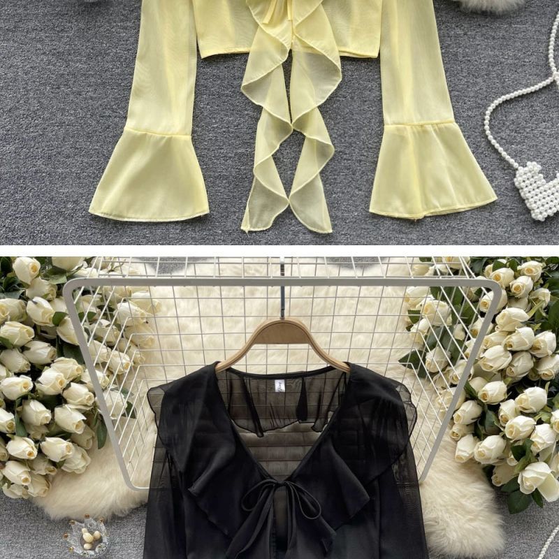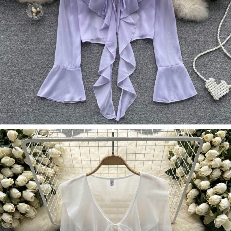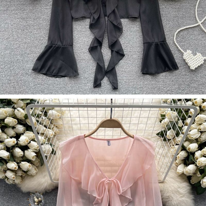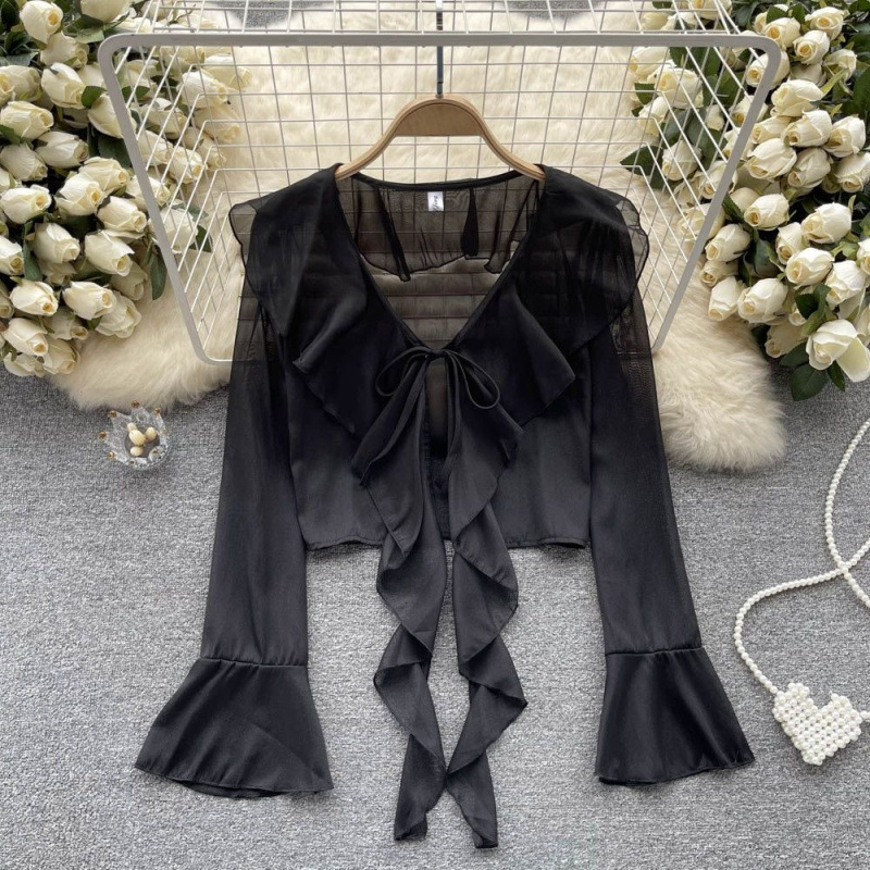 여름 여성을 위한 프렌치 긴팔 브이넥 러플 쉬폰 셔츠, 달콤한 탑, 니치 시크 셔츠~스토어 가기