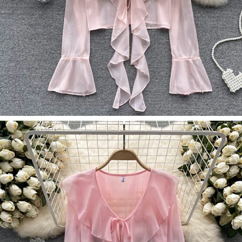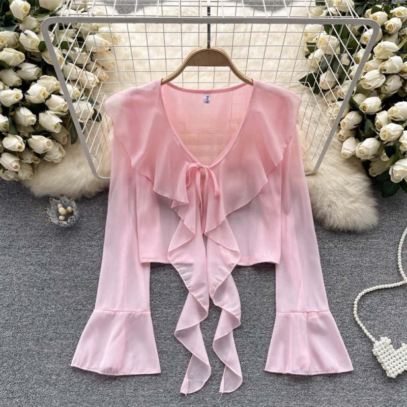 여름 여성을 위한 프렌치 긴팔 브이넥 러플 쉬폰 셔츠, 달콤한 탑, 니치 시크 셔츠~