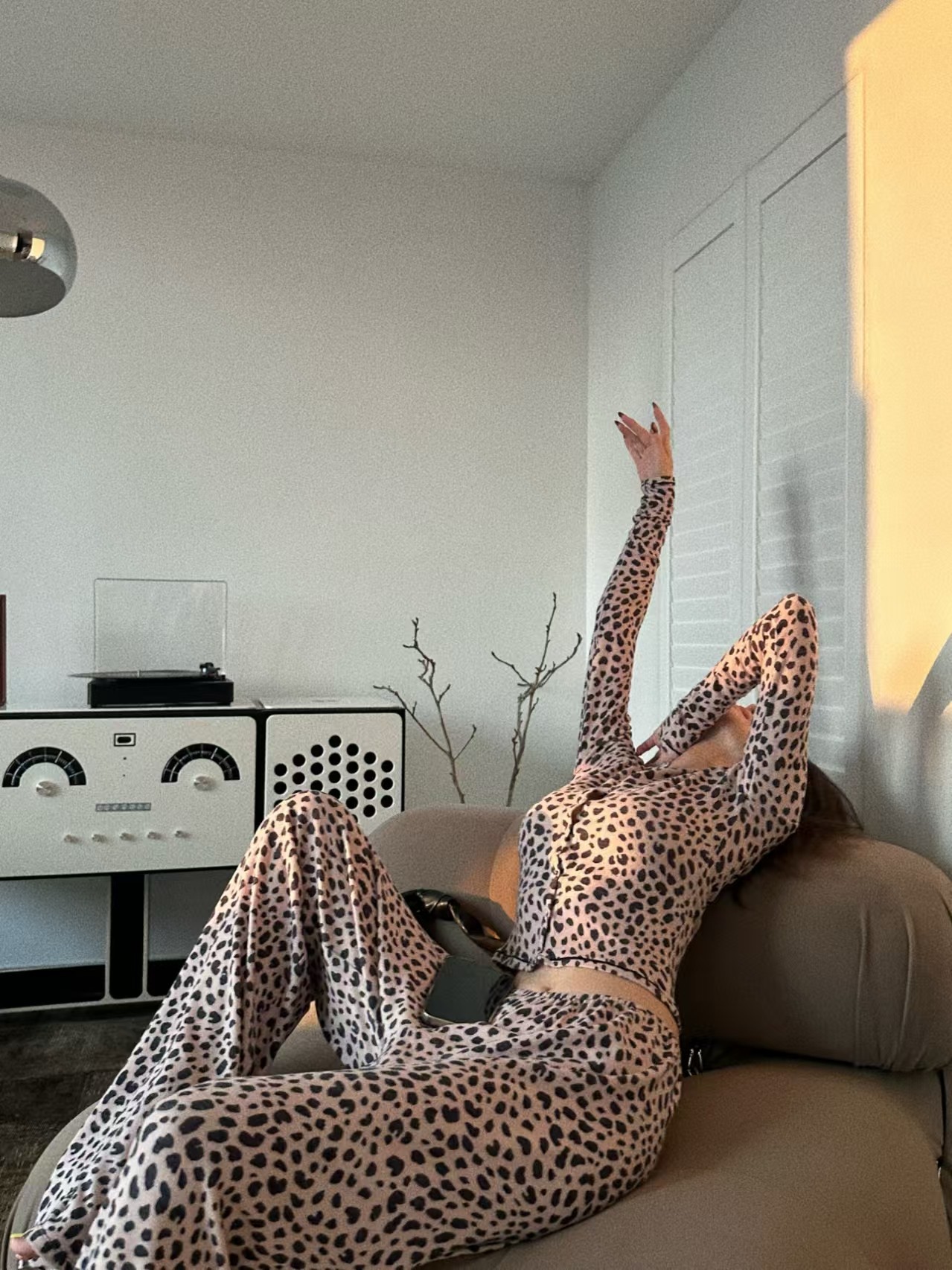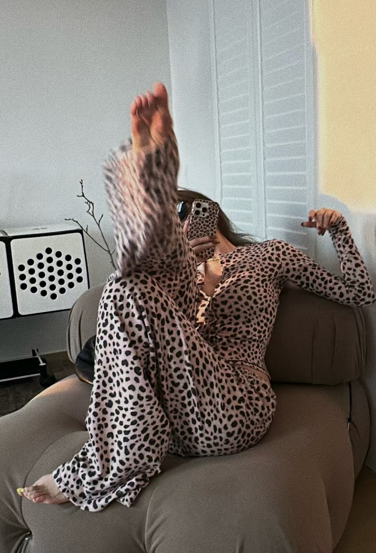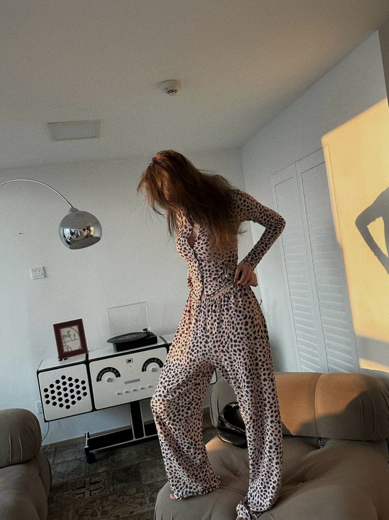 봄과 여름 카키색 표범 인쇄 새로운 잠옷 여성 인터넷 연예인 스타일 한국 패션 가을 홈웨어 세트 제조 업체 도매스토어 가기