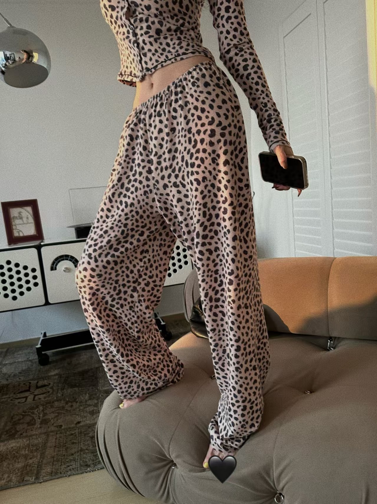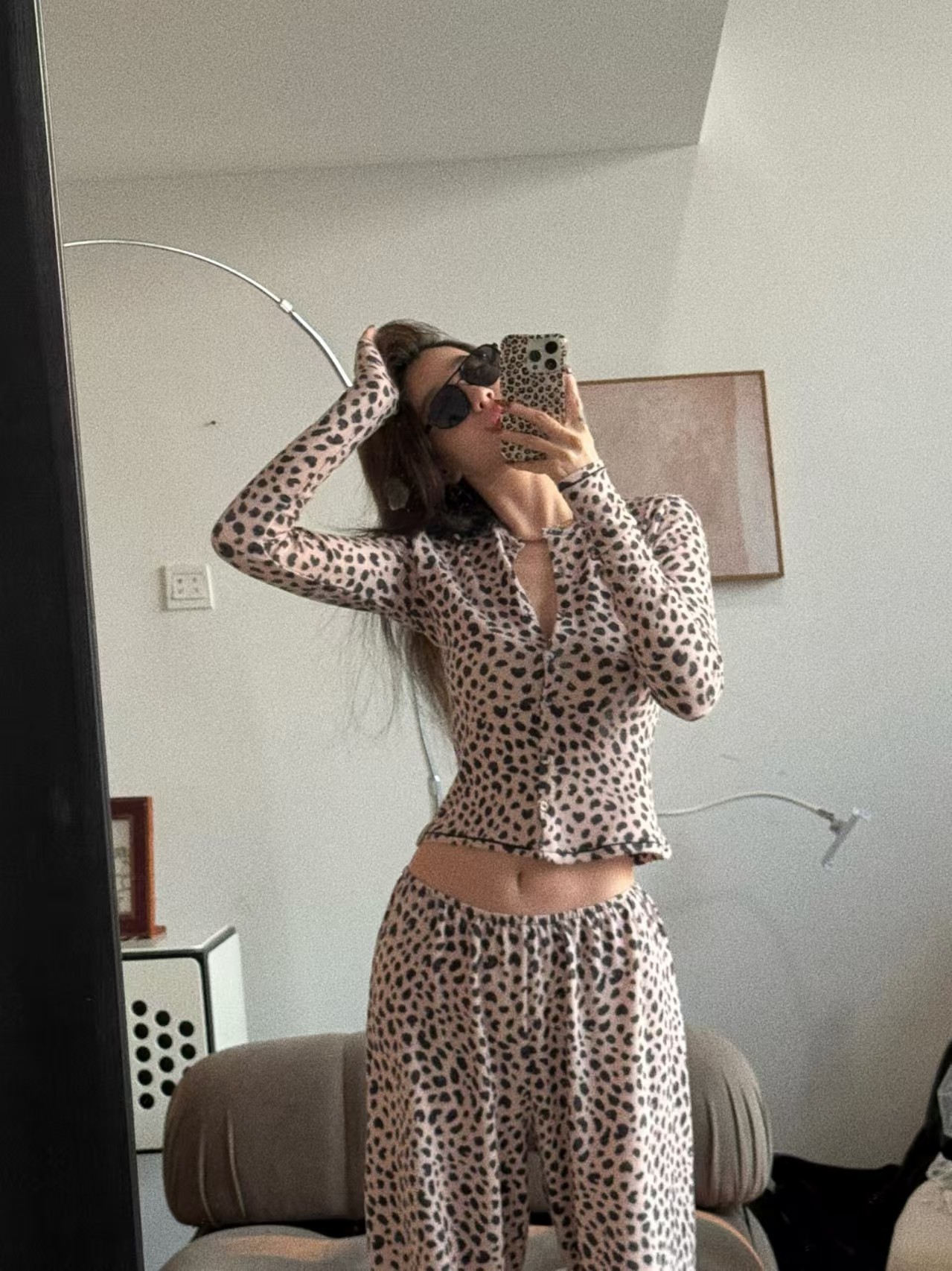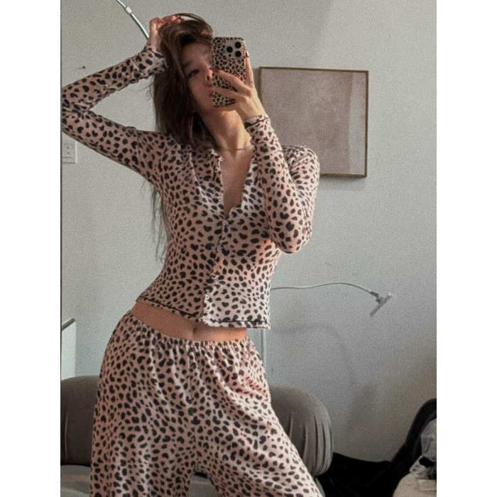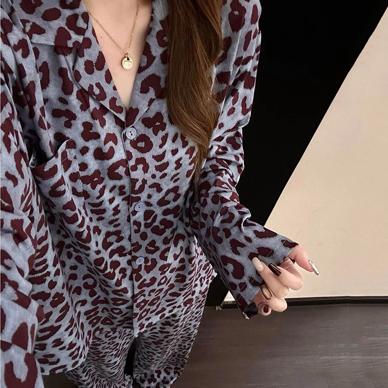 봄과 여름 카키색 표범 인쇄 새로운 잠옷 여성 인터넷 연예인 스타일 한국 패션 가을 홈웨어 세트 제조 업체 도매