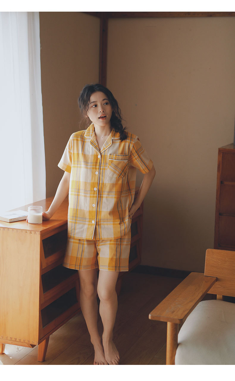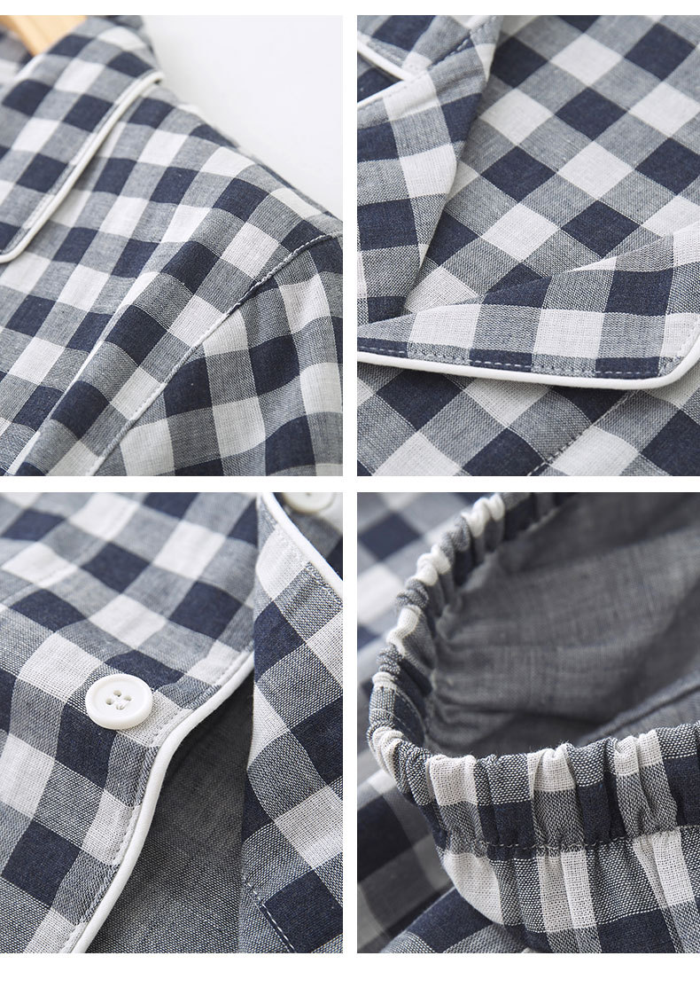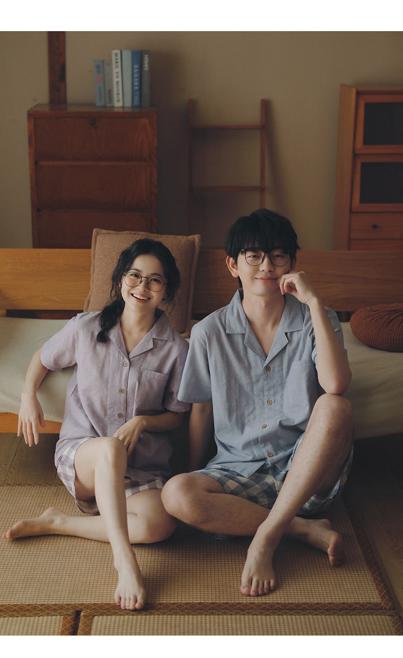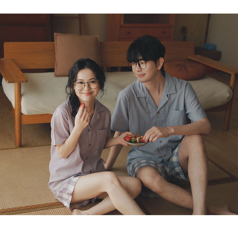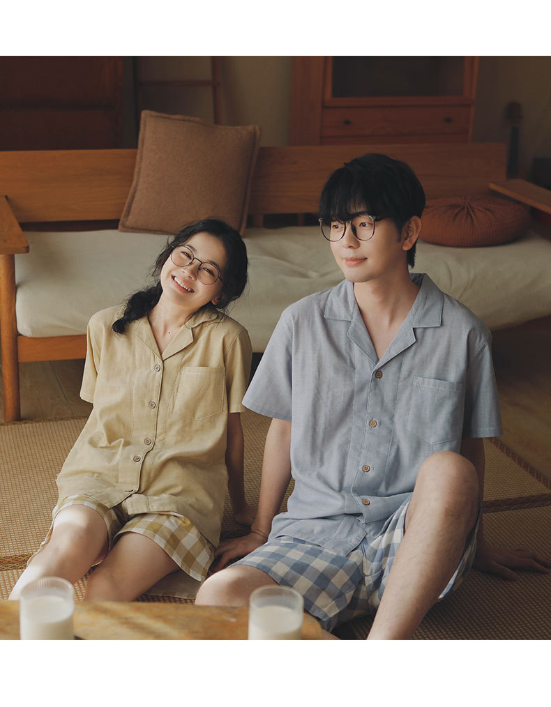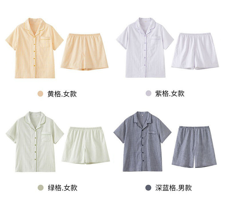 무인쇄 잠옷 여성용 여름 순면 거즈 반팔 반바지 세트 남성용 순면 체크무늬 홈웨어 외출용 가능스토어 가기