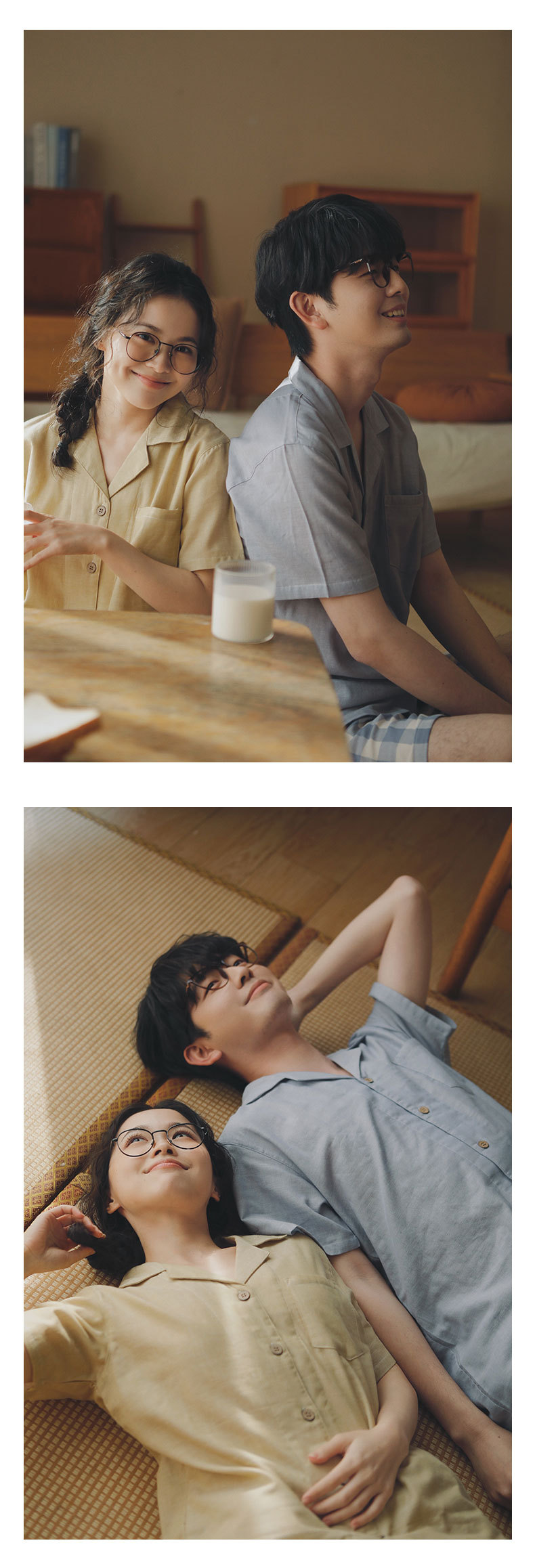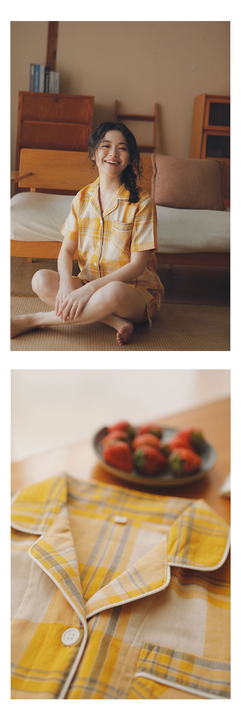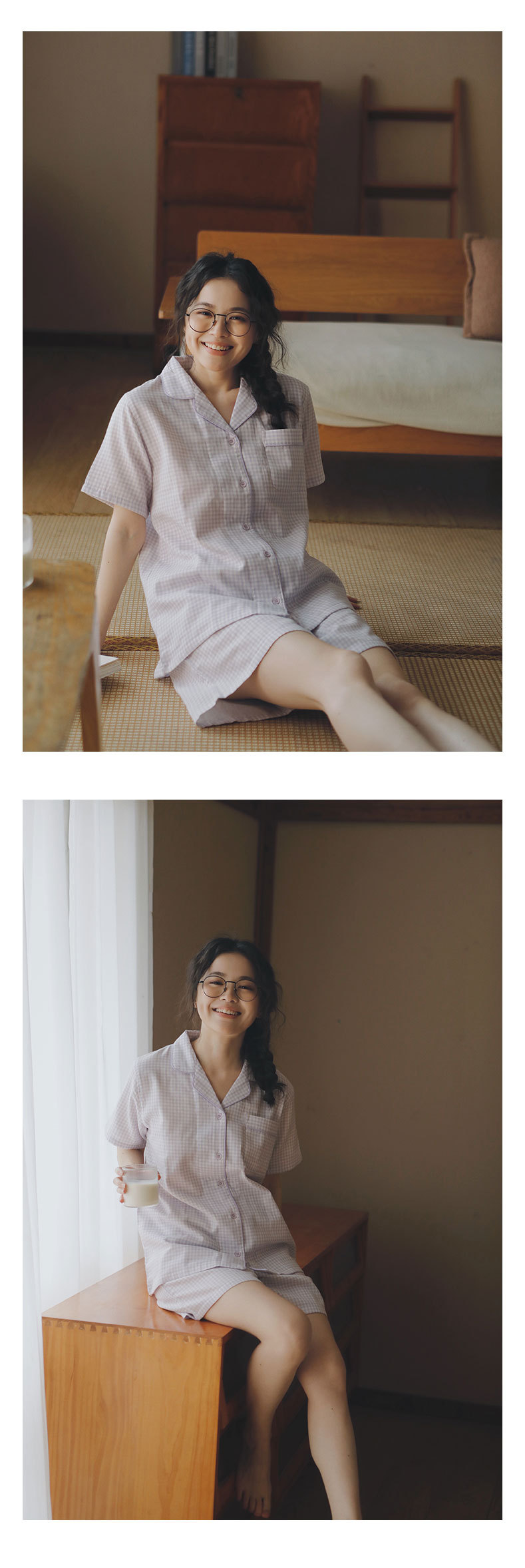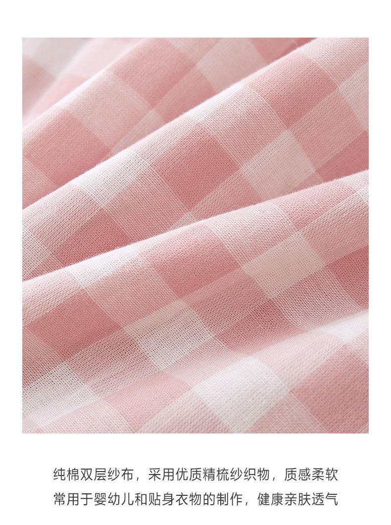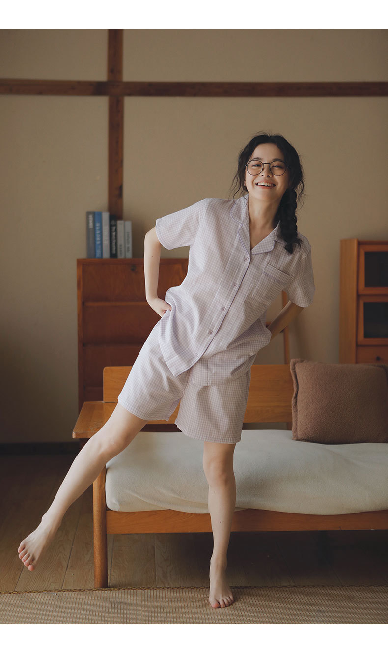 무인쇄 잠옷 여성용 여름 순면 거즈 반팔 반바지 세트 남성용 순면 체크무늬 홈웨어 외출용 가능스토어 가기