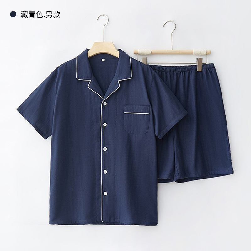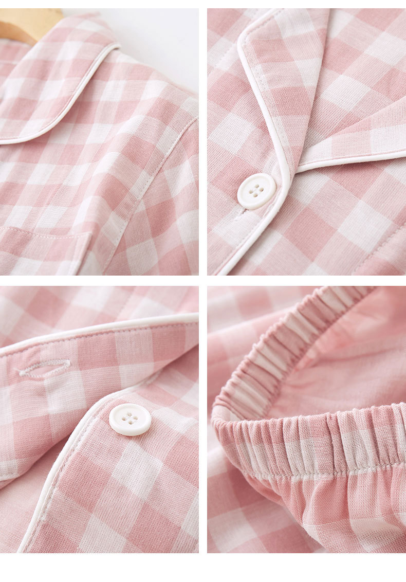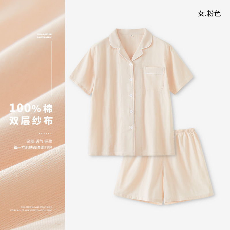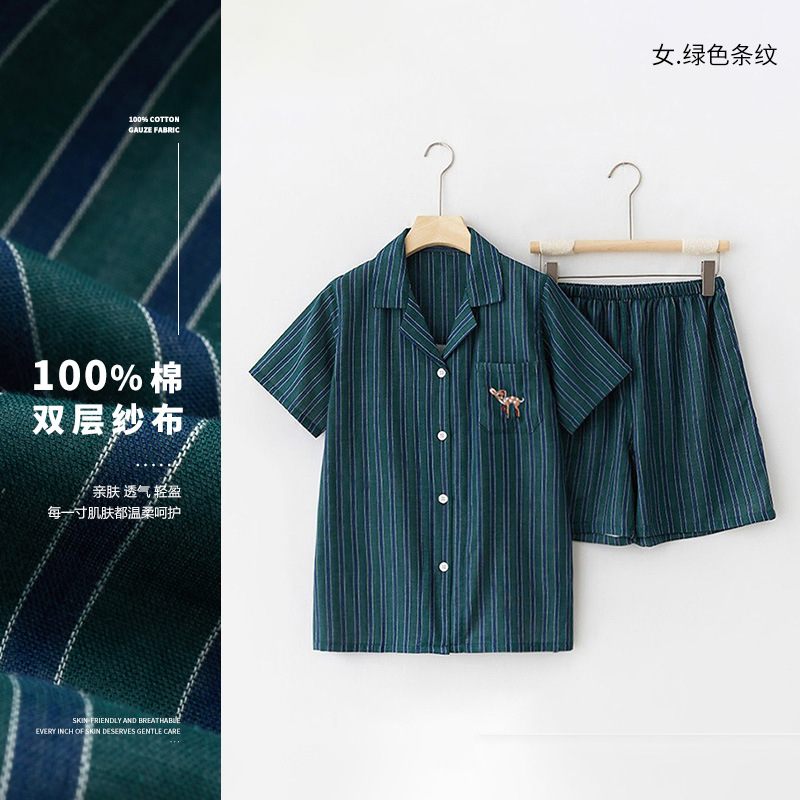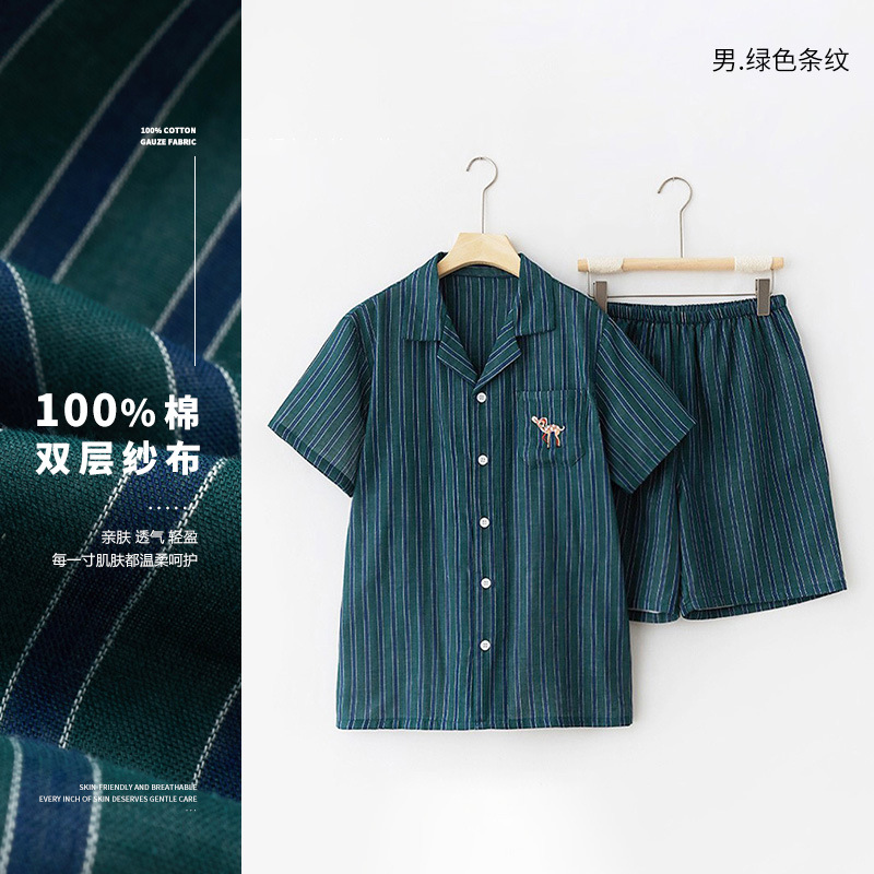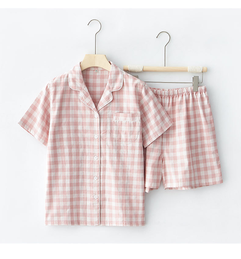 무인쇄 잠옷 여성용 여름 순면 거즈 반팔 반바지 세트 남성용 순면 체크무늬 홈웨어 외출용 가능