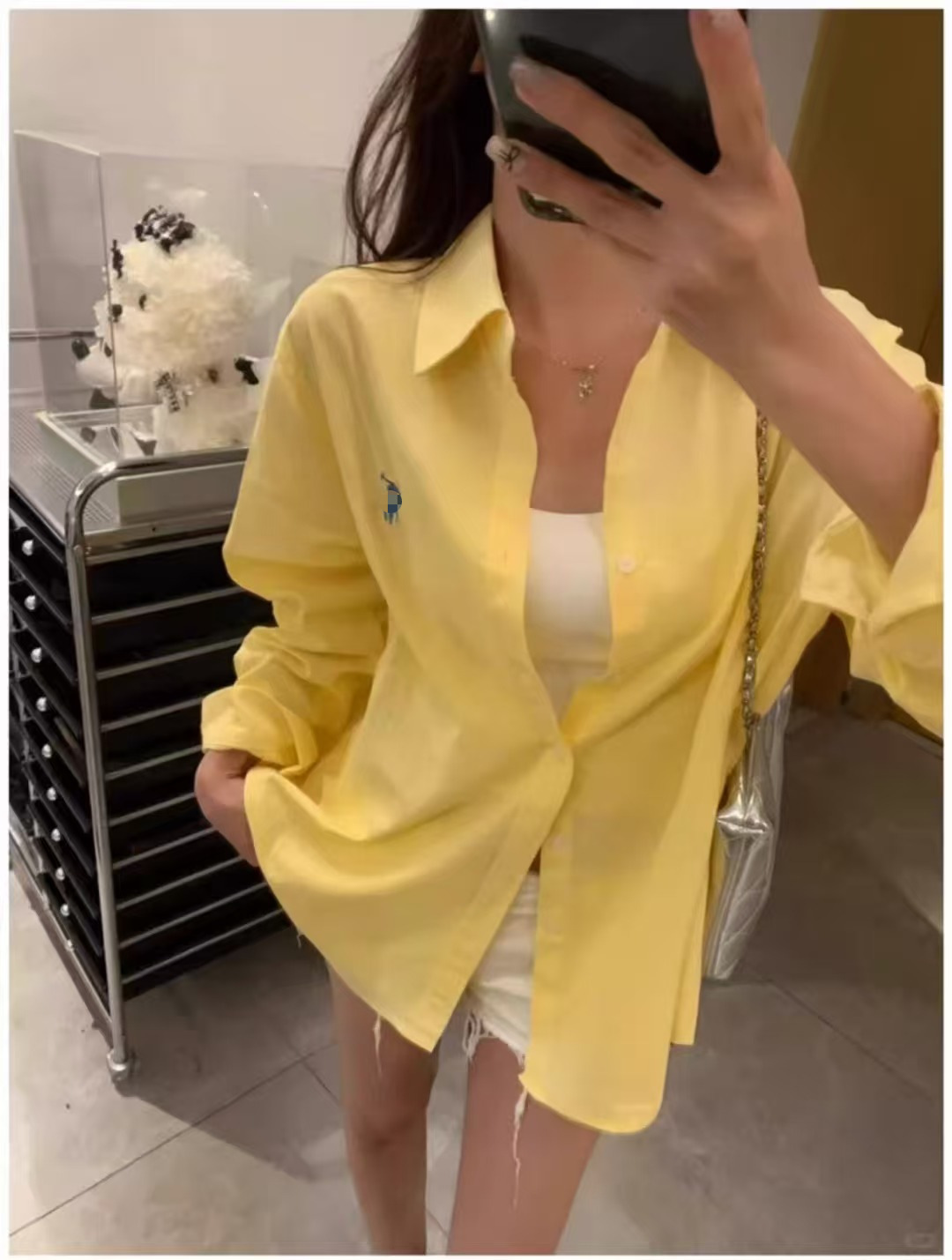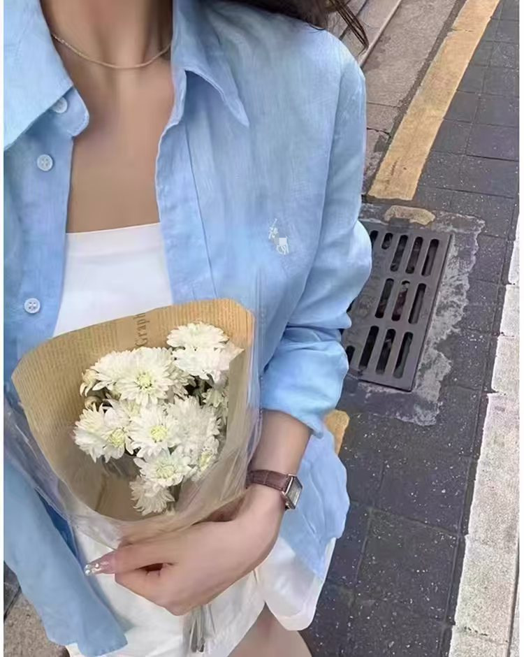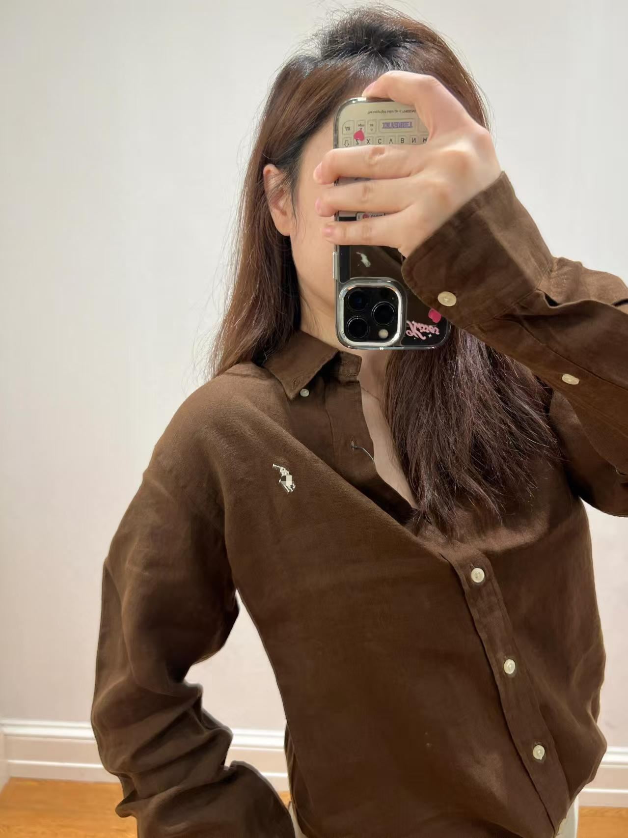 라프 포니 로고 자수 리넨 셔츠 탑, 버튼 POLO 칼라, 다용도 패셔너블 캐주얼 긴팔, 상큼한 스타일 여성용스토어 가기