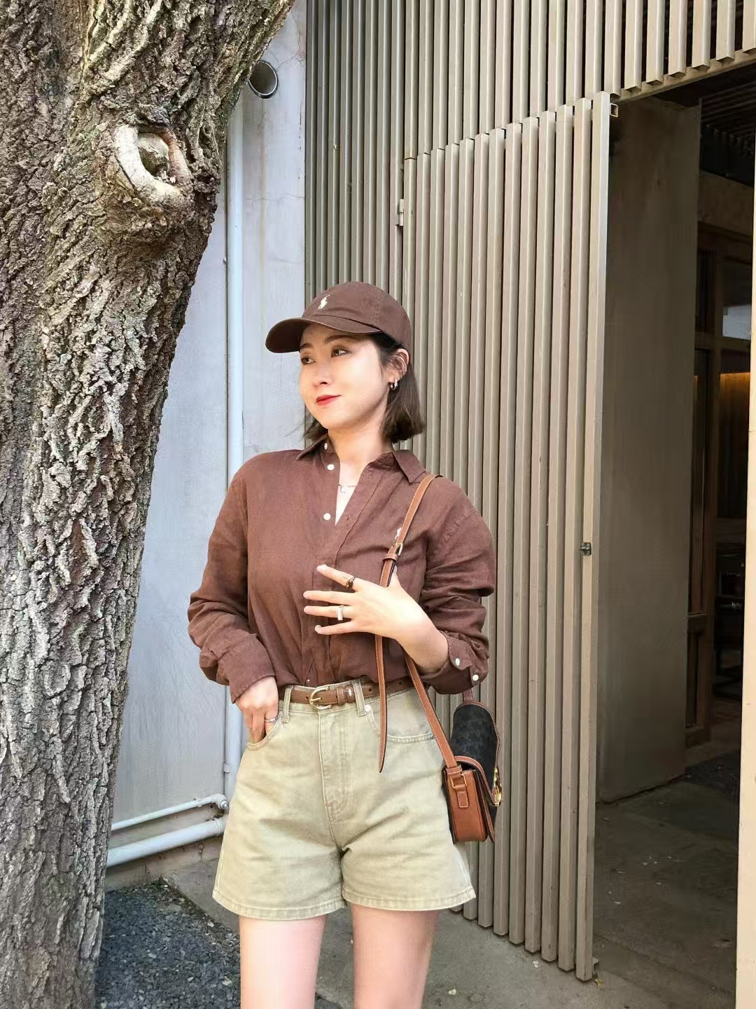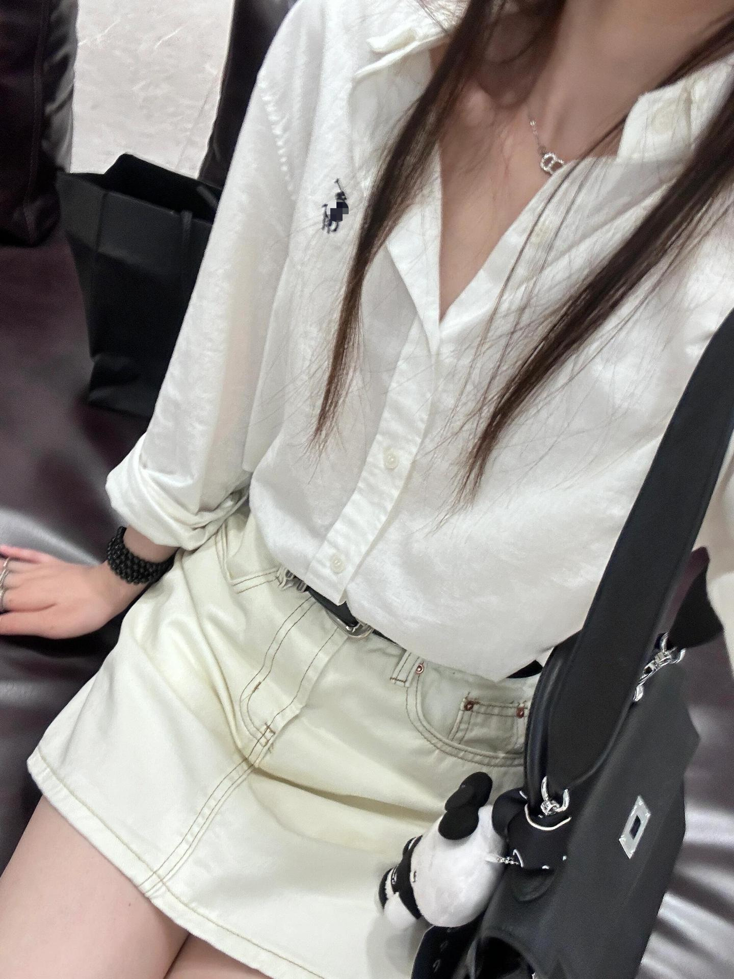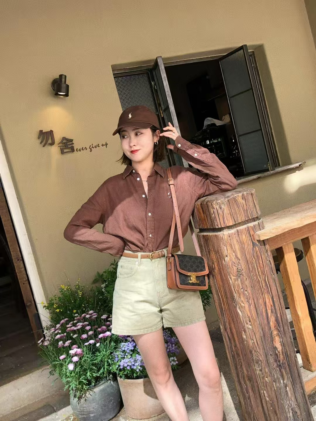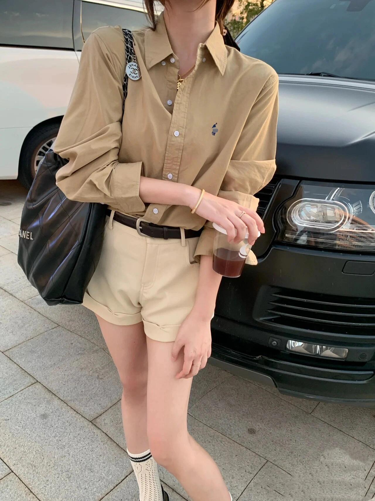 라프 포니 로고 자수 리넨 셔츠 탑, 버튼 POLO 칼라, 다용도 패셔너블 캐주얼 긴팔, 상큼한 스타일 여성용