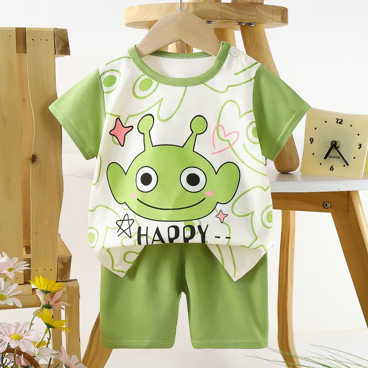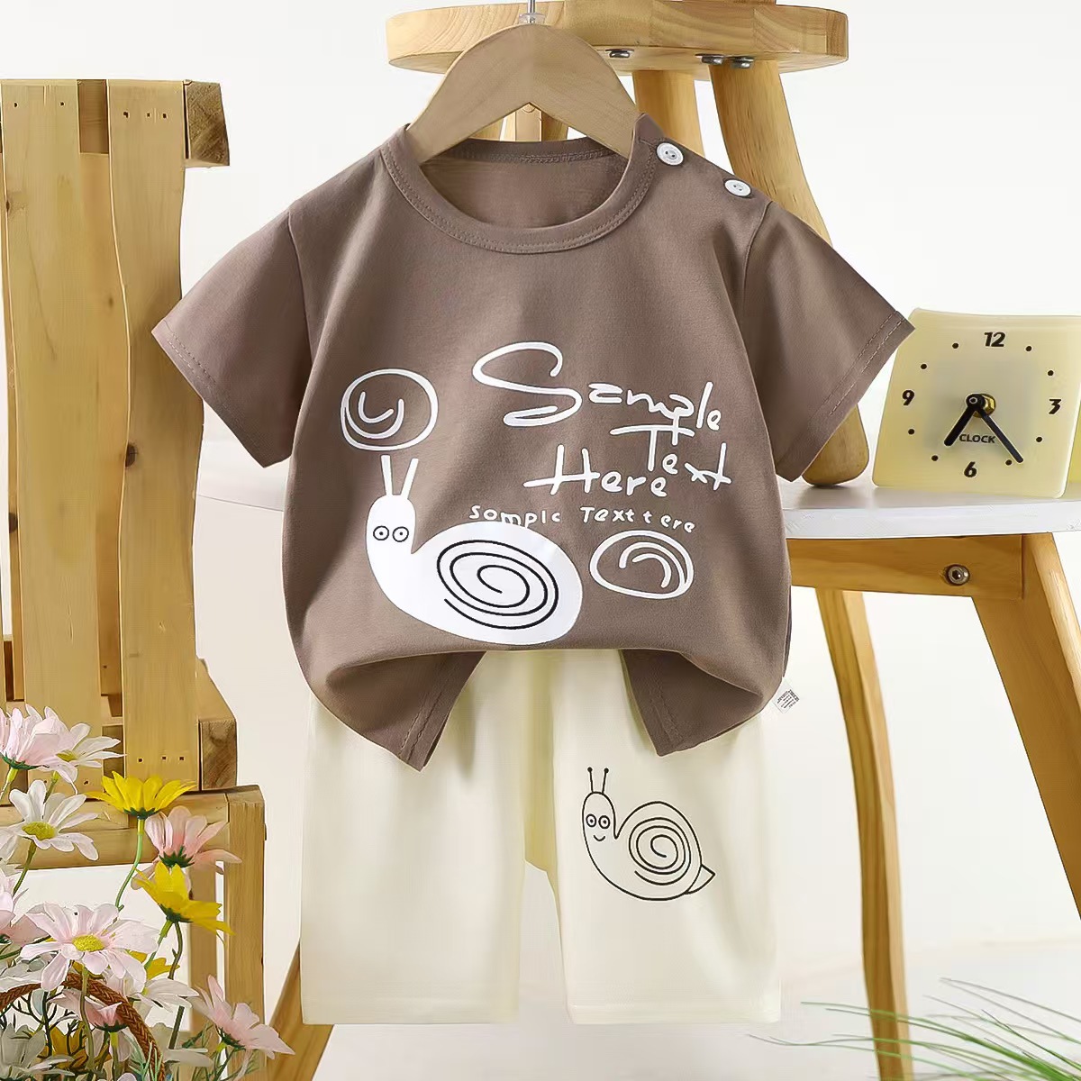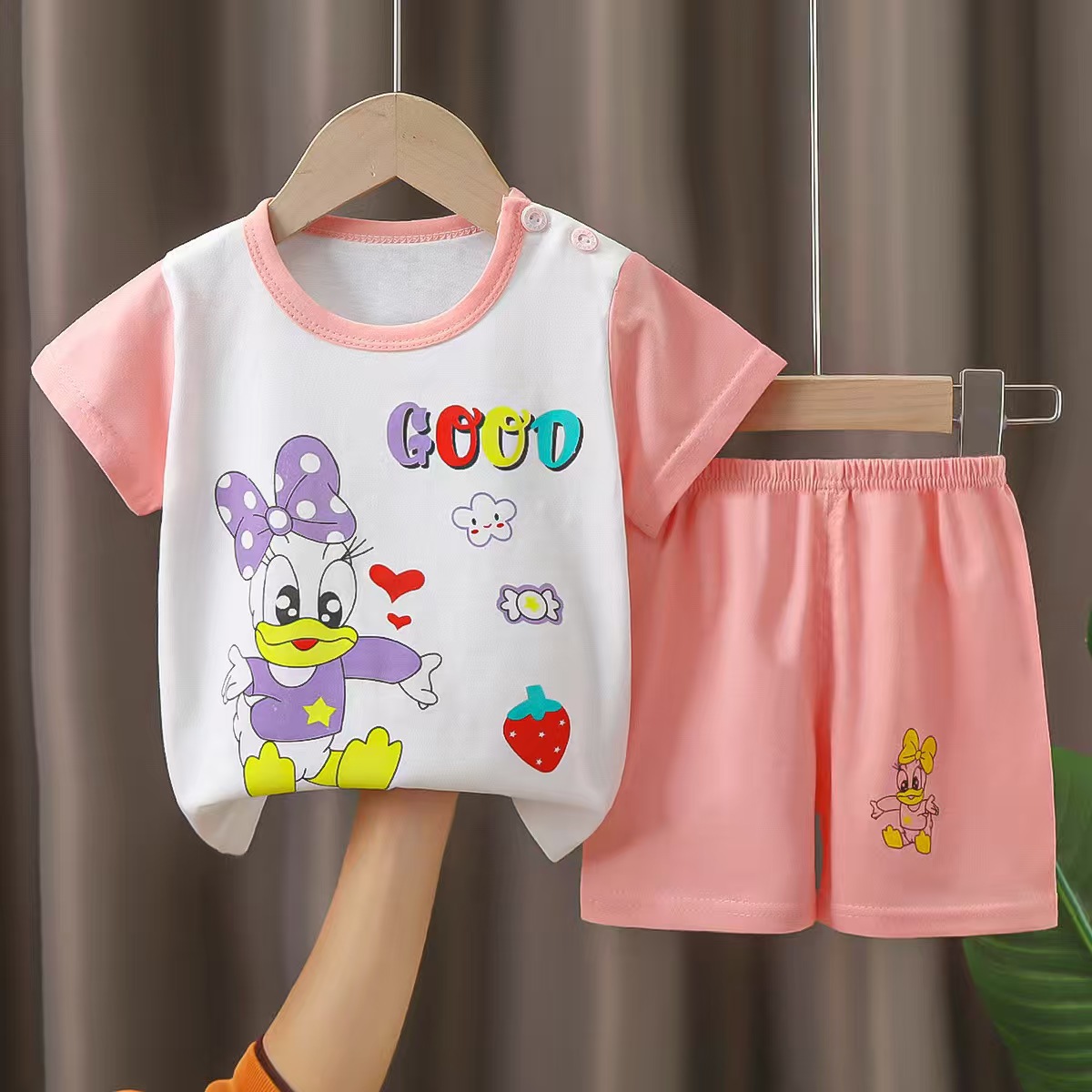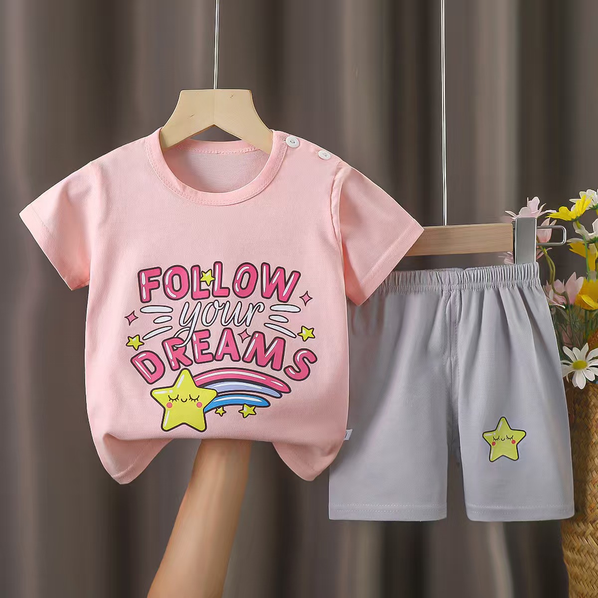 여름 신상 아동용 티셔츠 반팔 반바지 패션 세트, 순면 티셔츠, 남아 여아용 얇은 트렌디 상품 도매스토어 가기