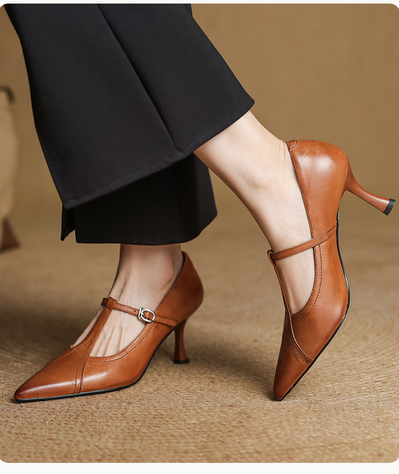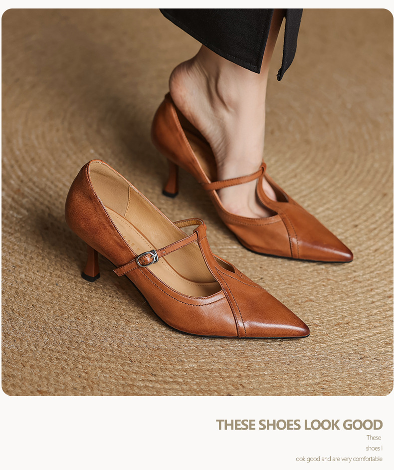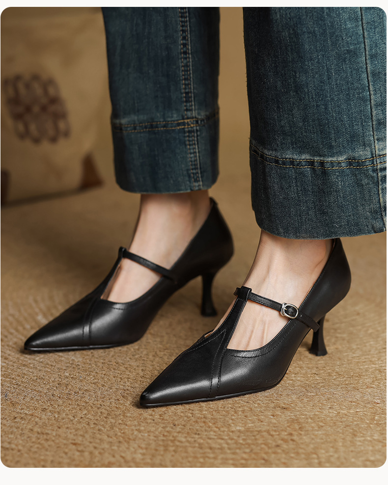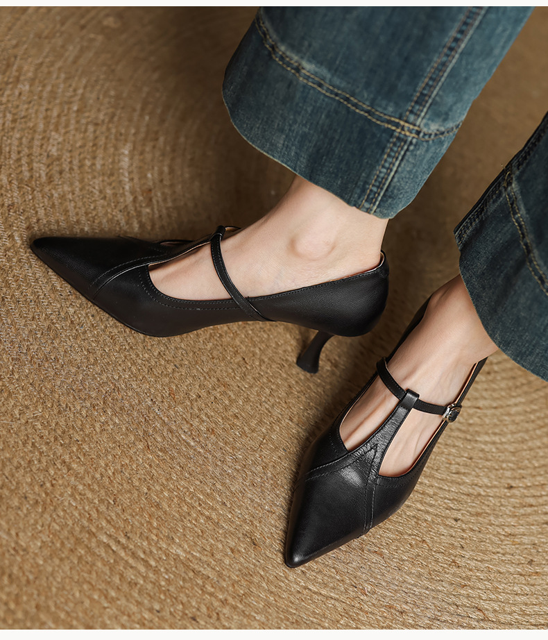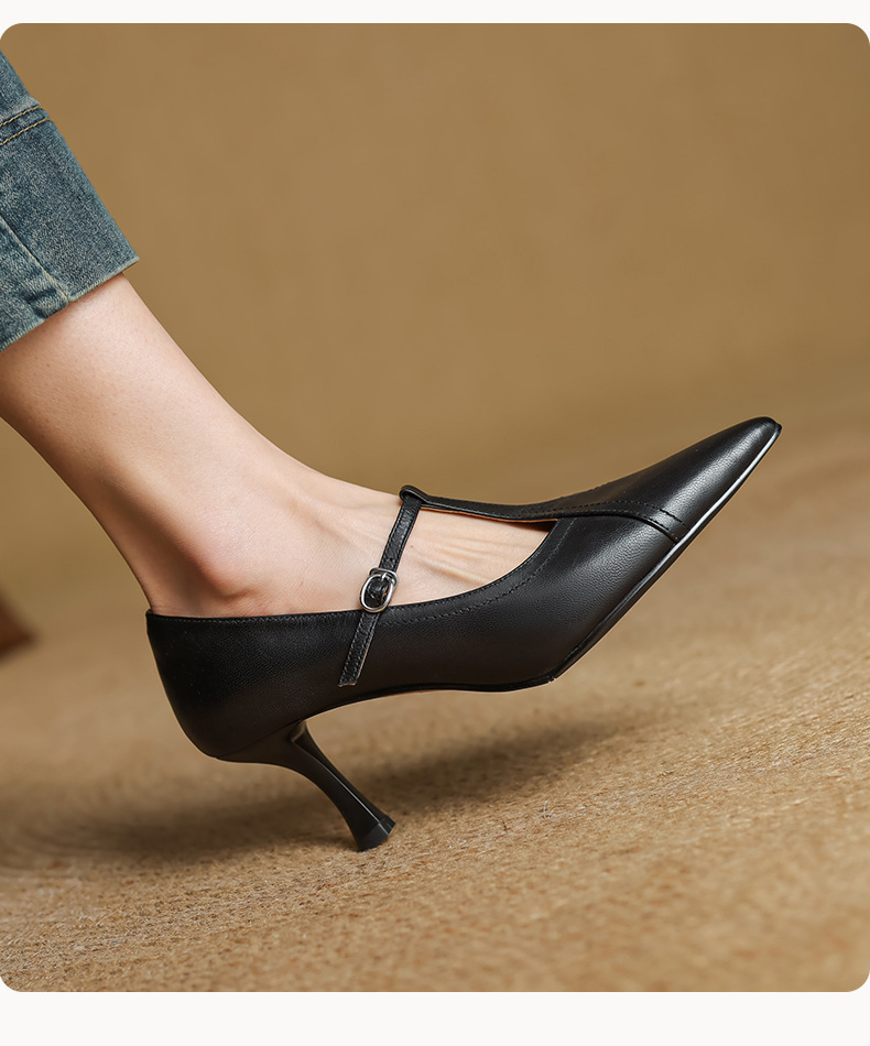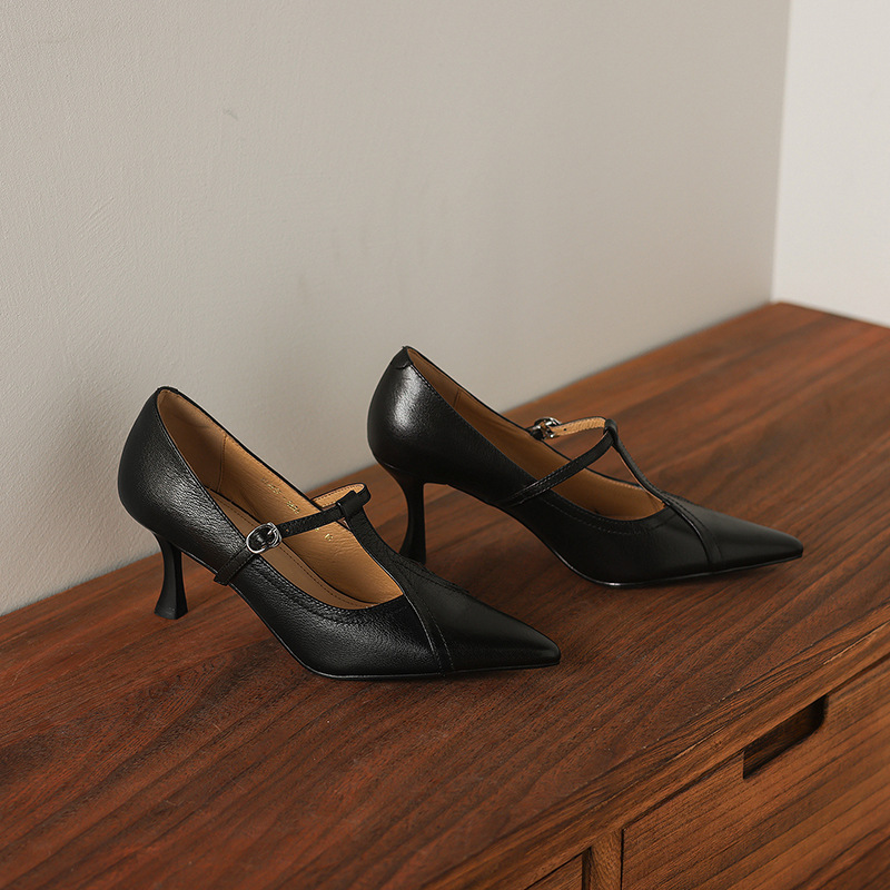 7cm 하이힐 양가죽 뾰족한 발가락 얕은 입 싱글 레이어 신발 2025 새로운 여성 신발 한국 스타일 T 자형 버클 얇은 뒤꿈치 4 시즌 신발스토어 가기