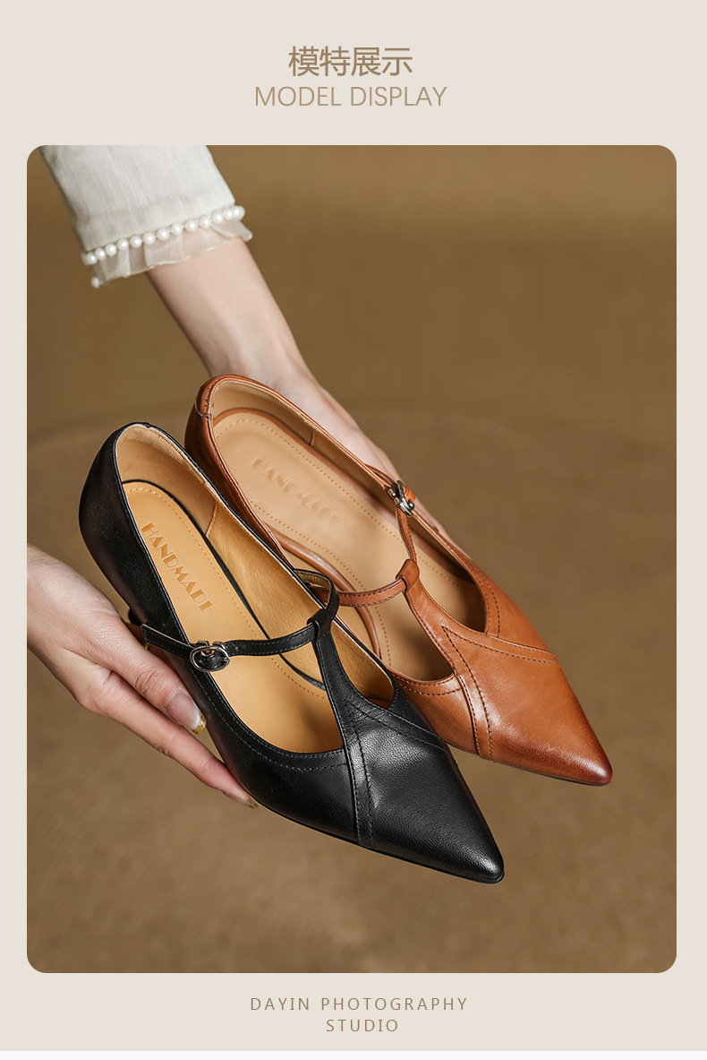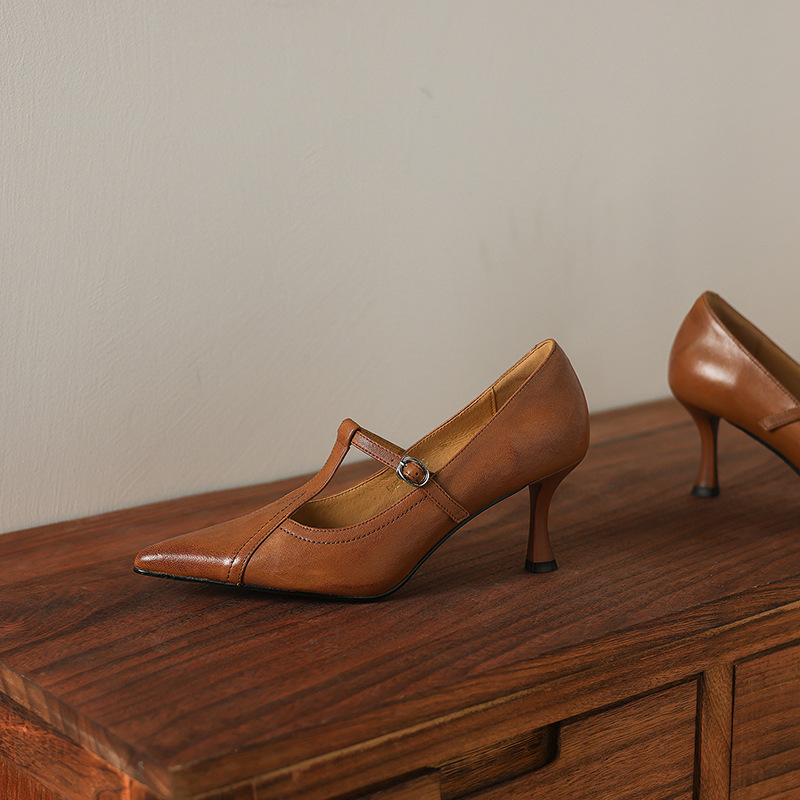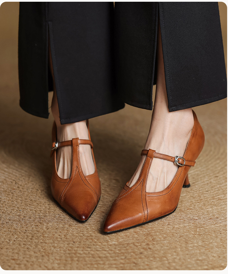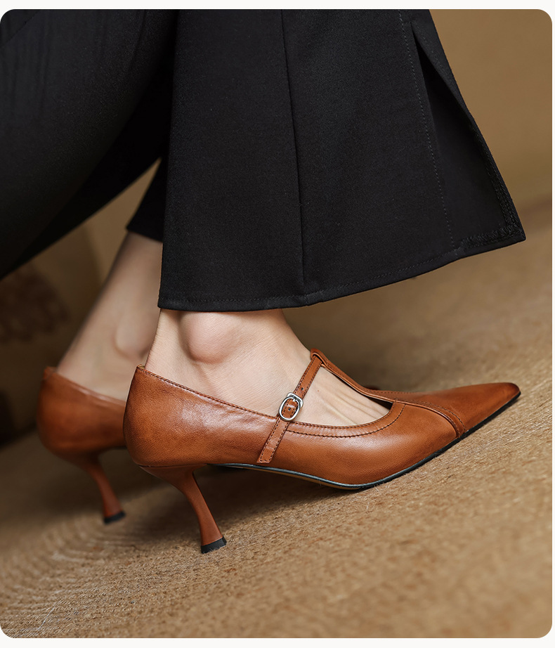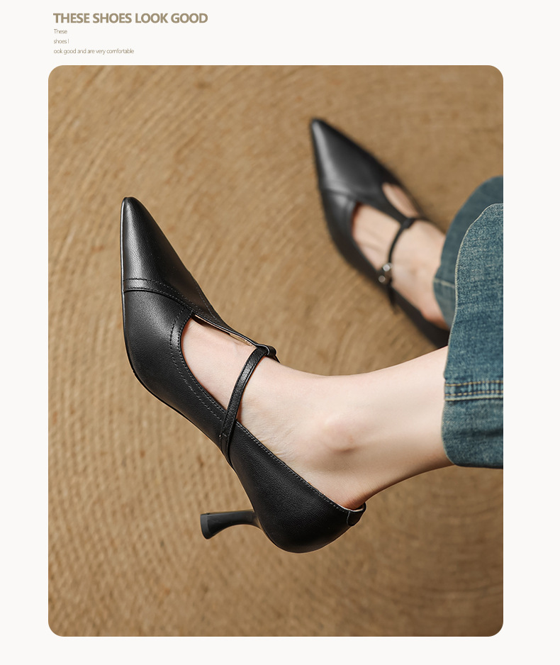 7cm 하이힐 양가죽 뾰족한 발가락 얕은 입 싱글 레이어 신발 2025 새로운 여성 신발 한국 스타일 T 자형 버클 얇은 뒤꿈치 4 시즌 신발스토어 가기