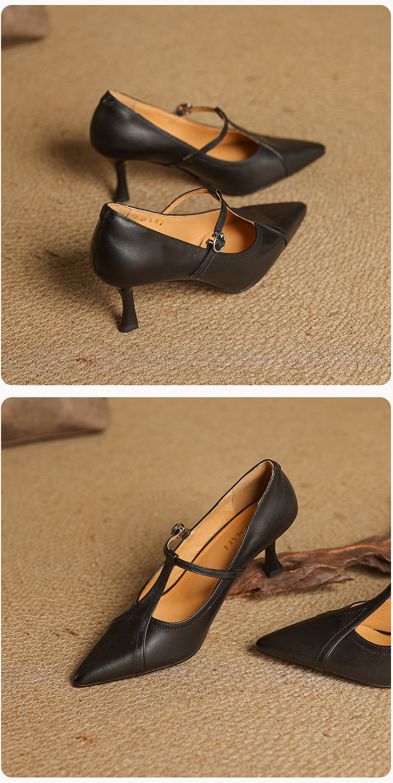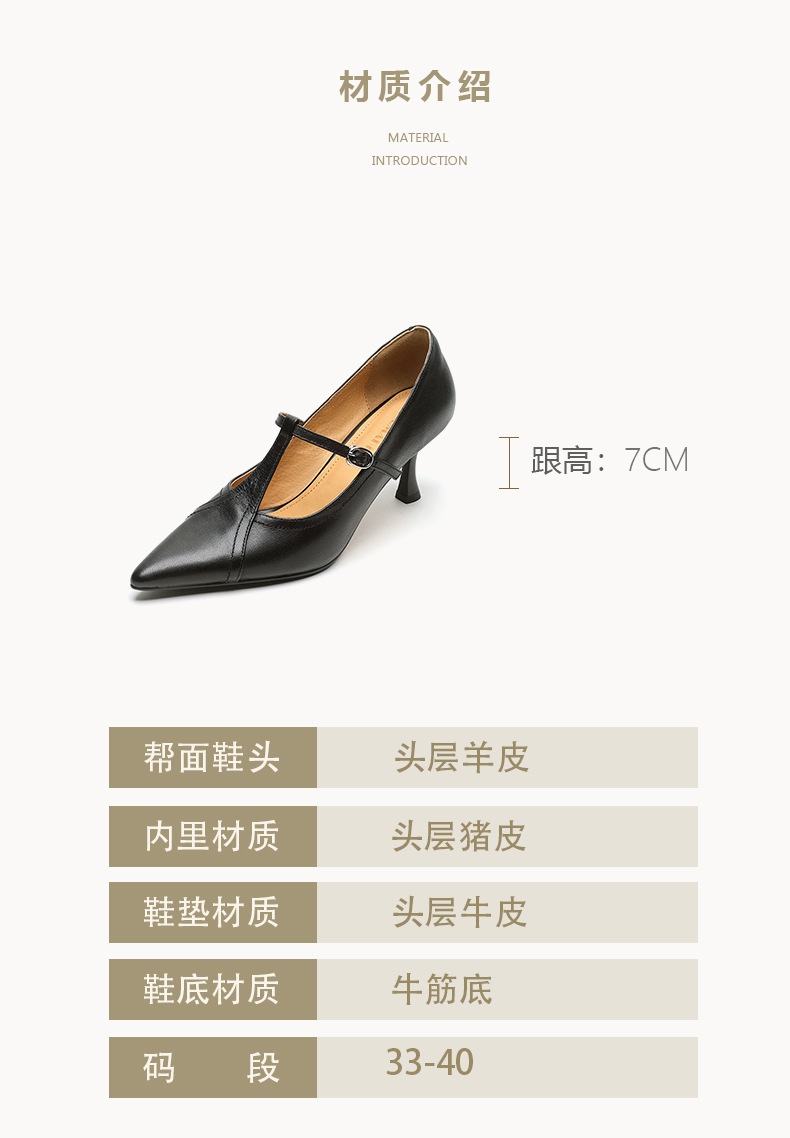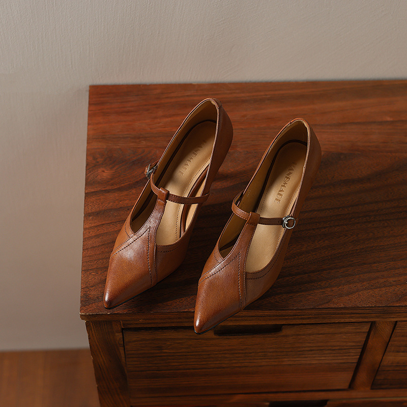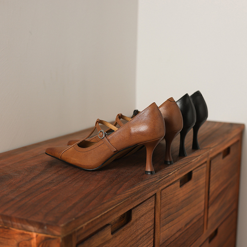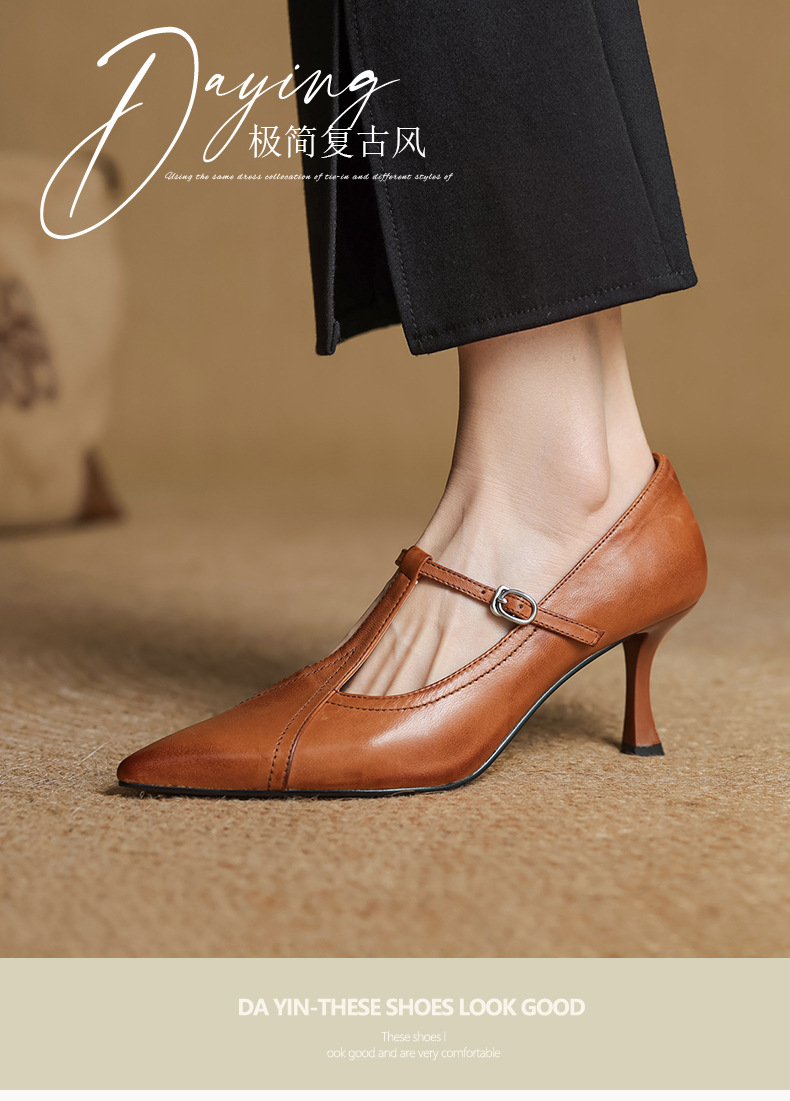 7cm 하이힐 양가죽 뾰족한 발가락 얕은 입 싱글 레이어 신발 2025 새로운 여성 신발 한국 스타일 T 자형 버클 얇은 뒤꿈치 4 시즌 신발스토어 가기