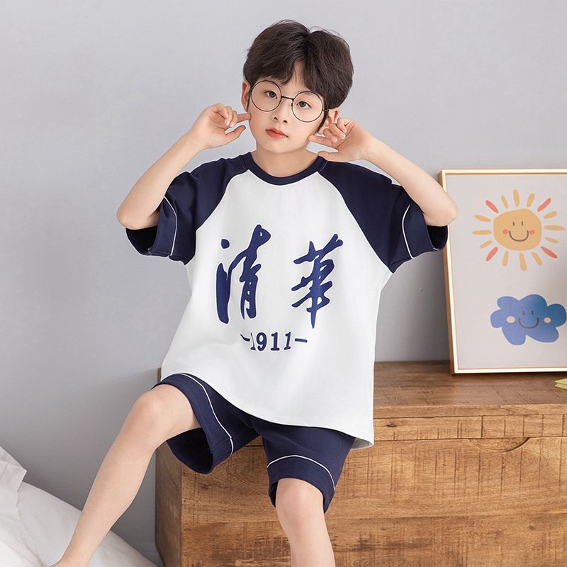 여름 반팔 소년 잠옷 순면 얇은 중대형 어린이 잘 생긴 어린 소년 학생 청소년 가정 의류 세트