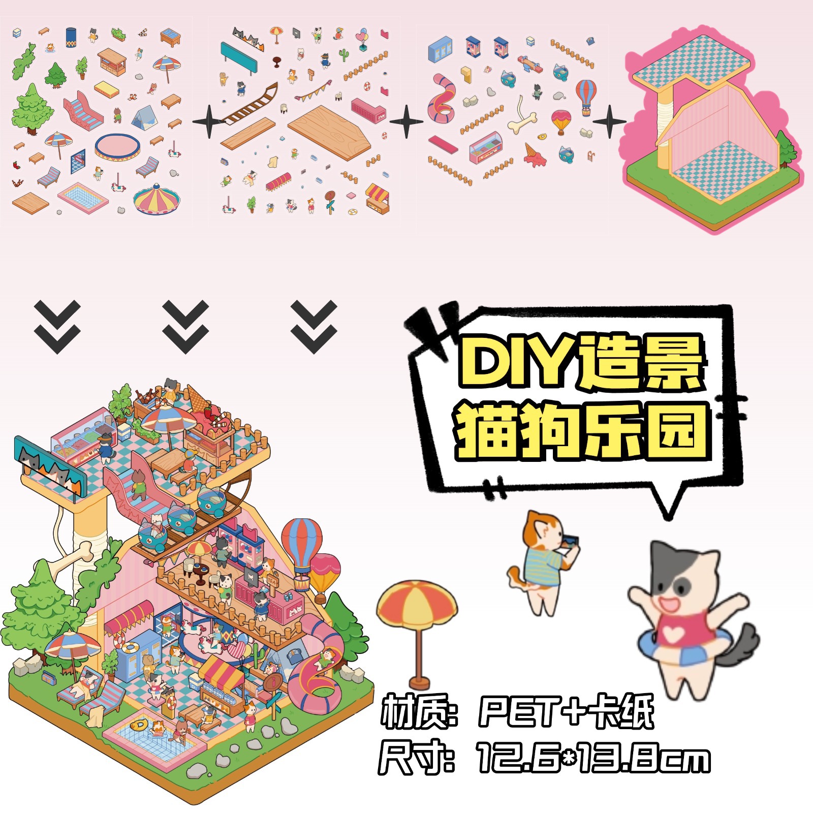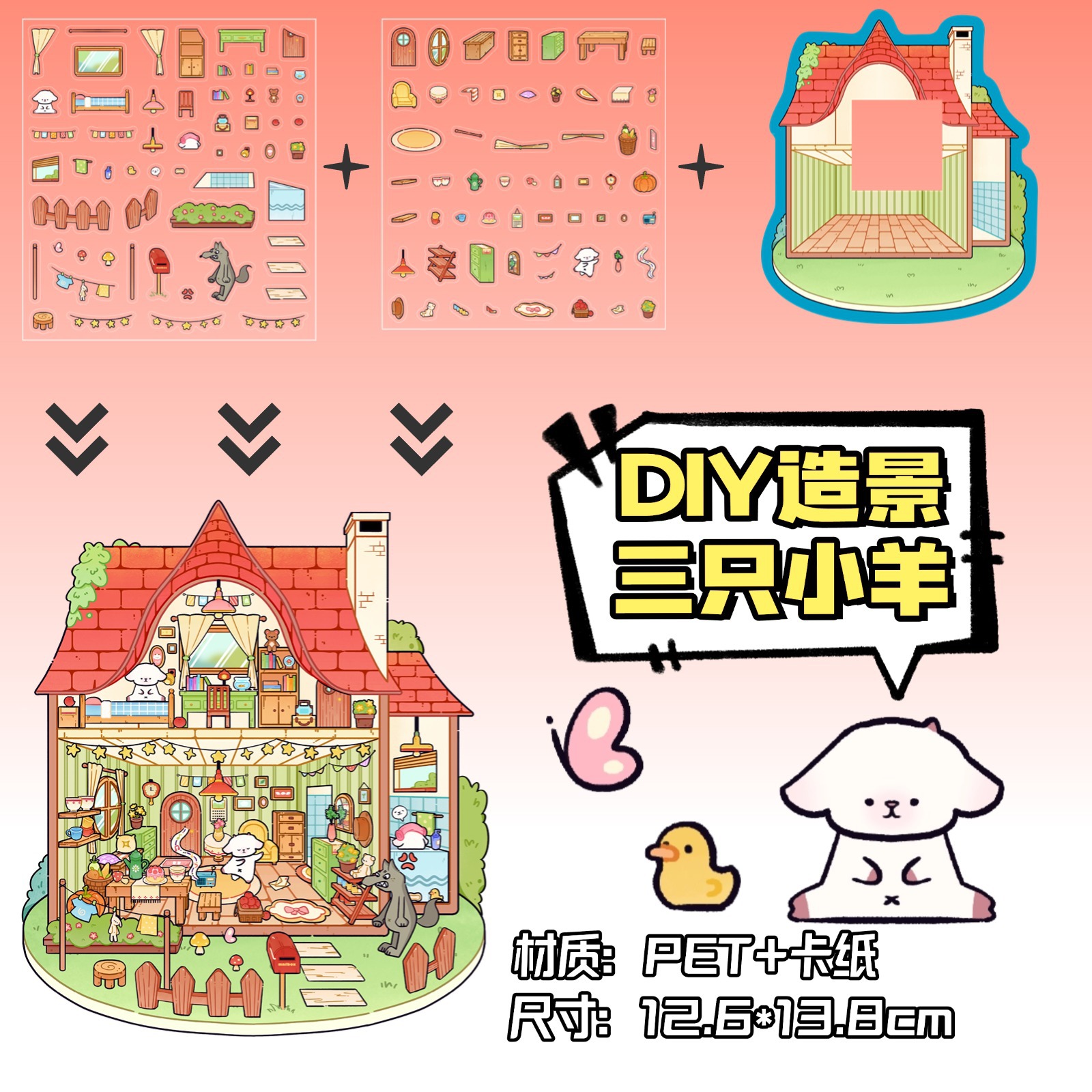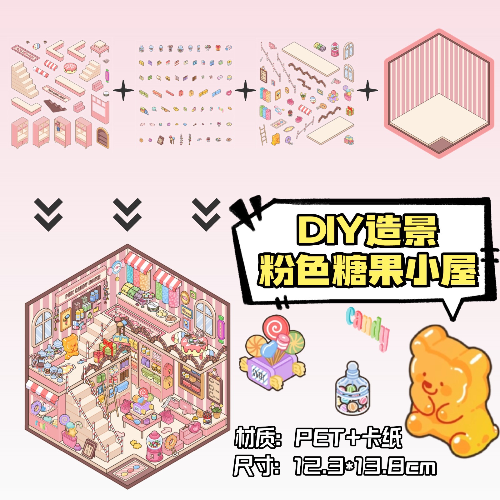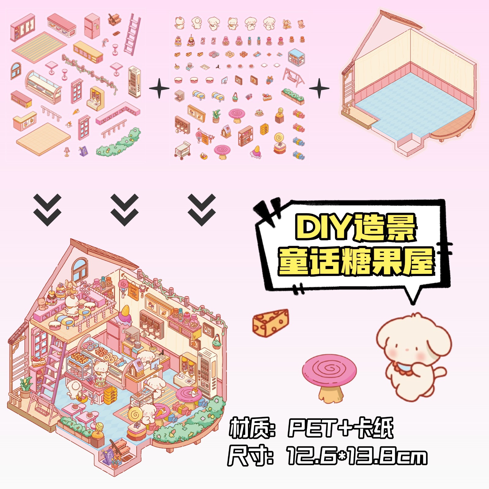 • ZJXL026 핑크 캔디 하우스(PET 스티커 3개 + 장면 카드보드 1개 포함)