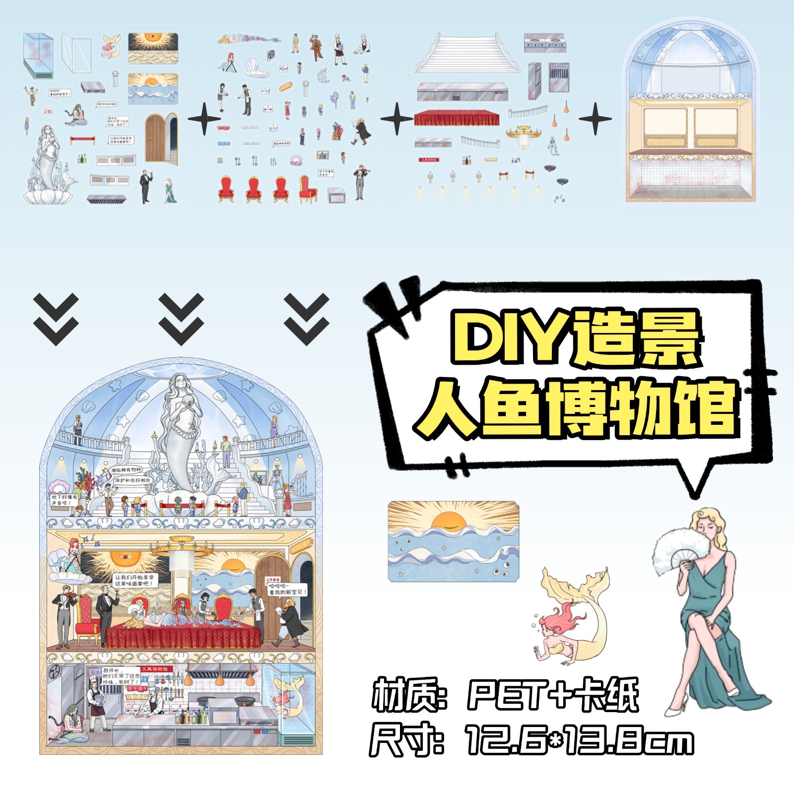 • ZJXL084 인어 박물관 (PET 스티커 3장 + 배경 카드 1장 포함)