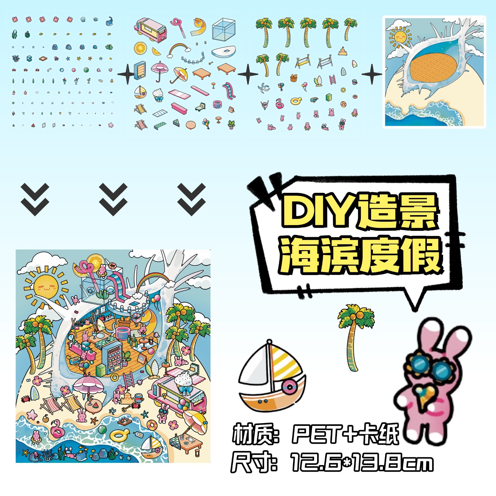 • ZJXL090 해변 휴가 (PET 스티커 3장 + 배경 카드 1장 포함)