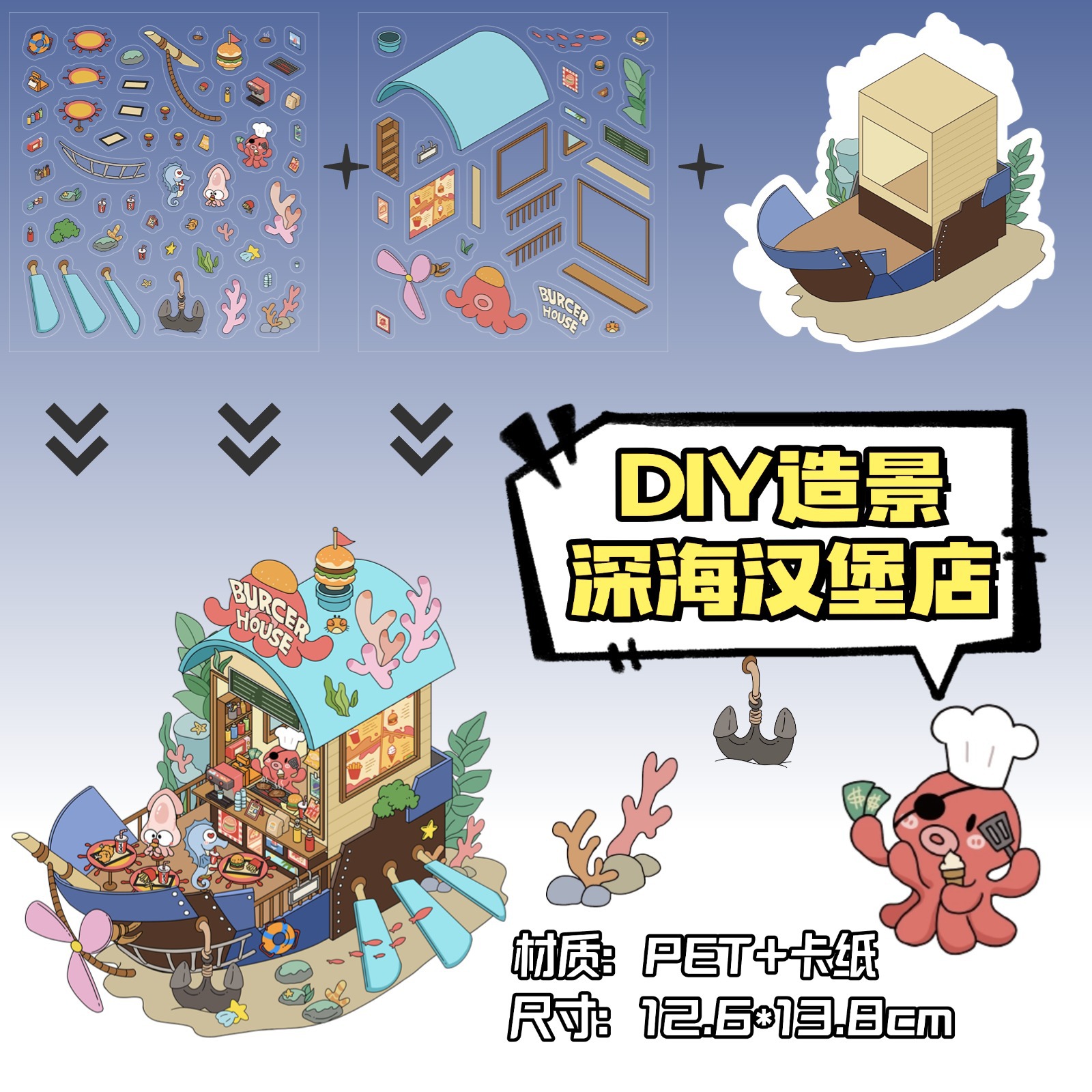 • ZJXL085 심해 햄버거 가게 (PET 스티커 2장 + 배경 카드 1장 포함)