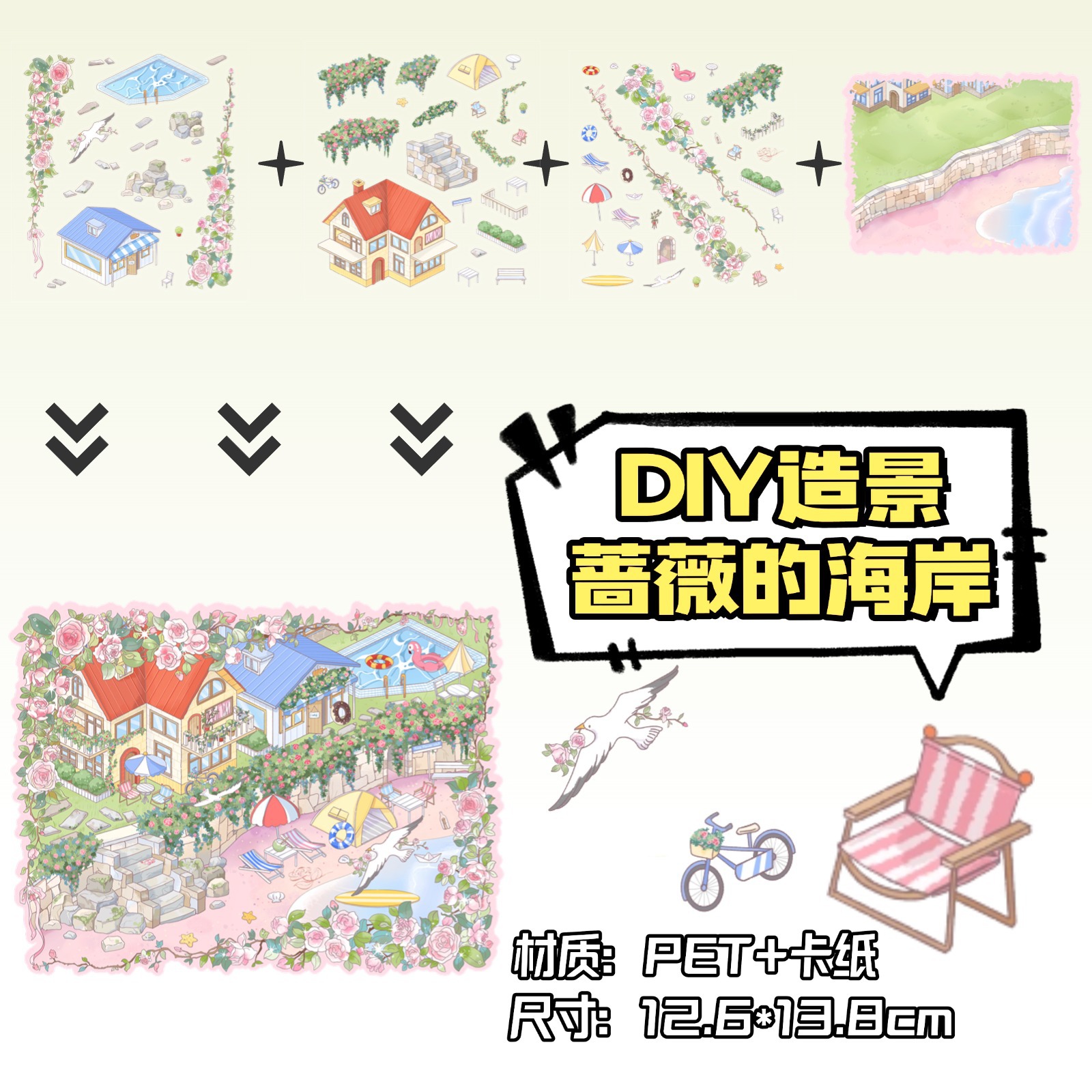 • ZJXL078 장미 해안 (PET 스티커 3장 + 배경 카드 1장 포함)