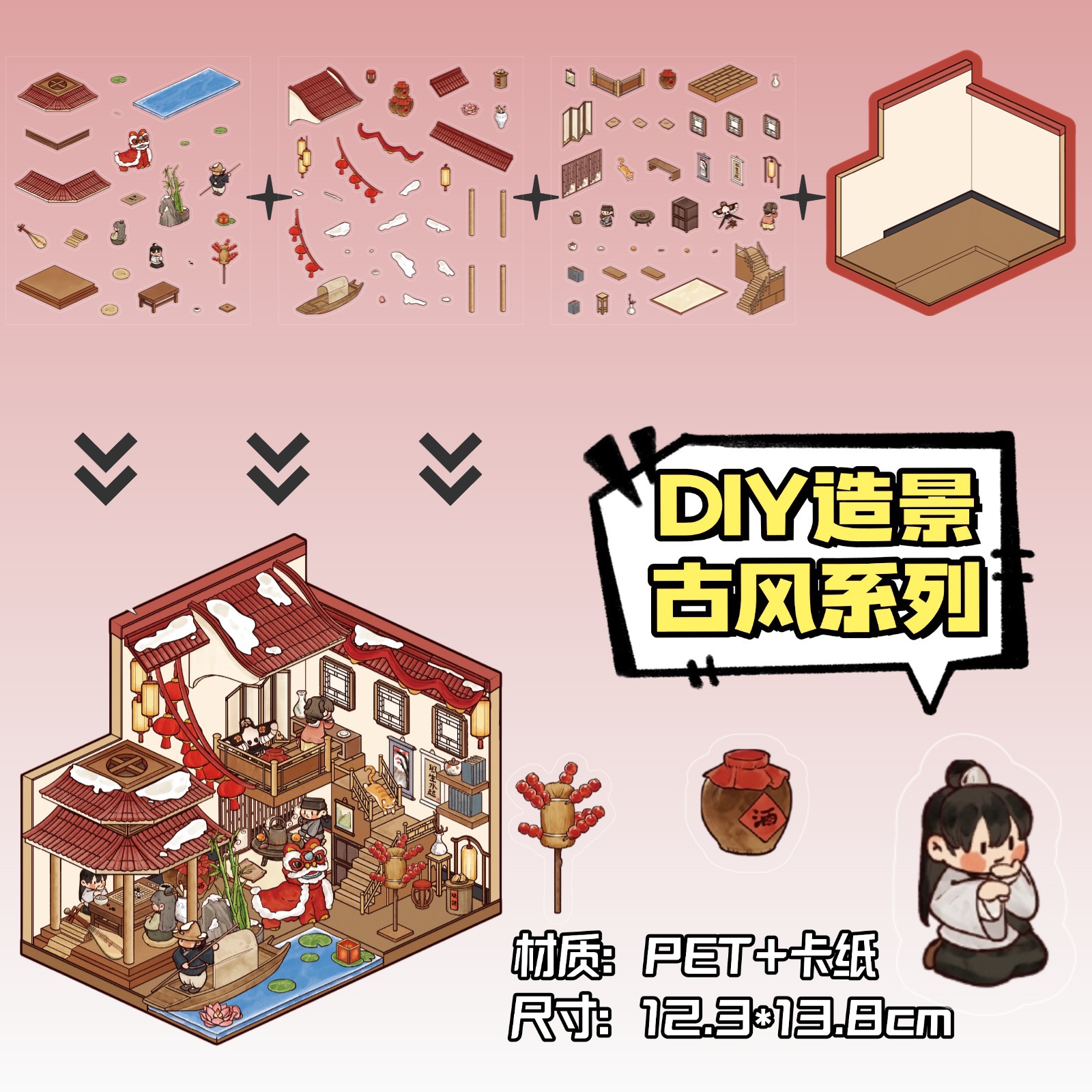 [슈퍼 버라이어티] 미니어처 작은 세계 그물 붉은 저장 조경 스티커 시각적 스택 3 차원 오두막 장면 게임