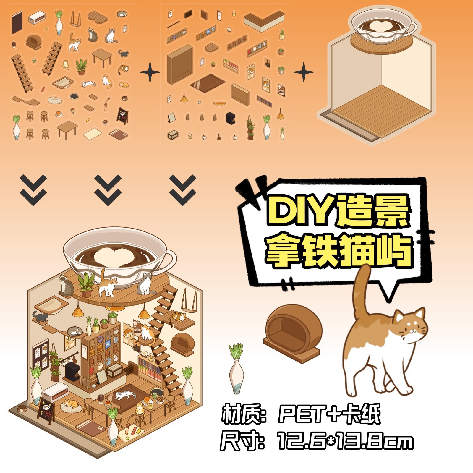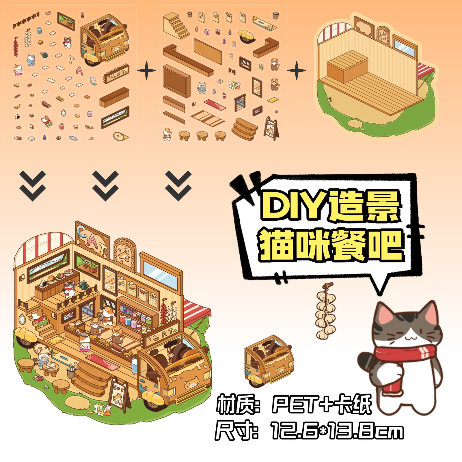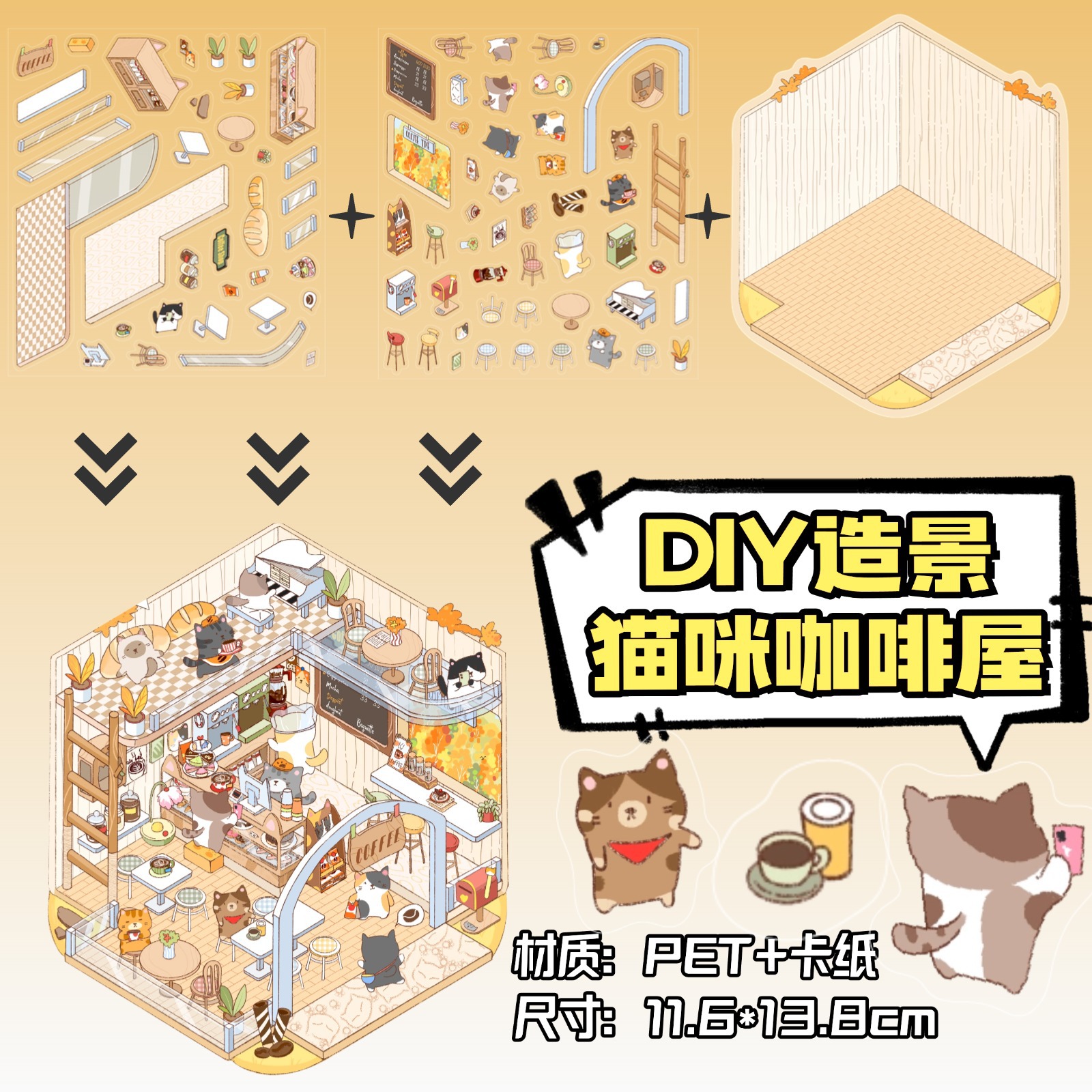 • ZJXL006 고양이 카페 (PET 스티커 2개 + 장면 카드보드 1개 포함)