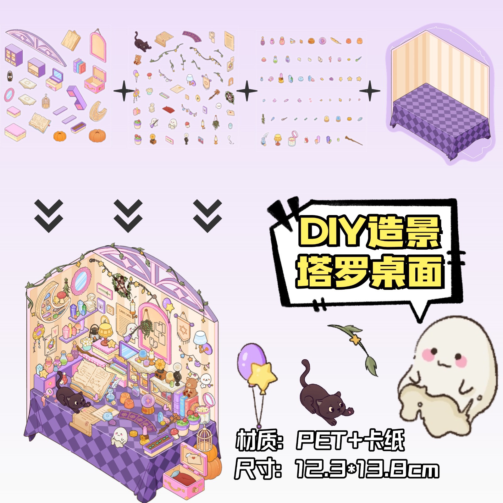 • ZJXL030 타로 데스크탑 (PET 스티커 3장 + 배경 카드 1장 포함)