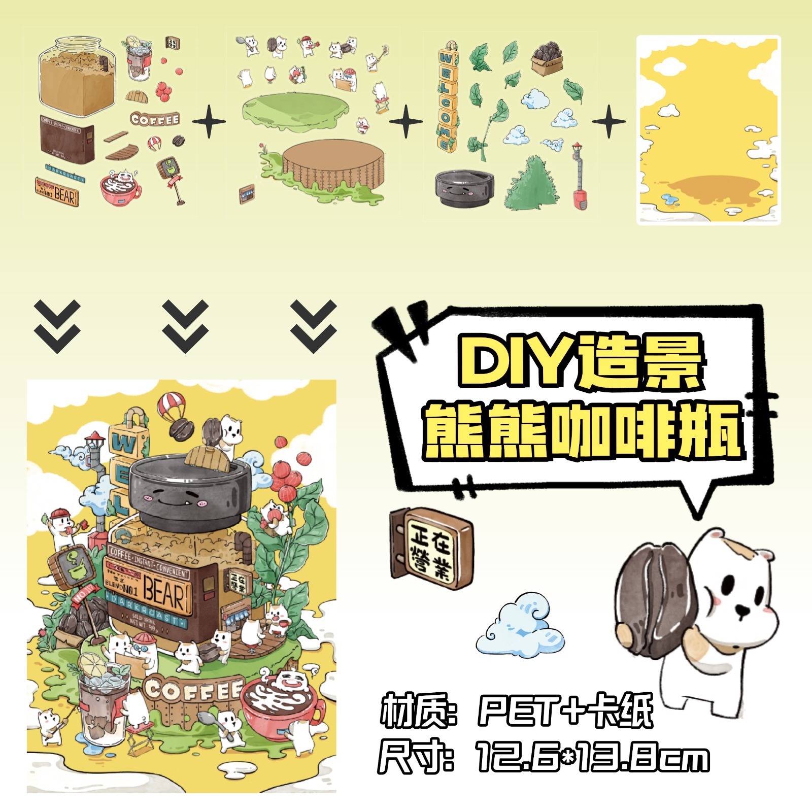 • ZJXL075 곰돌이 커피병 (PET 스티커 3장 + 배경 카드 1장 포함)
