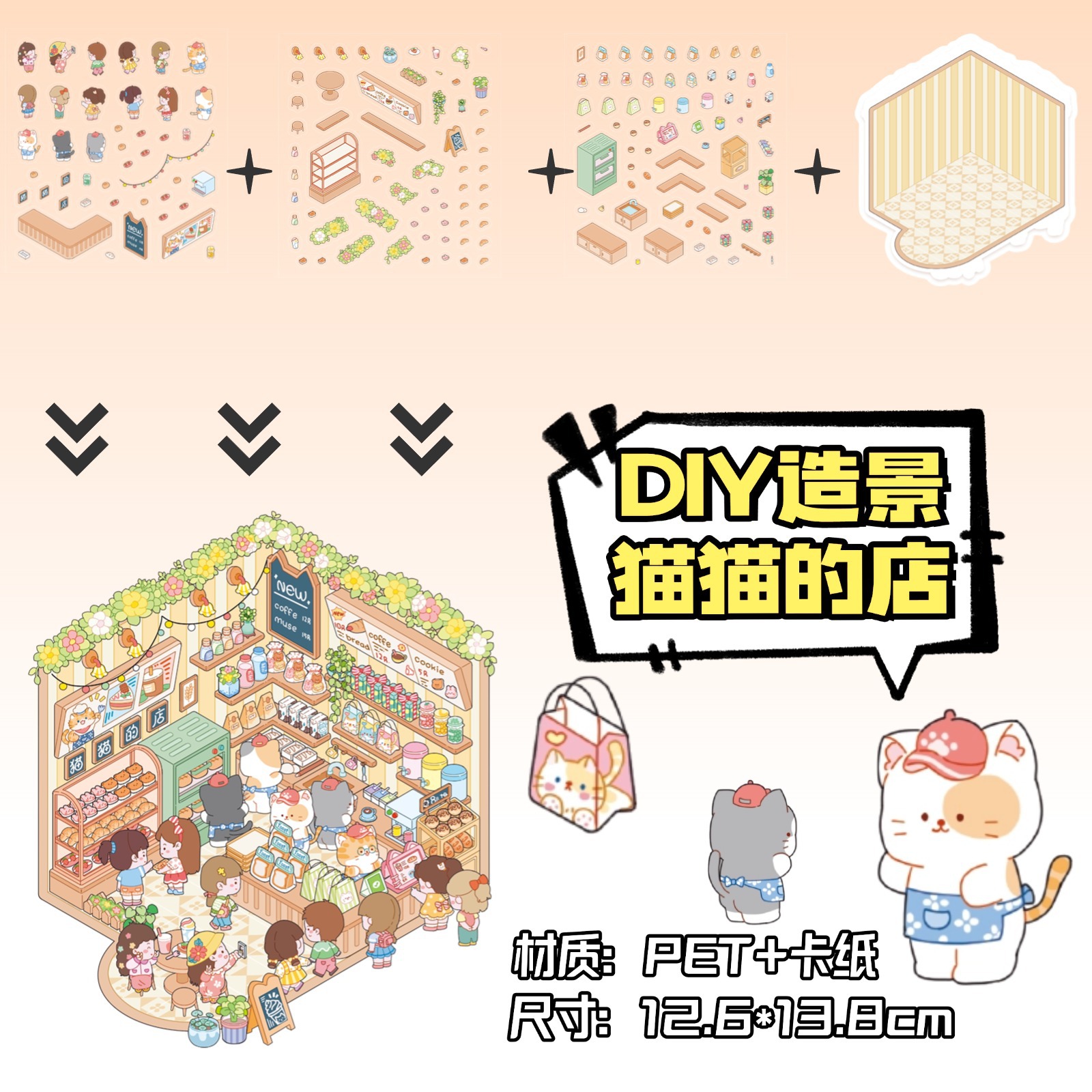 • ZJXL064 고양이 가게 (PET 스티커 3장 + 배경 카드 1장 포함)