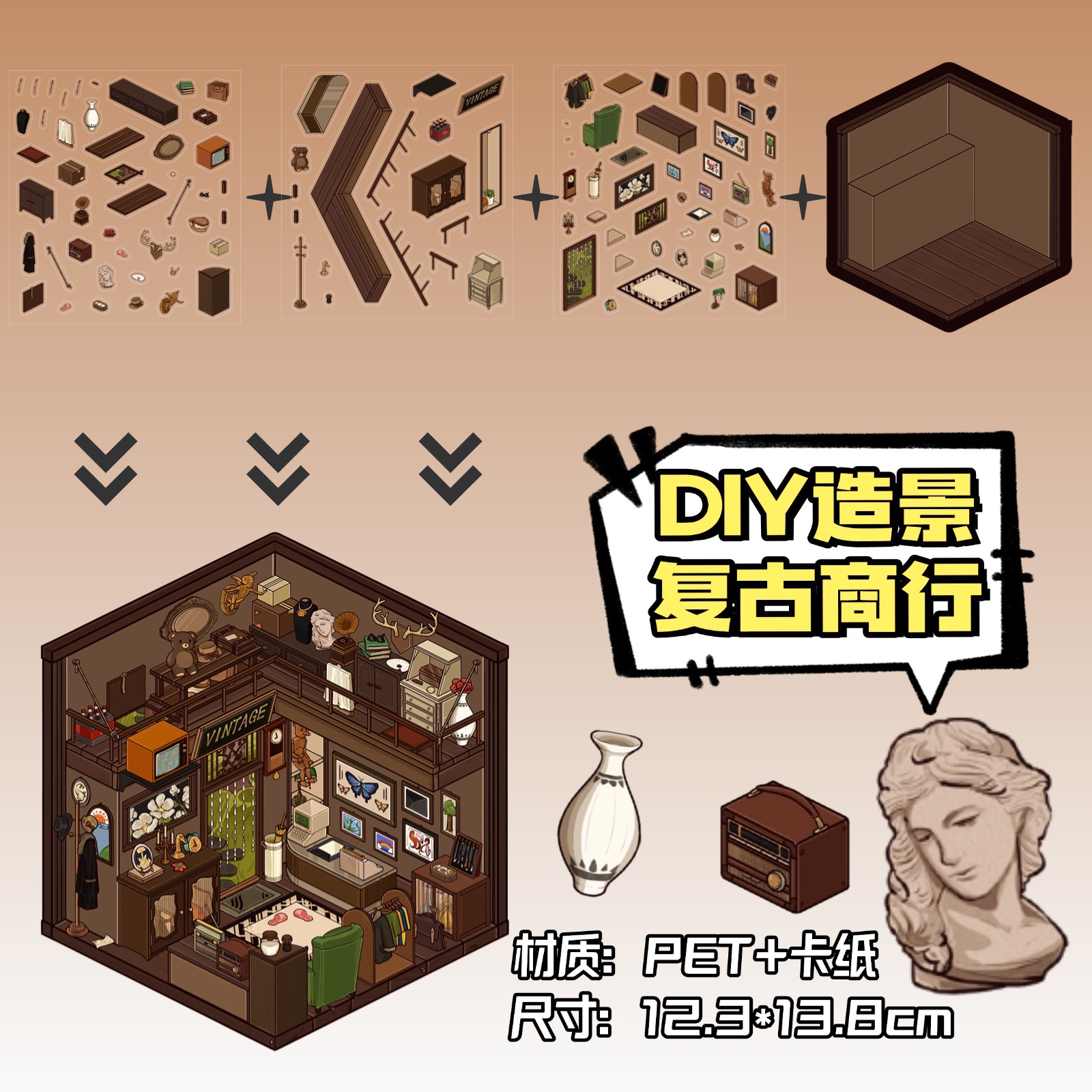 [슈퍼 버라이어티] 미니어처 작은 세계 그물 붉은 저장 조경 스티커 시각적 스택 3 차원 오두막 장면 게임스토어 가기