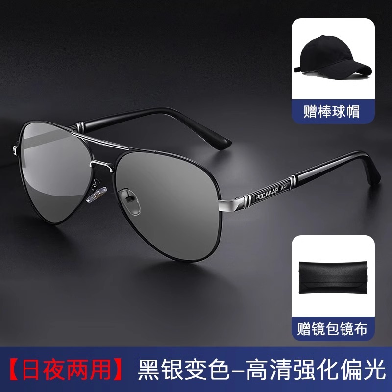 • [편광 눈 보호 및 눈부심 방지 - 주야간 사용] 블랙 프레임 실버 빔 색상 변경 필름 + 야구 모자